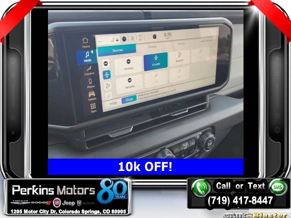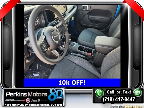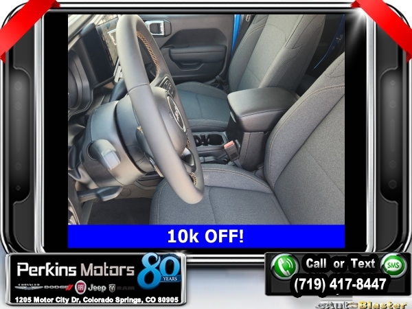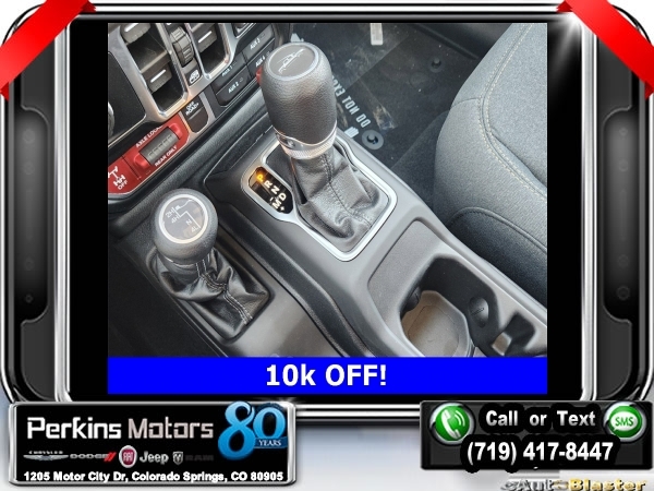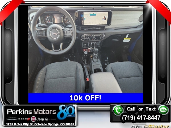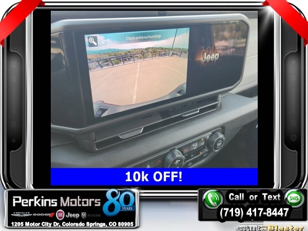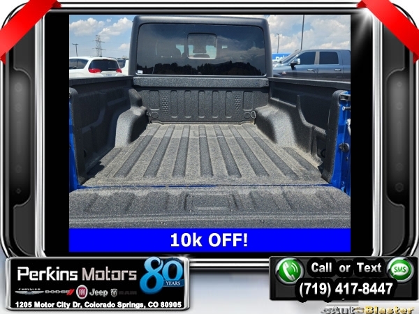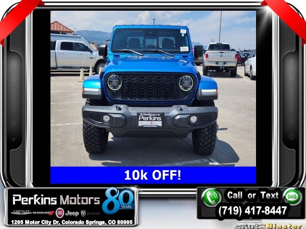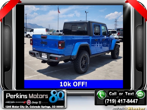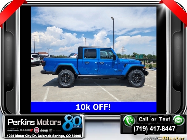 Factory MSRP: $54,230 $10,000 off MSRP! Hydro Blue Pearlcoat 2024 Jeep Gladiator Sport 4WD 8-Speed Automatic 3.6L V6 24V VVT<br><br>Check us out at www.perkinsmotors.com to see our specials! Since opening our doors in 1944, we’ve been proud to serve Colorado Springs, CO, and the surrounding areas of Pueblo, Castle Rock and Denver, CO. Throughout this time of being family owned for 80 years, we’ve maintained a firm commitment to our customers: to offer a wide selection of New Chrysler, Dodge, Fiat, Jeep, and Ram vehicles and quality pre-owned vehicles, and provide a quick, no-hassle car-buying process that ensures everyone drives off the lot satisfied with their purchase.<br><br>Convenience Group (Corning Gorilla Glass and Emergency/Assistance Call), Quick Order Package 24W Willys (240 Amp Alternator, Auxiliary Switches, Body Color Fender Flares (2-Piece), Enhanced Adaptive Cruise Control, Front LED Fog Lamps, Heavy-Duty Engine Cooling, Mold In Color Bumper w/Gloss Black, Power Heated Mirrors, and Premium Wrapped Steering Wheel), 110 MPH Vehicle Max Speed Calibration, 12.3 Touchscreen Display, 3.73 Rear Axle Ratio, 4-Wheel Disc Brakes, 4G LTE Wi-Fi Hot Spot, 8 Speakers, ABS brakes, Air Conditioning, Alexa Built-In, AM/FM radio: SiriusXM with 360L, Apple CarPlay, Apple CarPlay/Android Auto, Black 3-Piece Hard Top, Brake assist, Cloth Low-Back Bucket Seats, Compass, Connectivity - US/Canada, Cruise Control, Delay-off headlights, Disassociated Touchscreen Display, Driver door bin, Driver vanity mirror, Dual front impact airbags, Dual front side impact airbags, Electronic Stability Control, Emergency communication system: Jeep Connect, Front anti-roll bar, Front Bucket Seats, Front Center Armrest w/Storage, Front fog lights, Front License Plate Bracket, Front reading lights, Google Android Auto, Integrated Center Stack Radio, Integrated roll-over protection, Low tire pressure warning, Manufacturer's Statement of Origin, Manufacturer's Statement of Origin (DISC), MOPAR Spray In Bedliner, Normal Duty Suspension, Occupant sensing airbag, Outside temperature display, Overhead airbag, ParkView Rear Back-Up Camera, Passenger door bin, Passenger vanity mirror, Power steering, Radio data system, Radio: Uconnect 5 w/12.3 Display, Rear anti-roll bar, Rear reading lights, SiriusXM Radio Service, SiriusXM w/360L, Split folding rear seat, Steering wheel mounted audio controls, Tachometer, Telescoping steering wheel, Tilt steering wheel, Traction control, Trip computer, USB Host Flip, Variably intermittent wipers, Voltmeter, and Wheels: 17 x 7.5 Black Steel Styled. Sale price includes all manufacture's incentives and dealer discounts. Sale price not available on lease or compatible with special APR. $3250 - 2024 Bonus Cash . Exp. 09/03/2024 $2,000 - Exp. 09/30/2024