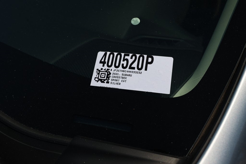 Ice Silver Metallic 2021 Subaru Crosstrek Sport AWD Lineartronic CVT 2.5L DOHC 6 Speakers, Aero Crossbar Set, Air Conditioning, Auto-Dimming Exterior Mirror w/Approach Light, Auto-Dimming Mirror w/Compass & HomeLink, Brake assist, Electronic Stability Control, Exterior Parking Camera Rear, Front Bucket Seats, Front fog lights, Fully automatic headlights, Heated Front Bucket Seats, Map & Dome Lights LED Upgrade, Panic alarm, Popular Package #3, Radio: Subaru STARLINK 6.5" Multimedia Plus System, Rear Bumper Cover, Security system, Speed control, Spoiler, Standard Model, StarTex Upholstery, Subaru STARLINK Smartphone Integration, Wheels: 17" Alloy Dark Gray Finish Sport Type.Odometer is 11002 miles below market average! 27/34 City/Highway MPGAwards: * ALG Residual Value Awards, Residual Value Awards