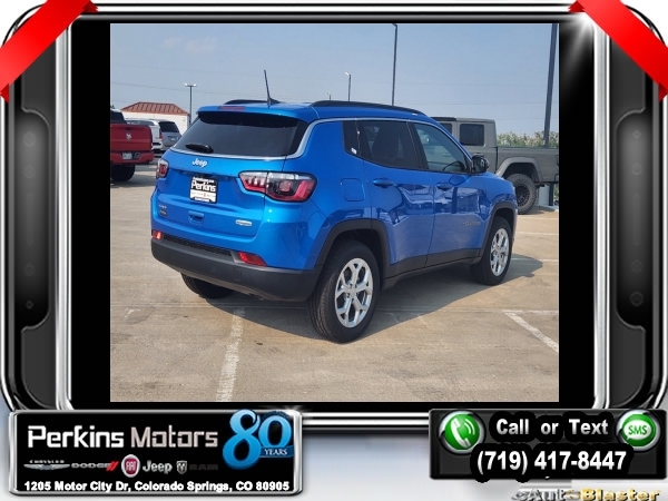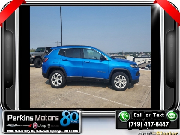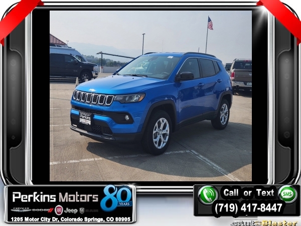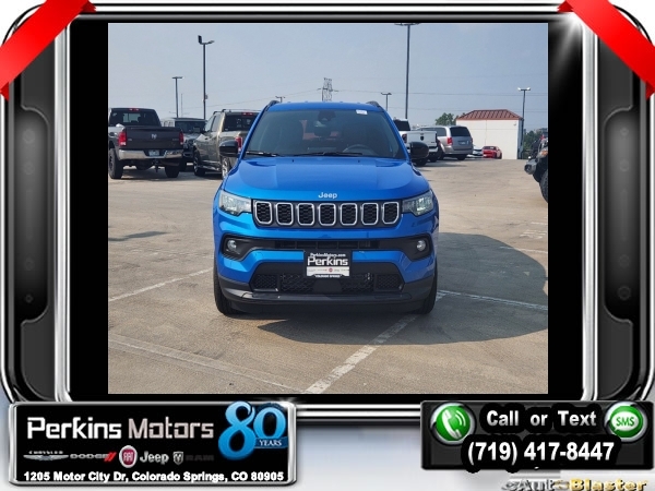 Factory MSRP: $35,035 $6,000 off MSRP! Priced below KBB Fair Purchase Price! Hydro Blue Pearlcoat 2024 Jeep Compass Latitude 4WD 8-Speed Automatic 2.0L I4 DOHC<br>4WD.<br>Check us out at www.perkinsmotors.com to see our specials! Since opening our doors in 1944, we’ve been proud to serve Colorado Springs, CO, and the surrounding areas of Pueblo, Castle Rock and Denver, CO. Throughout this time of being family owned for 80 years, we’ve maintained a firm commitment to our customers: to offer a wide selection of New Chrysler, Dodge, Fiat, Jeep, and Ram vehicles and quality pre-owned vehicles, and provide a quick, no-hassle car-buying process that ensures everyone drives off the lot satisfied with their purchase.<br><br>Convenience Group (Air Conditioning ATC w/Dual Zone Control, Auto-Dimming Rear-View Mirror, Heated Front Seats, Humidity Sensor, Power 2-Way Driver Lumbar Adjust, Reversible Carpet/Vinyl Cargo Mat, and Windshield Wiper De-Icer), Quick Order Package 29J Latitude, 4WD, 17 x 7 Aluminum Wheels, 3.73 Final Drive Ratio, 4-Wheel Disc Brakes, 6 Speakers, ABS brakes, Air Conditioning, Alloy wheels, AM/FM radio: SiriusXM, Auto High-beam Headlights, Brake assist, Bumpers: body-color, Compass, Cruise Control, Delay-off headlights, Driver door bin, Driver vanity mirror, Dual front impact airbags, Dual front side impact airbags, Electronic Stability Control, Emergency communication system: Jeep Connect, Four wheel independent suspension, Front anti-roll bar, Front Bucket Seats, Front Center Armrest w/Storage, Front fog lights, Front License Plate Bracket, Front reading lights, Fully automatic headlights, Heated door mirrors, Illuminated entry, Knee airbag, Leather Shift Knob, Leather steering wheel, Low tire pressure warning, Occupant sensing airbag, Outside temperature display, Overhead airbag, Overhead console, Panic alarm, ParkView Rear Back-Up Camera, Passenger door bin, Passenger vanity mirror, Power door mirrors, Power steering, Power windows, Premium Cloth/Vinyl Bucket Seats, Radio: Uconnect 5 w/10.1 Display, Rear anti-roll bar, Rear seat center armrest, Rear window defroster, Rear window wiper, Remote keyless entry, Roof rack: rails only, Security system, Split folding rear seat, Spoiler, Steering wheel mounted audio controls, Tachometer, Telescoping steering wheel, Tilt steering wheel, Traction control, Trip computer, and Variably intermittent wipers.<br><br>24/32 City/Highway MPG Sale price includes all manufacture's incentives and dealer discounts. Sale price not available on lease or compatible with special APR. $1500 - 2024 National Start Something New Retail Bonus Cash . Exp. 02/03/2025 $2500 - 2024 Retail Bonus Cash. Exp. 02/03/2025 $500 - 2024 National Retail Consumer Cash . Exp. 02/03/2025