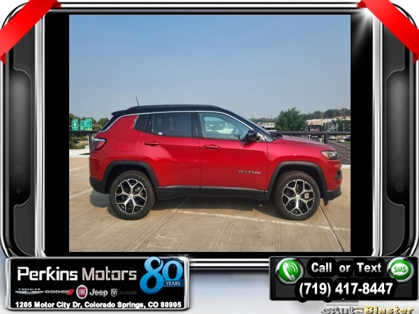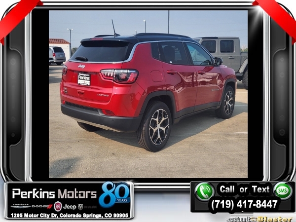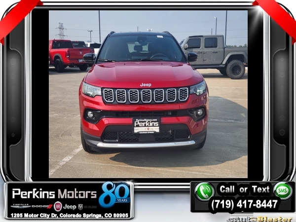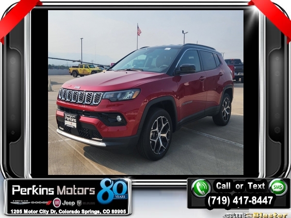 Red Hot Pearlcoat 4WD 2.0L I4 DOHC 8-Speed Automatic<br><br>4WD.<br><br><br>Clean CARFAX.<br><br>Check us out at www.perkinsmotors.com to see our specials! Since opening our doors in 1944, we’ve been proud to serve Colorado Springs, CO, and the surrounding areas of Pueblo, Castle Rock and Denver, CO. Throughout this time of being family owned for 80 years, we’ve maintained a firm commitment to our customers: to offer a wide selection of New Chrysler, Dodge, Fiat, Jeep, and Ram vehicles and quality pre-owned vehicles, and provide a quick, no-hassle car-buying process that ensures everyone drives off the lot satisfied with their purchase.<br><br><br>Quick Order Package 29G Limited, 4WD, 10.1 Touchscreen Display, 3.73 Final Drive Ratio, 4-Wheel Disc Brakes, 4G LTE Wi-Fi Hot Spot, 6 Speakers, ABS brakes, Air Conditioning, Alloy wheels, AM/FM radio: SiriusXM, Auto High-beam Headlights, Auto-dimming Rear-View mirror, Automatic temperature control, Brake assist, Bumpers: body-color, Compass, Cruise Control, Delay-off headlights, Disassociated Touchscreen Display, Driver door bin, Driver vanity mirror, Dual front impact airbags, Dual front side impact airbags, Electronic Stability Control, Emergency communication system: Jeep Connect, For Details, Visit DriveUconnect.com, For More Info, Call 800-643-2112, Four wheel independent suspension, Front anti-roll bar, Front Bucket Seats, Front Center Armrest w/Storage, Front dual zone A/C, Front fog lights, Front License Plate Bracket, Front reading lights, Fully automatic headlights, Global Telematics Box Module (TBM), Heated door mirrors, Heated front seats, Heated steering wheel, Illuminated entry, Knee airbag, Leather Shift Knob, Leather steering wheel, Leatherette Seats, Low tire pressure warning, Occupant sensing airbag, Outside temperature display, Overhead airbag, Overhead console, Panic alarm, ParkView Rear Back-Up Camera, Passenger door bin, Passenger vanity mirror, Power door mirrors, Power driver seat, Power steering, Power windows, Radio: Uconnect 5 w/10.1 Display, Rain sensing wipers, Rear anti-roll bar, Rear seat center armrest, Rear window defroster, Rear window wiper, Remote keyless entry, Roof rack: rails only, Security system, SiriusXM Guardian - Included Trial (B), SiriusXM Radio Service, Split folding rear seat, Spoiler, Steering wheel mounted audio controls, Tachometer, Telescoping steering wheel, Tilt steering wheel, Traction control, Trip computer, Turn signal indicator mirrors, Variably intermittent wipers, and Wheels: 18 x 7 Painted Diamond Cut AluminuM.