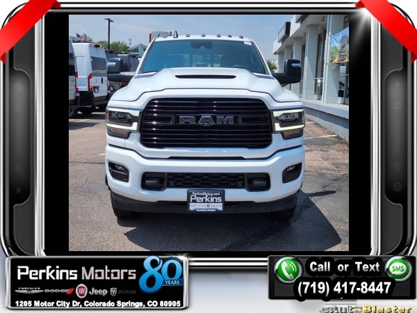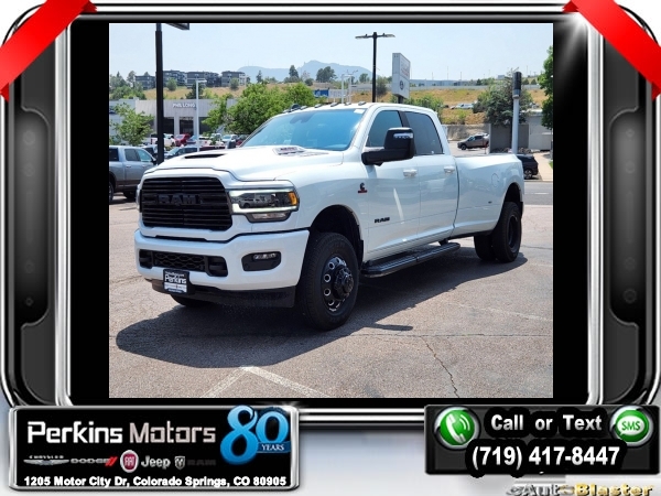 Factory MSRP: $94,895 $11,000 off MSRP! Bright White Clearcoat 2024 Ram 3500 Laramie 4WD 6-Speed Automatic I6<br><br>Check us out at www.perkinsmotors.com to see our specials! Since opening our doors in 1944, we’ve been proud to serve Colorado Springs, CO, and the surrounding areas of Pueblo, Castle Rock and Denver, CO. Throughout this time of being family owned for 80 years, we’ve maintained a firm commitment to our customers: to offer a wide selection of New Chrysler, Dodge, Fiat, Jeep, and Ram vehicles and quality pre-owned vehicles, and provide a quick, no-hassle car-buying process that ensures everyone drives off the lot satisfied with their purchase.<br><br>Bed Utility Group (LED Bed Lighting and MOPAR Spray In Bedliner), Cold Weather Group (Engine Block Heater and MOPAR Winter Front Grille Cover), Heavy Duty Snow Plow Prep Group, Laramie Level 1 Equipment Group (2nd Row In Floor Storage Bins, 4G LTE Wi-Fi Hot Spot, Alexa Built-In, Apple CarPlay, Auto-Dimming Exterior Mirrors, Blind Spot & Cross Path Detection, Center Hub, Connected Travel & Traffic Services, Connectivity - US/Canada, Disassociated Touchscreen Display, Exterior Mirrors Courtesy Lamps, Exterior Mirrors w/Heating Element, Exterior Mirrors w/Supplemental Signals, For Details Visit DriveUconnect.com, For More Info, Call 800-643-2112, Global Telematics Box Module (TBM), Google Android Auto, GPS Antenna Input, GPS Navigation, HD Radio, Integrated Voice Command w/Bluetooth, Off-Road Information Pages, Power Adjust Mirrors, Power-Adjustable Convex Aux Mirrors, Radio: Uconnect 5 Nav w/12.0 Display, Remote Tailgate Release, Selectable Tire Fill Alert, SiriusXM Radio Service, SiriusXM w/360L, and Trailer Tow Pages), Night Edition (Black RAM Head Tailgate Badge and Gloss Black Grille Billets/Accents), Protection Group, Quick Order Package 21H Laramie, Safety Group (Adaptive Cruise Control w/Stop, Adaptive Steering System, and Lane Keep Assist), Towing Technology Group (CTR Stop Lamp w/Cargo View Camera and Trailer Reverse Guidance), 10 Speakers, 115V Auxiliary Rear Power Outlet, 2 Way Rear Headrest Seat, 220 Amp Alternator, 3.73 Axle Ratio, 4 Way Front Headrests, 4-Wheel Disc Brakes, 4.10 Axle Ratio, 50 Gallon Fuel Tank, 5th Wheel/Gooseneck Towing Prep Group, 6000# Front Axle w/Hub Ext, 8.4 Touchscreen Display, ABS brakes, Active Noise Control System, Air Conditioning, Alloy wheels, AM/FM radio: SiriusXM with 360L, Apple CarPlay/Android Auto, Auto Level Rear Air Suspension, Auto-dimming Rear-View mirror, Automatic temperature control, Box & Rear Fender Clearance Lamps, Brake assist, Bumpers: body-color, Clearance Lamps, Compass, Cruise Control, Delay-off headlights, Driver door bin, Driver vanity mirror, Dual front impact airbags, Dual front side impact airbags, Dual Rear Wheels, Electronic Stability Control, Electronically Controlled Throttle, Folding Flat Load Floor Storage, Front anti-roll bar, Front Center Armrest w/Storage, Front dual zone A/C, Front License Plate Bracket, Front reading lights, Front Seat Back Map Pockets, Fully automatic headlights, Garage door transmitter, Heated door mirrors, Heated Front Seats, Heated front seats, Heated Steering Wheel, Heated steering wheel, High Back Seats, I/P Mounted Auxiliary Switches, Illuminated entry, Integrated Center Stack Radio, Leather steering wheel, Leather Trim 40/20/40 Bench Seat, Low tire pressure warning, Manufacturer's Statement of Origin, MOPAR Front & Rear Rubber Floor Mats, Occupant sensing airbag, Outside temperature display, Overhead airbag, Overhead console, Painted Flat Cab-Length Side Steps, Panic alarm, ParkView Rear Back-Up Camera, Passenger door bin, Passenger vanity mirror, Power 8-Way Adjustable Passenger Seat, Power Adjust 8-Way Driver Seat, Power door mirrors, Power driver seat, Power passenger seat, Power steerin Sale price includes all manufacture's incentives and dealer discounts. Sale price not available on lease or compatible with special APR. $1000 - 2024 Bonus Cash . Exp. 0