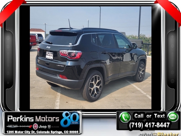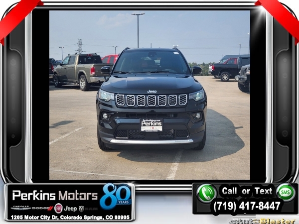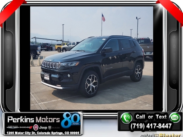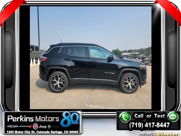 New Price! Factory MSRP: $35,935 $5,500 off MSRP! Priced below KBB Fair Purchase Price! Diamond Black Crystal Pearlcoat 2024 Jeep Compass Limited 4WD 8-Speed Automatic 2.0L I4 DOHC<br>4WD.<br>Check us out at www.perkinsmotors.com to see our specials! Since opening our doors in 1944, we’ve been proud to serve Colorado Springs, CO, and the surrounding areas of Pueblo, Castle Rock and Denver, CO. Throughout this time of being family owned for 80 years, we’ve maintained a firm commitment to our customers: to offer a wide selection of New Chrysler, Dodge, Fiat, Jeep, and Ram vehicles and quality pre-owned vehicles, and provide a quick, no-hassle car-buying process that ensures everyone drives off the lot satisfied with their purchase.<br><br>Quick Order Package 29G Limited, 4WD, 10.1 Touchscreen Display, 3.73 Final Drive Ratio, 4-Wheel Disc Brakes, 4G LTE Wi-Fi Hot Spot, 6 Speakers, ABS brakes, Air Conditioning, Alloy wheels, AM/FM radio: SiriusXM, Auto High-beam Headlights, Auto-dimming Rear-View mirror, Automatic temperature control, Brake assist, Bumpers: body-color, Compass, Cruise Control, Delay-off headlights, Disassociated Touchscreen Display, Driver door bin, Driver vanity mirror, Dual front impact airbags, Dual front side impact airbags, Electronic Stability Control, Emergency communication system: Jeep Connect, For Details, Visit DriveUconnect.com, For More Info, Call 800-643-2112, Four wheel independent suspension, Front anti-roll bar, Front Bucket Seats, Front Center Armrest w/Storage, Front dual zone A/C, Front fog lights, Front License Plate Bracket, Front reading lights, Fully automatic headlights, Global Telematics Box Module (TBM), Heated door mirrors, Heated front seats, Heated steering wheel, Illuminated entry, Knee airbag, Leather Shift Knob, Leather steering wheel, Leatherette Seats, Low tire pressure warning, Occupant sensing airbag, Outside temperature display, Overhead airbag, Overhead console, Panic alarm, ParkView Rear Back-Up Camera, Passenger door bin, Passenger vanity mirror, Power door mirrors, Power driver seat, Power steering, Power windows, Radio: Uconnect 5 w/10.1 Display, Rain sensing wipers, Rear anti-roll bar, Rear seat center armrest, Rear window defroster, Rear window wiper, Remote keyless entry, Roof rack: rails only, Security system, SiriusXM Guardian - Included Trial (B), SiriusXM Radio Service, Split folding rear seat, Spoiler, Steering wheel mounted audio controls, Tachometer, Telescoping steering wheel, Tilt steering wheel, Traction control, Trip computer, Turn signal indicator mirrors, Variably intermittent wipers, and Wheels: 18 x 7 Painted Diamond Cut AluminuM.<br><br>24/32 City/Highway MPG Sale price includes all manufacture's incentives and dealer discounts. Sale price not available on lease or compatible with special APR. $2000 - 2024 Retail Bonus Cash. Exp. 12/02/2024 $500 - 2024 National Retail Consumer Cash . Exp. 12/02/2024