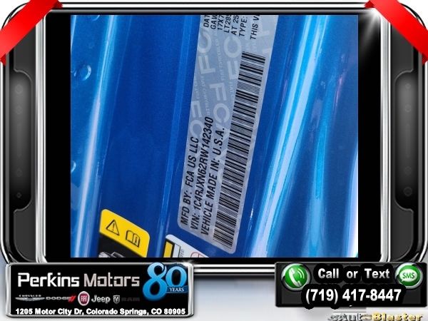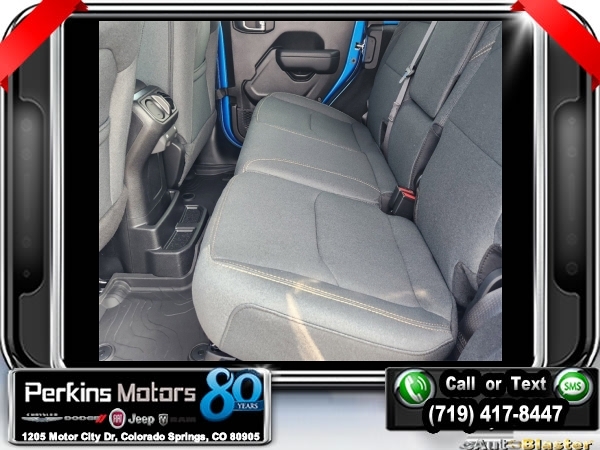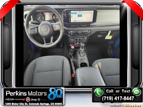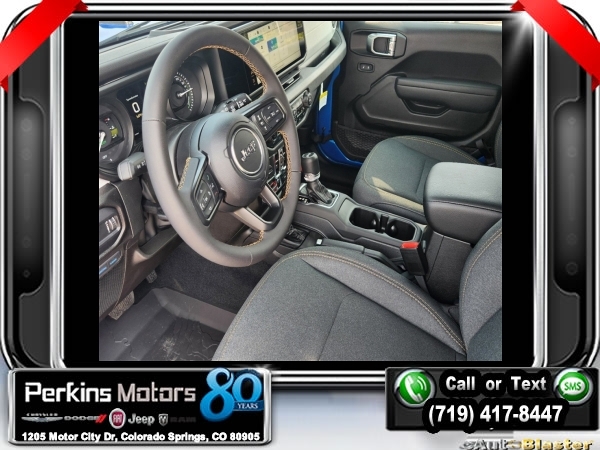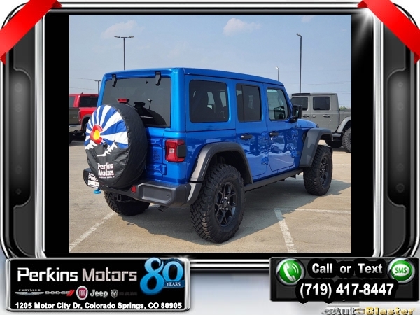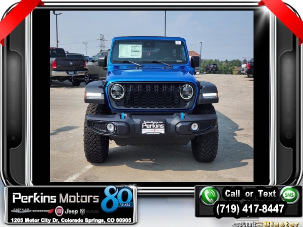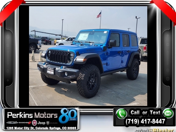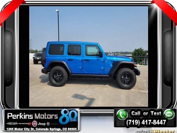 Factory MSRP: $65,310 $11,250 off MSRP! Priced below KBB Fair Purchase Price! Hydro Blue Pearl Coat 2024 Jeep Wrangler Willys 4xe 4WD 8-Speed Automatic 2.0L I4 DOHC<br>2.0L I4 DOHC.<br>Check us out at www.perkinsmotors.com to see our specials! Since opening our doors in 1944, we’ve been proud to serve Colorado Springs, CO, and the surrounding areas of Pueblo, Castle Rock and Denver, CO. Throughout this time of being family owned for 80 years, we’ve maintained a firm commitment to our customers: to offer a wide selection of New Chrysler, Dodge, Fiat, Jeep, and Ram vehicles and quality pre-owned vehicles, and provide a quick, no-hassle car-buying process that ensures everyone drives off the lot satisfied with their purchase.<br><br>Convenience Group (2-Door Passive Entry, Front Door Locks and Universal Garage Door Opener), Quick Order Package 29W Willys (Black Grille, Conventional Differential Front Axle, Wheels: 17 x 7.5 Painted Black, and Willys 4xe Hood Decal), Safety Group (Auto High Beam Headlamp Control and LED Taillamps), 2.0L I4 DOHC, 3.73 Rear Axle Ratio, 4-Wheel Disc Brakes, 8 Speakers, ABS brakes, Air Conditioning, Alloy wheels, Apple CarPlay/Android Auto, Automatic temperature control, Brake assist, Cloth Low-Back Bucket Seats, Compass, Cruise Control, Delay-off headlights, Driver door bin, Driver vanity mirror, Dual front impact airbags, Dual front side impact airbags, Electronic Stability Control, Front anti-roll bar, Front Bucket Seats, Front Center Armrest w/Storage, Front dual zone A/C, Front fog lights, Front License Plate Bracket, Front reading lights, Fully automatic headlights, Heated door mirrors, Illuminated entry, Integrated roll-over protection, Low tire pressure warning, Occupant sensing airbag, Outside temperature display, Overhead airbag, Panic alarm, ParkView Rear Back-Up Camera, Passenger door bin, Passenger vanity mirror, Power door mirrors, Power steering, Power windows, Radio data system, Radio: Uconnect 5 w/12.3 Display, Rear anti-roll bar, Rear reading lights, Remote keyless entry, Removable Rear Quarter Windows, Security system, Sky 1-Touch Power Top, Split folding rear seat, Sport Suspension, Steering wheel mounted audio controls, Tachometer, Telescoping steering wheel, Tilt steering wheel, Traction control, Trip computer, Variably intermittent wipers, Voltmeter, and Wheels: 20 x 8 Machined/Painted Gray. Sale price includes all manufacture's incentives and dealer discounts. Sale price not available on lease or compatible with special APR. $3000 - 2024 National Retail Consumer Cash . Exp. 07/31/2024 $3750 - Federal EV Tax Credit. Exp. 12/31/2024