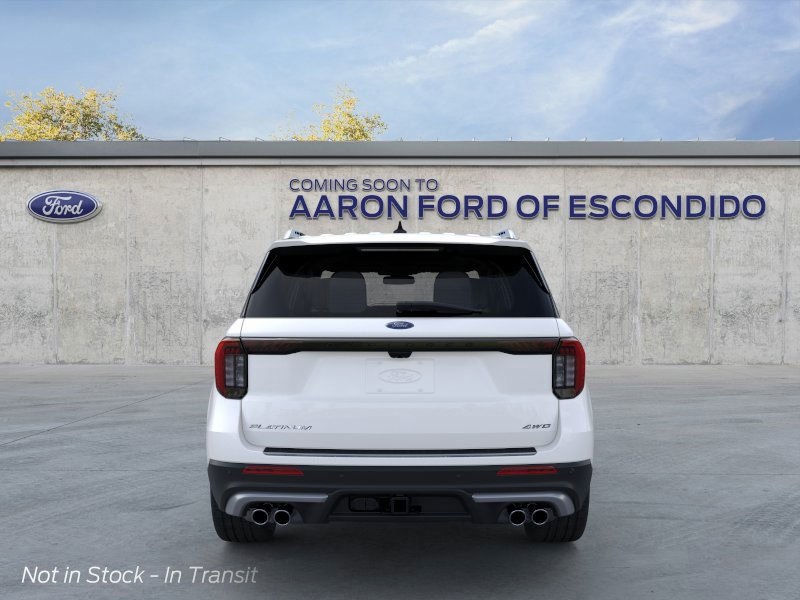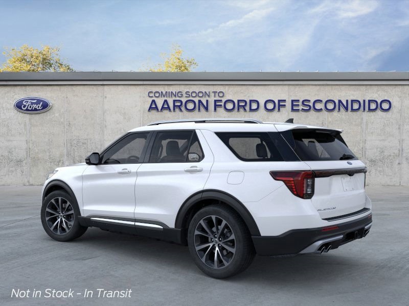 2025 Ford Explorer Platinum Star White Metallic Tri-Coat4WD. 4WD 10-Speed Automatic 3.0L EcoBoost V618/24 City/Highway MPGAaron Ford of Escondido offers a comprehensive selection of new Ford vehicles, from the adventurous Bronco to the efficient Escape. Our dealership is committed to providing top-notch customer service and helping you find the perfect Ford to fit your lifestyle. Come see us and discover the Ford difference.