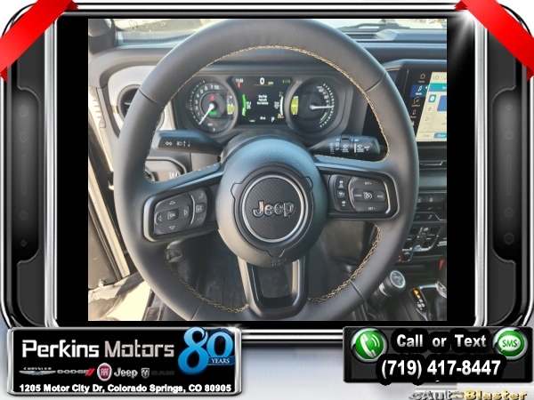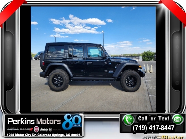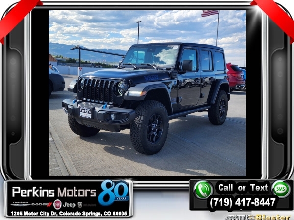 Factory MSRP: $65,210 $14,750 off MSRP! Priced below KBB Fair Purchase Price! Black Clearcoat 2024 Jeep Wrangler Willys 4xe 4WD 8-Speed Automatic 2.0L I4 DOHC<br>2.0L I4 DOHC.<br>Check us out at www.perkinsmotors.com to see our specials! Since opening our doors in 1944, we’ve been proud to serve Colorado Springs, CO, and the surrounding areas of Pueblo, Castle Rock and Denver, CO. Throughout this time of being family owned for 80 years, we’ve maintained a firm commitment to our customers: to offer a wide selection of New Chrysler, Dodge, Fiat, Jeep, and Ram vehicles and quality pre-owned vehicles, and provide a quick, no-hassle car-buying process that ensures everyone drives off the lot satisfied with their purchase.<br><br>Convenience Group (2-Door Passive Entry, Front Door Locks and Universal Garage Door Opener), Quick Order Package 29W Willys (Black Grille, Conventional Differential Front Axle, and Wheels: 17 x 7.5 Painted Black), Technology Group (Alpine Premium Audio System and EV/PHEV Vehicle To Load), 2.0L I4 DOHC, 3.73 Rear Axle Ratio, 4-Wheel Disc Brakes, 8 Speakers, ABS brakes, Air Conditioning, Alloy wheels, Apple CarPlay/Android Auto, Automatic temperature control, Brake assist, Cloth Low-Back Bucket Seats, Compass, Cruise Control, Delay-off headlights, Driver door bin, Driver vanity mirror, Dual front impact airbags, Dual front side impact airbags, Electronic Stability Control, Front anti-roll bar, Front Bucket Seats, Front Center Armrest w/Storage, Front dual zone A/C, Front fog lights, Front License Plate Bracket, Front reading lights, Fully automatic headlights, Heated door mirrors, Illuminated entry, Integrated roll-over protection, Low tire pressure warning, Occupant sensing airbag, Outside temperature display, Overhead airbag, Panic alarm, ParkView Rear Back-Up Camera, Passenger door bin, Passenger vanity mirror, Power door mirrors, Power steering, Power windows, Radio data system, Radio: Uconnect 5 w/12.3 Display, Rear anti-roll bar, Rear reading lights, Remote keyless entry, Removable Rear Quarter Windows, Security system, Sky 1-Touch Power Top, Split folding rear seat, Sport Suspension, Steering wheel mounted audio controls, Tachometer, Telescoping steering wheel, Tilt steering wheel, Traction control, Trip computer, Variably intermittent wipers, Voltmeter, and Wheels: 20 x 8 Machined/Painted Gray. Sale price includes all manufacture's incentives and dealer discounts. Sale price not available on lease or compatible with special APR. $3750 - Federal EV Tax Credit. Exp. 12/31/2024 $7500 - 2024 National Retail Consumer Cash . Exp. 10/31/2024