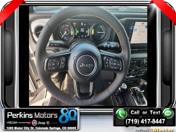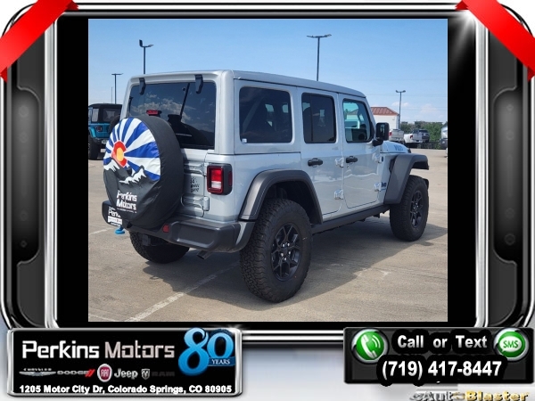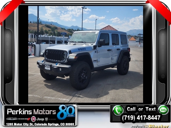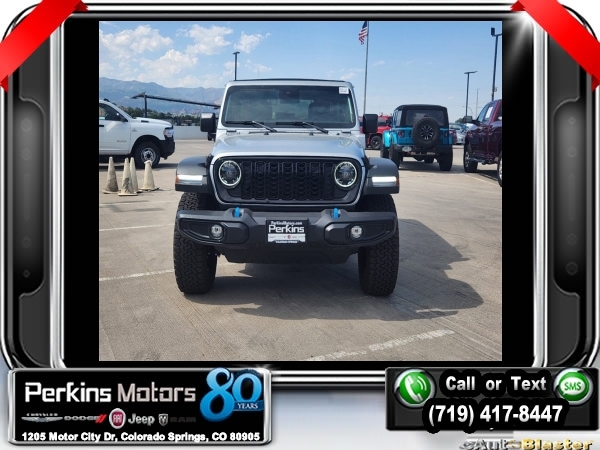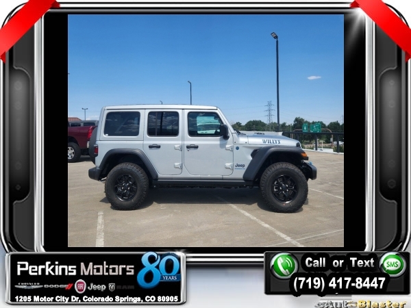 Factory MSRP: $65,210 $14,750 off MSRP! Priced below KBB Fair Purchase Price! Silver Zynith Clearcoat 2024 Jeep Wrangler Willys 4xe 4WD 8-Speed Automatic 2.0L I4 DOHC<br>2.0L I4 DOHC.<br>Check us out at www.perkinsmotors.com to see our specials! Since opening our doors in 1944, we’ve been proud to serve Colorado Springs, CO, and the surrounding areas of Pueblo, Castle Rock and Denver, CO. Throughout this time of being family owned for 80 years, we’ve maintained a firm commitment to our customers: to offer a wide selection of New Chrysler, Dodge, Fiat, Jeep, and Ram vehicles and quality pre-owned vehicles, and provide a quick, no-hassle car-buying process that ensures everyone drives off the lot satisfied with their purchase.<br><br>Convenience Group (Universal Garage Door Opener), Quick Order Package 29W Willys (97 MPH Vehicle Max Speed Calibration, Black Grille, E-Locker Rear Axle, Off-Road Plus Mode, Wheels: 17 x 7.5 Painted Black, Willy's Suspension, and Willys 4xe Hood Decal), Technology Group, 2.0L I4 DOHC, 3.73 Rear Axle Ratio, 4-Wheel Disc Brakes, 8 Speakers, ABS brakes, Air Conditioning, Alloy wheels, Apple CarPlay/Android Auto, Automatic temperature control, Brake assist, Cloth Low-Back Bucket Seats, Compass, Cruise Control, Delay-off headlights, Driver door bin, Driver vanity mirror, Dual front impact airbags, Dual front side impact airbags, Electronic Stability Control, Front anti-roll bar, Front Bucket Seats, Front Center Armrest w/Storage, Front dual zone A/C, Front fog lights, Front License Plate Bracket, Front reading lights, Fully automatic headlights, Heated door mirrors, Illuminated entry, Integrated roll-over protection, Low tire pressure warning, Occupant sensing airbag, Outside temperature display, Overhead airbag, Panic alarm, ParkView Rear Back-Up Camera, Passenger door bin, Passenger vanity mirror, Power door mirrors, Power steering, Power windows, Radio data system, Radio: Uconnect 5 w/12.3 Display, Rear anti-roll bar, Rear reading lights, Remote keyless entry, Removable Rear Quarter Windows, Security system, Sky 1-Touch Power Top, Split folding rear seat, Sport Suspension, Steering wheel mounted audio controls, Tachometer, Telescoping steering wheel, Tilt steering wheel, Traction control, Trip computer, Variably intermittent wipers, Voltmeter, and Wheels: 20 x 8 Machined/Painted Gray. Sale price includes all manufacture's incentives and dealer discounts. Sale price not available on lease or compatible with special APR. $3750 - Federal EV Tax Credit. Exp. 12/31/2024 $7500 - 2024 National Retail Consumer Cash . Exp. 10/31/2024