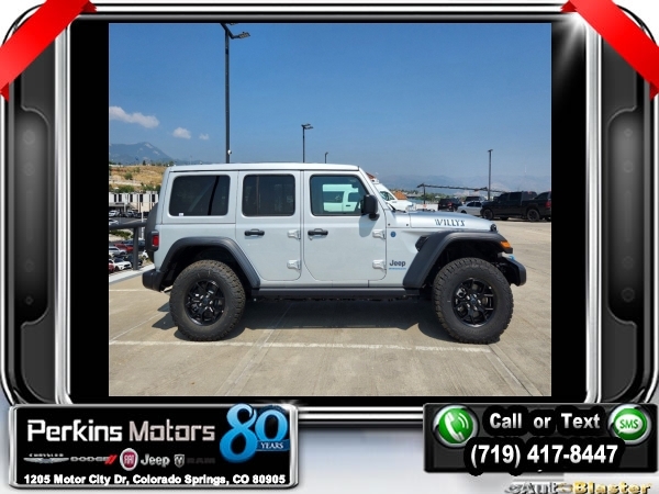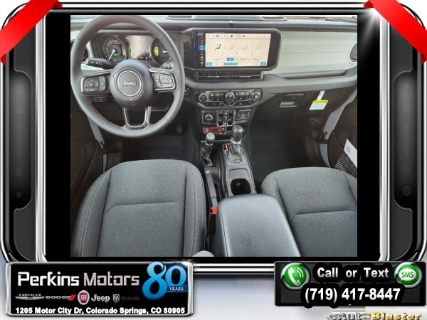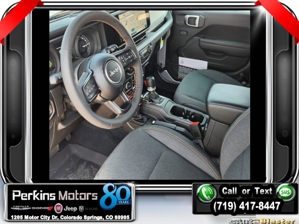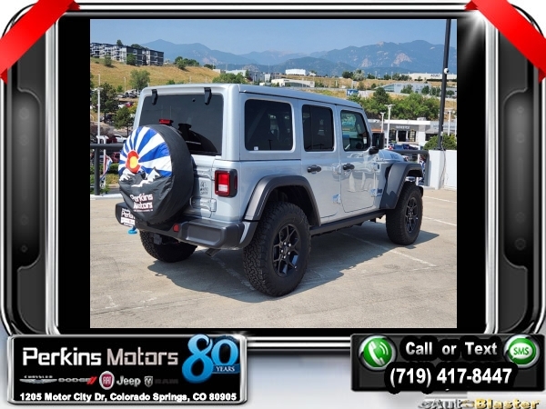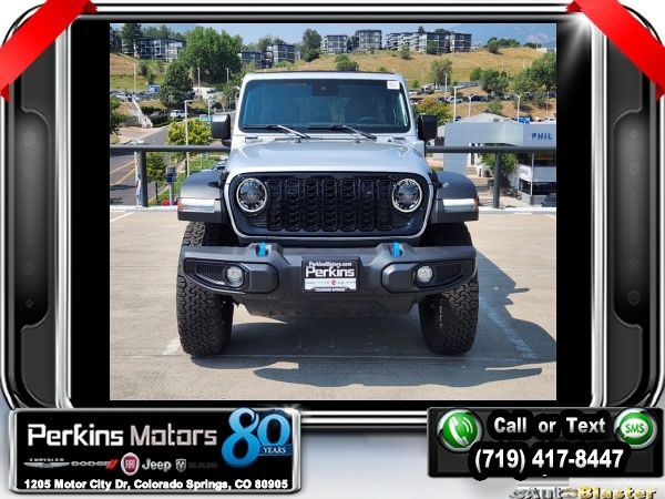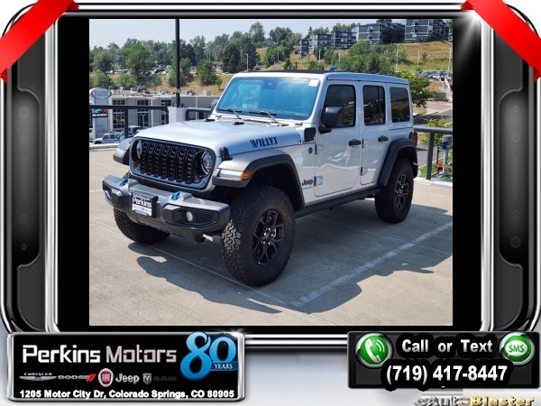 Factory MSRP: $65,210 $17,750 off MSRP! Priced below KBB Fair Purchase Price! Silver Zynith Clearcoat 2024 Jeep Wrangler Willys 4xe 4WD 8-Speed Automatic 2.0L I4 DOHC<br>2.0L I4 DOHC.<br>Check us out at www.perkinsmotors.com to see our specials! Since opening our doors in 1944, we’ve been proud to serve Colorado Springs, CO, and the surrounding areas of Pueblo, Castle Rock and Denver, CO. Throughout this time of being family owned for 80 years, we’ve maintained a firm commitment to our customers: to offer a wide selection of New Chrysler, Dodge, Fiat, Jeep, and Ram vehicles and quality pre-owned vehicles, and provide a quick, no-hassle car-buying process that ensures everyone drives off the lot satisfied with their purchase.<br><br>Convenience Group (2-Door Passive Entry, Front Door Locks, Heated Steering Wheel, and Universal Garage Door Opener), Quick Order Package 29W Willys (Black Grille, Conventional Differential Front Axle, and Wheels: 17 x 7.5 Painted Black), Technology Group (Alpine Premium Audio System and EV/PHEV Vehicle To Load), 2.0L I4 DOHC, 3.73 Rear Axle Ratio, 4-Wheel Disc Brakes, 8 Speakers, ABS brakes, Air Conditioning, Alloy wheels, Apple CarPlay/Android Auto, Automatic temperature control, Brake assist, Cloth Low-Back Bucket Seats, Compass, Cruise Control, Delay-off headlights, Driver door bin, Driver vanity mirror, Dual front impact airbags, Dual front side impact airbags, Electronic Stability Control, Front anti-roll bar, Front Bucket Seats, Front Center Armrest w/Storage, Front dual zone A/C, Front fog lights, Front License Plate Bracket, Front reading lights, Fully automatic headlights, Heated door mirrors, Illuminated entry, Integrated roll-over protection, Low tire pressure warning, Occupant sensing airbag, Outside temperature display, Overhead airbag, Panic alarm, ParkView Rear Back-Up Camera, Passenger door bin, Passenger vanity mirror, Power door mirrors, Power steering, Power windows, Radio data system, Radio: Uconnect 5 w/12.3 Display, Rear anti-roll bar, Rear reading lights, Remote keyless entry, Removable Rear Quarter Windows, Security system, Sky 1-Touch Power Top, Split folding rear seat, Sport Suspension, Steering wheel mounted audio controls, Tachometer, Telescoping steering wheel, Tilt steering wheel, Traction control, Trip computer, Variably intermittent wipers, Voltmeter, and Wheels: 20 x 8 Machined/Painted Gray. Sale price includes all manufacture's incentives and dealer discounts. Sale price not available on lease or compatible with special APR. $3750 - Federal EV Tax Credit. Exp. 12/31/2024