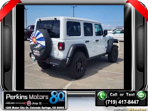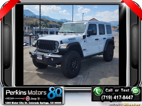 Factory MSRP: $64,615 $14,750 off MSRP! Priced below KBB Fair Purchase Price! Bright White Clearcoat 2024 Jeep Wrangler Willys 4xe 4WD 8-Speed Automatic 2.0L I4 DOHC<br>2.0L I4 DOHC.<br>Check us out at www.perkinsmotors.com to see our specials! Since opening our doors in 1944, we’ve been proud to serve Colorado Springs, CO, and the surrounding areas of Pueblo, Castle Rock and Denver, CO. Throughout this time of being family owned for 80 years, we’ve maintained a firm commitment to our customers: to offer a wide selection of New Chrysler, Dodge, Fiat, Jeep, and Ram vehicles and quality pre-owned vehicles, and provide a quick, no-hassle car-buying process that ensures everyone drives off the lot satisfied with their purchase.<br><br>Convenience Group (2-Door Passive Entry, Front Door Locks, Heated Steering Wheel, and Universal Garage Door Opener), Quick Order Package 29W Willys (Black Grille, Conventional Differential Front Axle, and Wheels: 17 x 7.5 Painted Black), Technology Group (Alpine Premium Audio System and EV/PHEV Vehicle To Load), 2.0L I4 DOHC, 3.73 Rear Axle Ratio, 4-Wheel Disc Brakes, 8 Speakers, ABS brakes, Air Conditioning, Alloy wheels, Apple CarPlay/Android Auto, Automatic temperature control, Brake assist, Cloth Low-Back Bucket Seats, Compass, Cruise Control, Delay-off headlights, Driver door bin, Driver vanity mirror, Dual front impact airbags, Dual front side impact airbags, Electronic Stability Control, Front anti-roll bar, Front Bucket Seats, Front Center Armrest w/Storage, Front dual zone A/C, Front fog lights, Front License Plate Bracket, Front reading lights, Fully automatic headlights, Heated door mirrors, Illuminated entry, Integrated roll-over protection, Low tire pressure warning, Occupant sensing airbag, Outside temperature display, Overhead airbag, Panic alarm, ParkView Rear Back-Up Camera, Passenger door bin, Passenger vanity mirror, Power door mirrors, Power steering, Power windows, Radio data system, Radio: Uconnect 5 w/12.3 Display, Rear anti-roll bar, Rear reading lights, Remote keyless entry, Removable Rear Quarter Windows, Security system, Sky 1-Touch Power Top, Split folding rear seat, Sport Suspension, Steering wheel mounted audio controls, Tachometer, Telescoping steering wheel, Tilt steering wheel, Traction control, Trip computer, Variably intermittent wipers, Voltmeter, and Wheels: 20 x 8 Machined/Painted Gray. Sale price includes all manufacture's incentives and dealer discounts. Sale price not available on lease or compatible with special APR. $3750 - Federal EV Tax Credit. Exp. 12/31/2024 $7500 - 2024 National Retail Consumer Cash . Exp. 10/31/2024