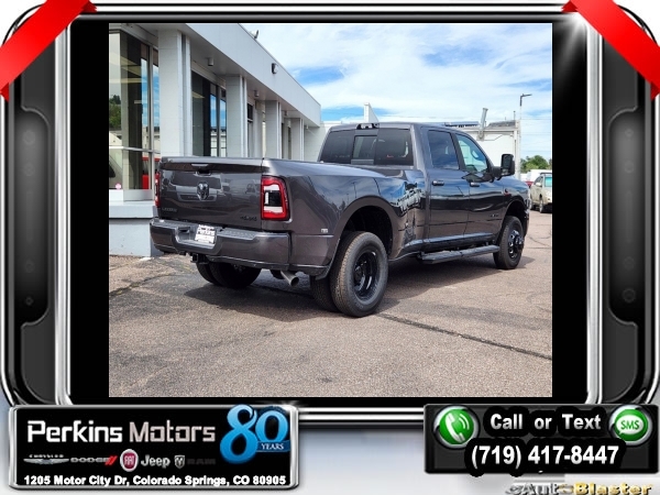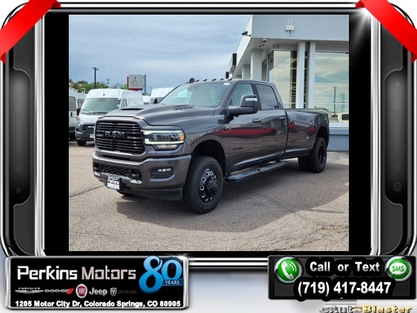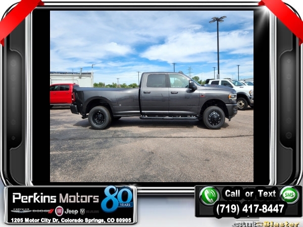 Factory MSRP: $95,190 $11,500 off MSRP! Granite Crystal Metallic Clearcoat 2024 Ram 3500 Laramie 4WD 6-Speed Automatic I6<br><br>Check us out at www.perkinsmotors.com to see our specials! Since opening our doors in 1944, we’ve been proud to serve Colorado Springs, CO, and the surrounding areas of Pueblo, Castle Rock and Denver, CO. Throughout this time of being family owned for 80 years, we’ve maintained a firm commitment to our customers: to offer a wide selection of New Chrysler, Dodge, Fiat, Jeep, and Ram vehicles and quality pre-owned vehicles, and provide a quick, no-hassle car-buying process that ensures everyone drives off the lot satisfied with their purchase.<br><br>Bed Utility Group (LED Bed Lighting and MOPAR Spray In Bedliner), Cold Weather Group (Engine Block Heater), Heavy Duty Snow Plow Prep Group, Laramie Level 1 Equipment Group (4G LTE Wi-Fi Hot Spot, Alexa Built-In, Apple CarPlay, Auto High Beam Headlamp Control, Auto Power-Folding Mirrors, Blind Spot & Cross Path Detection, Center Hub, Connected Travel & Traffic Services, Connectivity - US/Canada, Disassociated Touchscreen Display, Exterior Mirrors Courtesy Lamps, Exterior Mirrors w/Heating Element, Exterior Mirrors w/Supplemental Signals, For Details Visit DriveUconnect.com, For More Info, Call 800-643-2112, Forward & Reverse Utility Lights, Global Telematics Box Module (TBM), Google Android Auto, GPS Antenna Input, GPS Navigation, HD Radio, Integrated Voice Command w/Bluetooth, LED Reflector Headlamps, Mirror Running Lights, Off-Road Information Pages, Power Adjust Mirrors, Power Heat Fold Memory Telescopic Mirrors, Power-Adjustable Convex Aux Mirrors, Radio: Uconnect 5 Nav w/12.0 Display, Rear Window Defroster, Selectable Tire Fill Alert, SiriusXM Radio Service, SiriusXM w/360L, and Trailer Tow Pages), Night Edition (Body Color Grille Surround), Protection Group, Quick Order Package 21H Laramie, Safety Group (Adaptive Steering System), Towing Technology Group (CTR Stop Lamp w/Cargo View Camera), 10 Speakers, 115V Auxiliary Rear Power Outlet, 2 Way Rear Headrest Seat, 220 Amp Alternator, 3.73 Axle Ratio, 4 Way Front Headrests, 4-Wheel Disc Brakes, 4.10 Axle Ratio, 50 Gallon Fuel Tank, 5th Wheel/Gooseneck Towing Prep Group, 6000# Front Axle w/Hub Ext, 8.4 Touchscreen Display, ABS brakes, Active Noise Control System, Air Conditioning, Alloy wheels, AM/FM radio: SiriusXM with 360L, Apple CarPlay/Android Auto, Auto Level Rear Air Suspension, Auto-dimming Rear-View mirror, Automatic temperature control, Box & Rear Fender Clearance Lamps, Brake assist, Bumpers: body-color, Clearance Lamps, Compass, Cruise Control, Delay-off headlights, Driver door bin, Driver vanity mirror, Dual front impact airbags, Dual front side impact airbags, Dual Rear Wheels, Electronic Stability Control, Electronically Controlled Throttle, Folding Flat Load Floor Storage, Front anti-roll bar, Front Center Armrest w/Storage, Front dual zone A/C, Front License Plate Bracket, Front reading lights, Front Seat Back Map Pockets, Fully automatic headlights, Garage door transmitter, Heated door mirrors, Heated Front Seats, Heated front seats, Heated Steering Wheel, Heated steering wheel, High Back Seats, I/P Mounted Auxiliary Switches, Illuminated entry, Integrated Center Stack Radio, Leather steering wheel, Leather Trim 40/20/40 Bench Seat, Low tire pressure warning, Manufacturer's Statement of Origin, MOPAR Front & Rear Rubber Floor Mats, Occupant sensing airbag, Outside temperature display, Overhead airbag, Overhead console, Painted Flat Cab-Length Side Steps, Panic alarm, ParkView Rear Back-Up Camera, Passenger door bin, Passenger vanity mirror, Power 8-Way Adjustable Passenger Seat, Power Adjust 8-Way Driver Seat, Power door mirrors, Power driver seat, Power passenger seat, Power steering, Power Sunroof, Power win Sale price includes all manufacture's incentives and dealer discounts. Sale price not available on lease or compatible with special APR. $1000 - 2024 Bonus Cash . Exp. 0