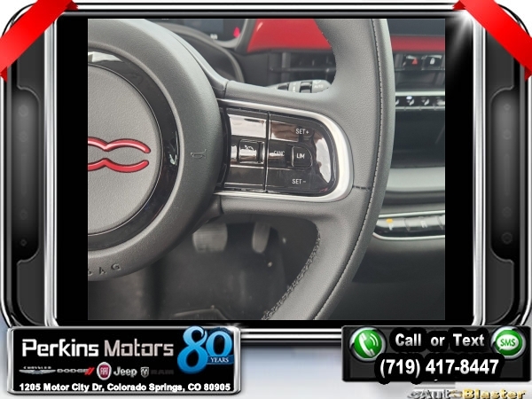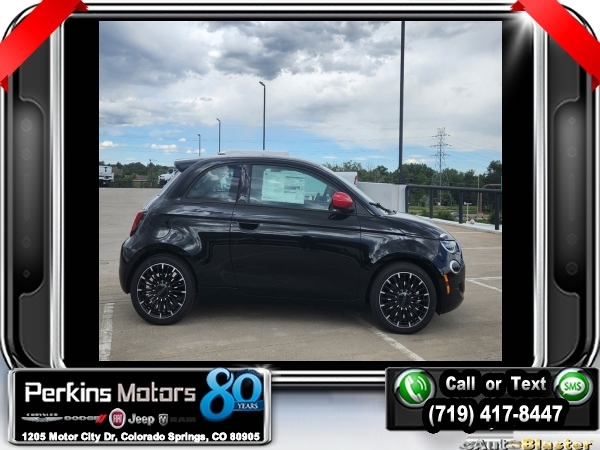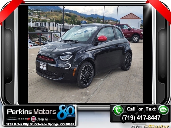 Factory MSRP: $34,095 $1,023 off MSRP! Tuxedo Black 2024 Fiat 500e Battery Electric FWD 1-Speed Automatic Electric<br><br>Check us out at www.perkinsmotors.com to see our specials! Since opening our doors in 1944, we’ve been proud to serve Colorado Springs, CO, and the surrounding areas of Pueblo, Castle Rock and Denver, CO. Throughout this time of being family owned for 80 years, we’ve maintained a firm commitment to our customers: to offer a wide selection of New Chrysler, Dodge, Fiat, Jeep, and Ram vehicles and quality pre-owned vehicles, and provide a quick, no-hassle car-buying process that ensures everyone drives off the lot satisfied with their purchase.<br><br>Quick Order Package 21A 500e Inspi(red), 4-Wheel Disc Brakes, 6 Speakers, ABS brakes, Air Conditioning, Alloy wheels, AM/FM radio: SiriusXM, Anti-whiplash front head restraints, Automatic temperature control, Brake assist, Bumpers: body-color, Cloth Bucket Seats w/Red Accents, Compass, Cruise Control, Delay-off headlights, Driver door bin, Driver vanity mirror, Dual front impact airbags, Dual front side impact airbags, Electronic Stability Control, Four wheel independent suspension, Front anti-roll bar, Front Bucket Seats, Front Center Armrest, Front dual zone A/C, Front reading lights, Fully automatic headlights, Illuminated entry, Knee airbag, Low tire pressure warning, Manufacturer's Statement of Origin, Navigation System, Occupant sensing airbag, Outside temperature display, Overhead airbag, Overhead console, Panic alarm, ParkView Rear Back-Up Camera, Passenger door bin, Passenger vanity mirror, Power door mirrors, Power steering, Power windows, Premium audio system: Uconnect 5.0, Radio data system, Radio: Uconnect 5 Nav w/10.25 Display, Rain sensing wipers, Rear anti-roll bar, Rear window defroster, Rear window wiper, Remote keyless entry, Security system, Split folding rear seat, Spoiler, Sport steering wheel, Steering wheel mounted audio controls, Telescoping steering wheel, Tilt steering wheel, Traction control, Trip computer, Variably intermittent wipers, and Wheels: 17 x 7.0 Aluminum Multi-Spoke.
