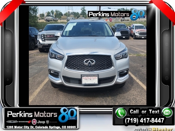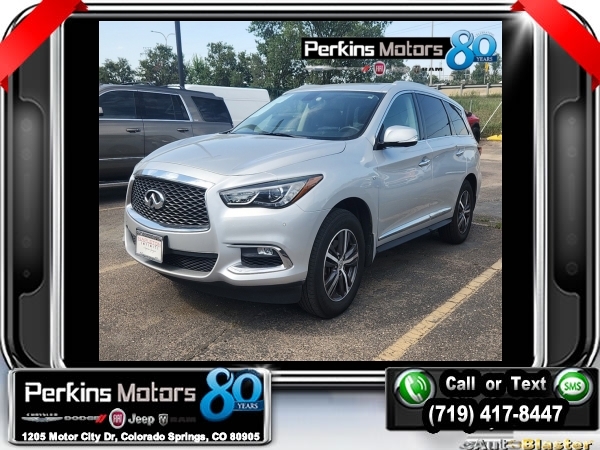 Liquid Platinum AWD 3.5L V6 Sport-Tuned CVT<br><br><br>Check us out at www.perkinsmotors.com to see our specials! Since opening our doors in 1944, we’ve been proud to serve Colorado Springs, CO, and the surrounding areas of Pueblo, Castle Rock and Denver, CO. Throughout this time of being family owned for 80 years, we’ve maintained a firm commitment to our customers: to offer a wide selection of New Chrysler, Dodge, Fiat, Jeep, and Ram vehicles and quality pre-owned vehicles, and provide a quick, no-hassle car-buying process that ensures everyone drives off the lot satisfied with their purchase.<br><br><br>Awards:<br> * 2017 IIHS Top Safety Pick * 2017 KBB.com 5-Year Cost to Own Awards<br><br>Cargo Package w/Premium Plus Pkg (Cargo Protector, First Aid Kit, and Rear Cargo Cover), Premium Package (2-Way Driver's Seat Power Lumbar Support, Dual Occupant Memory System, Enhanced Intelligent Key Memory, Entry & Exit Assist, Heated Steering Wheel, Outside Mirrors w/Reverse Tilt-Down Feature, Radio: AM/FM/CD/DVD w/MP3 Playback Capability, and Remote Engine Start), Premium Plus Package (Around View Monitor w/Front & Rear Sonar System, INFINITI InTouch w/Navigation, Rain-Sensing Front Windshield Wipers, Single In-Dash CD Player, and Voice Recognition For Navigation), 3rd row seats: bench, 4-Wheel Disc Brakes, 5.17 Axle Ratio, 6 Speakers, ABS brakes, Air Conditioning, Alloy wheels, AM/FM radio: SiriusXM, AM/FM/CD/MP3 Audio System, Auto-dimming Rear-View mirror, Automatic temperature control, Bodyside moldings, Brake assist, Bumpers: body-color, CD player, Cruise Control, Delay-off headlights, Driver door bin, Driver vanity mirror, Dual front impact airbags, Dual front side impact airbags, Electronic Stability Control, Four wheel independent suspension, Front anti-roll bar, Front Bucket Seats, Front Center Armrest w/Storage, Front dual zone A/C, Front fog lights, Front reading lights, Fully automatic headlights, Garage door transmitter, Heated door mirrors, Heated Front Seats, Heated front seats, High intensity discharge headlights: Bi-Xenon, Illuminated entry, Leather Shift Knob, Leather steering wheel, Leather-Appointed Seats, Low tire pressure warning, Occupant sensing airbag, Outside temperature display, Overhead airbag, Overhead console, Panic alarm, Passenger door bin, Passenger vanity mirror, Power door mirrors, Power driver seat, Power Liftgate, Power moonroof, Power passenger seat, Power steering, Power windows, Radio data system, Rear air conditioning, Rear anti-roll bar, Rear reading lights, Rear seat center armrest, Rear window defroster, Rear window wiper, Reclining 3rd row seat, Remote keyless entry, Security system, Speed-sensing steering, Speed-Sensitive Wipers, Splash Guards (Color-Matched Set of 4), Split folding rear seat, Spoiler, Steering wheel mounted audio controls, Tachometer, Telescoping steering wheel, Tilt steering wheel, Traction control, Trip computer, Turn signal indicator mirrors, Variably intermittent wipers, and Wheels: 18 Triple 5-Spoke Aluminum-Alloy.