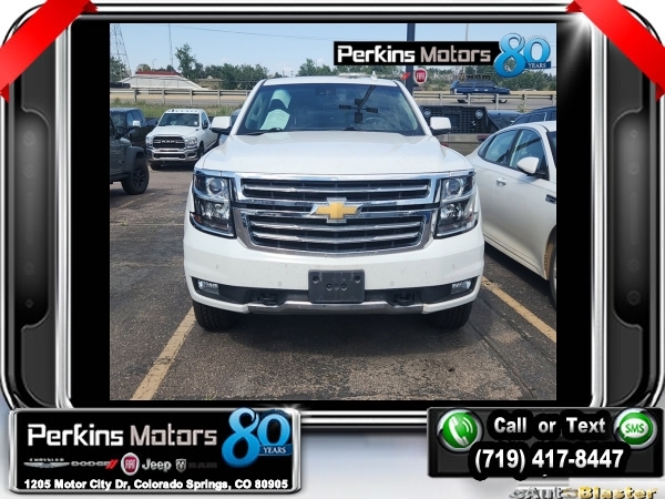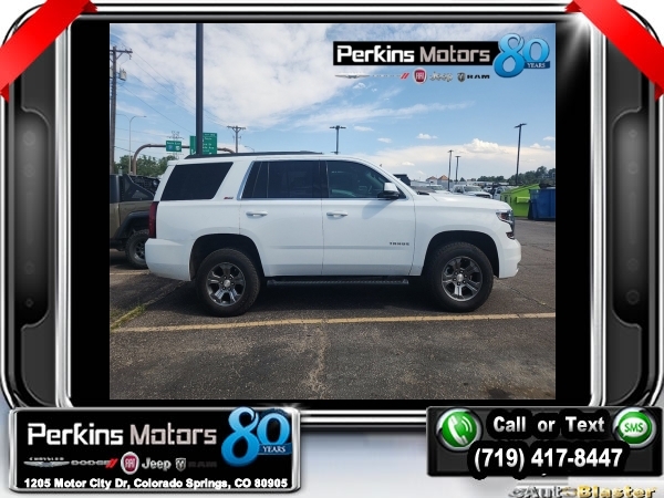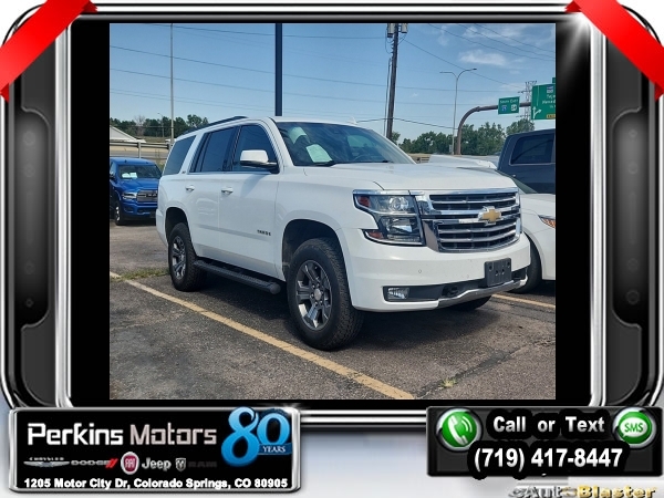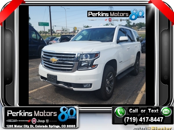 Summit White 4WD EcoTec3 5.3L V8 6-Speed Automatic Electronic with Overdrive<br><br>4WD, Cocoa/Dune Leather.<br><br><br>Check us out at www.perkinsmotors.com to see our specials! Since opening our doors in 1944, we’ve been proud to serve Colorado Springs, CO, and the surrounding areas of Pueblo, Castle Rock and Denver, CO. Throughout this time of being family owned for 80 years, we’ve maintained a firm commitment to our customers: to offer a wide selection of New Chrysler, Dodge, Fiat, Jeep, and Ram vehicles and quality pre-owned vehicles, and provide a quick, no-hassle car-buying process that ensures everyone drives off the lot satisfied with their purchase.<br><br>Reviews:<br> * Seating for up to nine passengers; standard V8 engine assures plenty of passing power and a substantial tow rating; nicely trimmed cabin is one of the best in the class; available two-speed transfer case gives the Tahoe better than average off-road capabilities. Source: Edmunds<br><br><br>Awards:<br> * JD Power Automotive Performance, Execution and Layout (APEAL) Study, Dependability Study * 2017 KBB.com 12 Best Family Cars * 2017 KBB.com Best Buy Awards * 2017 KBB.com 5-Year Cost to Own Awards * 2017 KBB.com 10 Most Awarded Brands<br><br>Enhanced Driver Alert Package (Y86) (Forward Collision Alert Sensor Indicator, IntelliBeam Headlamps, Lane Keep Assist, and Low Speed Forward Automatic Braking), License Plate Front Mounting Package, Off-Road Z71 Suspension Package (2 Front Frame-Mounted Black Recovery Hooks, 3.42 Rear Axle Ratio, Black Tubular Assist Steps, and Hill Descent Control), Preferred Equipment Group 1LT (1st & 2nd Row Color-Keyed Carpeted Floor Mats, 2nd Row 60/40 Split-Folding Manual Bench, 3rd Row Manual 60/40 Split-Folding Fold Flat Bench, 4-Wheel Antilock Disc Brakes w/Brake Assist, Auto-Dimming Inside Rear-View Mirror, Black Assist Steps, Bose Premium 9-Speaker System, Color-Keyed Carpeting Floor Covering, Driver Inboard & Front Passenger Airbags, Electronic Cruise Control w/Set & Resume Speed, Enhanced Driver Information Center, Extended-Range Remote Keyless Entry, Floor Console, Leather-Wrapped Steering Wheel, OnStar Basic Plan For 5 Years, Power Liftgate, Power-Adjustable Accelerator & Brake Pedals, Rear Park Assist w/Audible Warning, Remote Vehicle Start, Roof-Mounted Luggage Rack Side Rails, SiriusXM Satellite Radio, and Universal Home Remote), Premium Smooth Ride Suspension Package, Skid Plate Package, 4WD, Cocoa/Dune Leather, 18 x 8.5 Aluminum Wheels, 3.08 Rear Axle Ratio, 3rd row seats: split-bench, 4-Wheel Disc Brakes, 5 12-Volt Auxiliary Power Outlets, 6-Way Power Front Passenger Seat Adjuster, 9 Speakers, ABS brakes, Adjustable pedals, Air Conditioning, Alloy wheels, AM/FM radio: SiriusXM, Apple CarPlay/Android Auto, Auto High-beam Headlights, Auto-dimming Rear-View mirror, Automatic temperature control, Brake assist, Bumpers: body-color, Cargo Net, CD player, Compass, Cruise Control, Delay-off headlights, Driver door bin, Driver vanity mirror, Dual front impact airbags, Dual front side impact airbags, Electronic Stability Control, Emergency communication system: OnStar Guidance, Exterior Parking Camera Rear, Fog Lamps, Front & Rear Parking Assist, Front anti-roll bar, Front Bucket Seats, Front Center Armrest, Front dual zone A/C, Front Heated Reclining Bucket Seats, Front reading lights, Front wheel independent suspension, Fully automatic headlights, Garage door transmitter, Heated door mirrors, Heated front seats, Illuminated entry, Leather-Appointed Seat Trim, Low tire pressure warning, Memory seat, Occupant sensing airbag, Outside temperature display, Overhead airbag, Overhead console, Panic alarm, Passenger door bin, Passenger vanity mirror, Pedal memory, Power door mirrors, Power driver seat, Power passenger seat, Power steering, Power windows, Premium audio system: Chevrolet MyLink, Radio: Chevrolet MyLink AM/FM Stereo, Rain sensing wipers, Rear air conditioning, Rear anti-roll bar, Rear reading ligh
