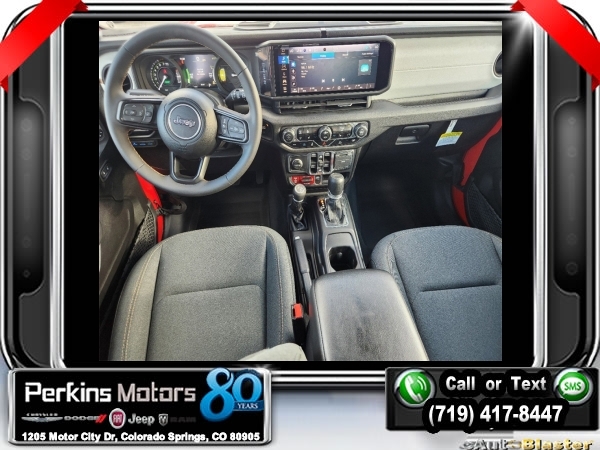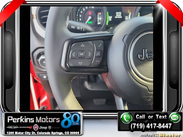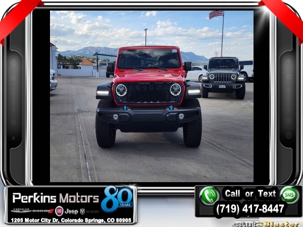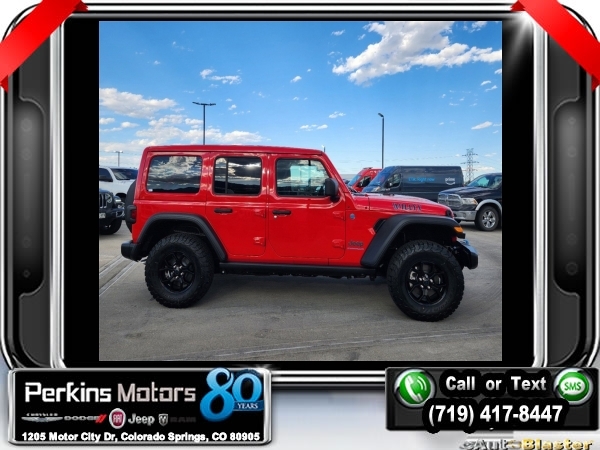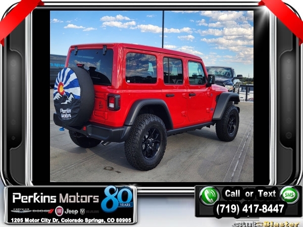Factory MSRP: $65,210 $14,750 off MSRP! Priced below KBB Fair Purchase Price! Firecracker Red Clearcoat 2024 Jeep Wrangler Willys 4xe 4WD 8-Speed Automatic 2.0L I4 DOHC<br>2.0L I4 DOHC.<br>Check us out at www.perkinsmotors.com to see our specials! Since opening our doors in 1944, we’ve been proud to serve Colorado Springs, CO, and the surrounding areas of Pueblo, Castle Rock and Denver, CO. Throughout this time of being family owned for 80 years, we’ve maintained a firm commitment to our customers: to offer a wide selection of New Chrysler, Dodge, Fiat, Jeep, and Ram vehicles and quality pre-owned vehicles, and provide a quick, no-hassle car-buying process that ensures everyone drives off the lot satisfied with their purchase.<br><br>Convenience Group (2-Door Passive Entry, Front Door Locks, Heated Steering Wheel, and Universal Garage Door Opener), Quick Order Package 29W Willys (Black Grille, Conventional Differential Front Axle, and Wheels: 17 x 7.5 Painted Black), Technology Group (Alpine Premium Audio System and EV/PHEV Vehicle To Load), 2.0L I4 DOHC, 3.73 Rear Axle Ratio, 4-Wheel Disc Brakes, 8 Speakers, ABS brakes, Air Conditioning, Alloy wheels, Apple CarPlay/Android Auto, Automatic temperature control, Brake assist, Cloth Low-Back Bucket Seats, Compass, Cruise Control, Delay-off headlights, Driver door bin, Driver vanity mirror, Dual front impact airbags, Dual front side impact airbags, Electronic Stability Control, Front anti-roll bar, Front Bucket Seats, Front Center Armrest w/Storage, Front dual zone A/C, Front fog lights, Front License Plate Bracket, Front reading lights, Fully automatic headlights, Heated door mirrors, Illuminated entry, Integrated roll-over protection, Low tire pressure warning, Occupant sensing airbag, Outside temperature display, Overhead airbag, Panic alarm, ParkView Rear Back-Up Camera, Passenger door bin, Passenger vanity mirror, Power door mirrors, Power steering, Power windows, Radio data system, Radio: Uconnect 5 w/12.3 Display, Rear anti-roll bar, Rear reading lights, Remote keyless entry, Removable Rear Quarter Windows, Security system, Sky 1-Touch Power Top, Split folding rear seat, Sport Suspension, Steering wheel mounted audio controls, Tachometer, Telescoping steering wheel, Tilt steering wheel, Traction control, Trip computer, Variably intermittent wipers, Voltmeter, and Wheels: 20 x 8 Machined/Painted Gray. Sale price includes all manufacture's incentives and dealer discounts. Sale price not available on lease or compatible with special APR. $3750 - Federal EV Tax Credit. Exp. 12/31/2024 $7500 - 2024 National Retail Consumer Cash . Exp. 10/31/2024