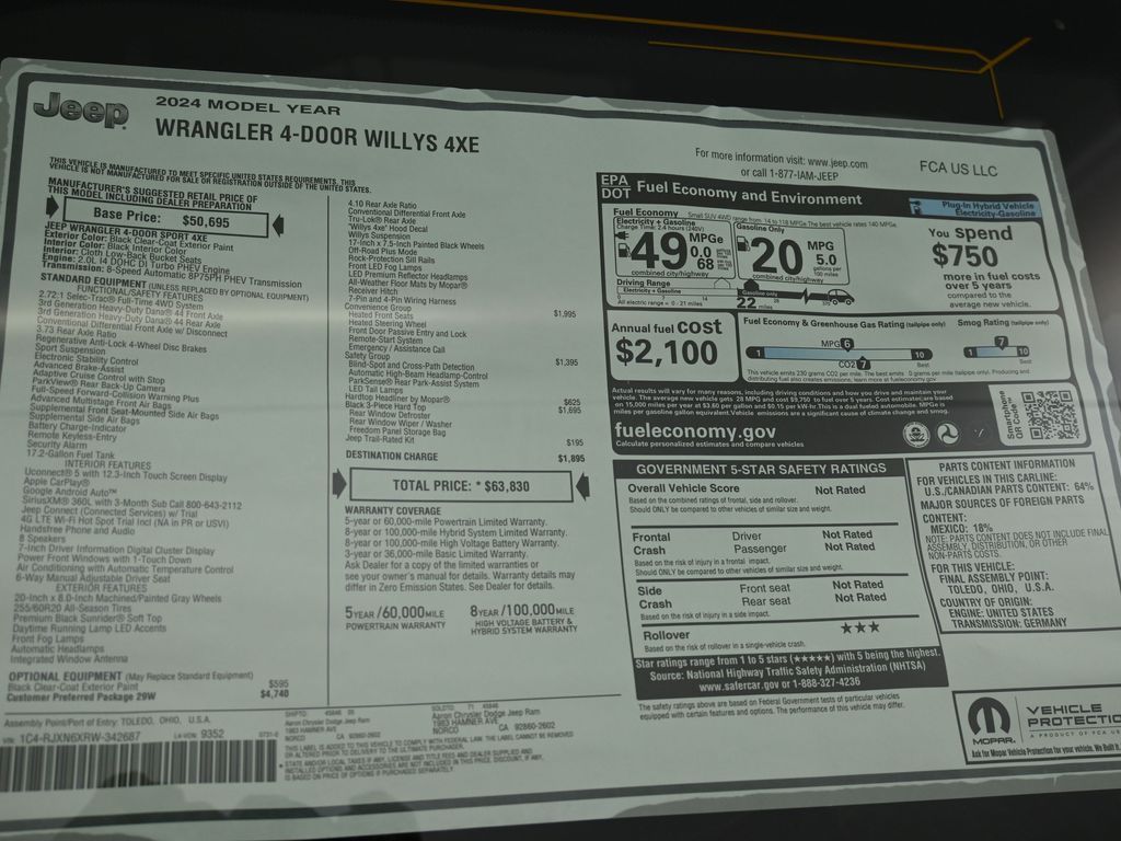2024 Jeep Wrangler 4xe Sport 4xe Black Clearcoat Dealer Discount of $4,750 off MSRPExplore the latest models from Chrysler, Dodge, Jeep, and Ram at Aaron CDJR of Norco. Whether you're looking for a rugged Jeep Wrangler, a powerful Ram truck, or a sleek Chrysler sedan, our vast inventory has something for everyone. Experience exceptional customer service and find the perfect vehicle to match your lifestyle.2.0L I4 DOHC, ABS brakes, Alloy wheels, Compass, Electronic Stability Control, Front dual zone A/C, Heated door mirrors, Illuminated entry, Low tire pressure warning, ParkView Rear Back-Up Camera, Passenger door bin, Remote keyless entry, Traction control. 4WD 8-Speed Automatic 2.0L I4 DOHC Price includes: $500 - 2024 National Jeep Celebration Event Bonus Cash. Exp. 04/30/2025 $7500 - 2024 National Retail Consumer Cash . Exp. 04/30/2025