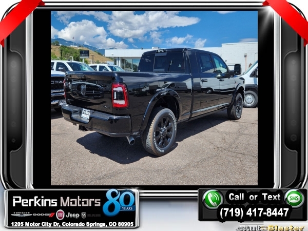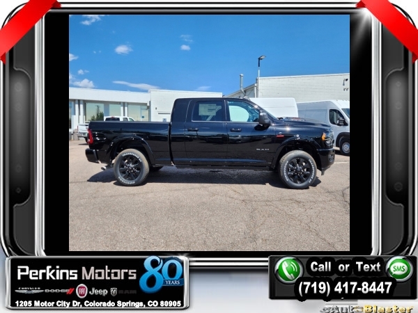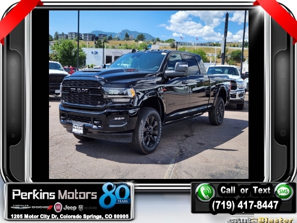 Factory MSRP: $104,475 $13,500 off MSRP! Diamond Black Crystal Pearlcoat 2024 Ram 3500 Limited 4WD 6-Speed Automatic I6<br><br>Check us out at www.perkinsmotors.com to see our specials! Since opening our doors in 1944, we’ve been proud to serve Colorado Springs, CO, and the surrounding areas of Pueblo, Castle Rock and Denver, CO. Throughout this time of being family owned for 80 years, we’ve maintained a firm commitment to our customers: to offer a wide selection of New Chrysler, Dodge, Fiat, Jeep, and Ram vehicles and quality pre-owned vehicles, and provide a quick, no-hassle car-buying process that ensures everyone drives off the lot satisfied with their purchase.<br><br>Cold Weather Group (Engine Block Heater), Limited Level 1 Equipment Group (12 Touchscreen Display, 17 Speaker harman/kardon Premium Sound, 4G LTE Wi-Fi Hot Spot, Adaptive Steering System, Alexa Built-In, Apple CarPlay, Center Hub, Center Stop Lamp w/Cargo View Camera, Connected Travel & Traffic Services, Connectivity - US/Canada, Disassociated Touchscreen Display, For Details Visit DriveUconnect.com, For More Info, Call 800-643-2112, Global Telematics Box Module (TBM), Google Android Auto, GPS Antenna Input, GPS Navigation, HD Radio, Integrated Voice Command w/Bluetooth, Off-Road Information Pages, Power Deployable Running Boards, Radio: Uconnect 5 Nav w/12.0 Display, Selectable Tire Fill Alert, SiriusXM Radio Service, SiriusXM w/360L, Trailer Tow Pages, Vendor Painted Cargo Box, and Vendor Painted Cargo Box Tracking), Night Edition (Black Exterior Truck Badging, Black Grille Limited, Black Headlamp Bezels, Black Tail Lamp Bezels, Black Wheel Center Hub, Body Color Grille Surround, Sport Performance Hood, and Wheels: 20 x 8.0 Cast Aluminum Black), Night Edition w/Dual Rear Wheels (Wheels: 17 x 6.0 Black Machined Aluminum), Protection Group, Quick Order Package 21M Limited, Snow Chief Group (Auxiliary Switches Prep and Clearance Lamps), Tow Technology Plus Group (Trailer Reverse Steering Control), 10 Speakers, 220 Amp Alternator, 3.73 Axle Ratio, 4-Wheel Disc Brakes, 5th Wheel/Gooseneck Towing Prep Group, ABS brakes, Active Noise Control System, Adjustable pedals, Air Conditioning, Alloy wheels, AM/FM radio: SiriusXM with 360L, Apple CarPlay/Android Auto, Audio memory, Auto High-beam Headlights, Auto Level Rear Air Suspension, Auto-dimming door mirrors, Auto-dimming Rear-View mirror, Automatic temperature control, Bodyside moldings, Brake assist, Bumpers: body-color, Compass, Cruise Control, Delay-off headlights, Driver door bin, Driver vanity mirror, Dual Alternators Rated At 440 Amps, Dual front impact airbags, Dual front side impact airbags, Electronic Stability Control, Electronically Controlled Throttle, Front anti-roll bar, Front Bucket Seats, Front Center Armrest w/Storage, Front dual zone A/C, Front fog lights, Front License Plate Bracket, Front reading lights, Fully automatic headlights, Garage door transmitter, Genuine wood console insert, Genuine wood dashboard insert, Genuine wood door panel insert, Heated door mirrors, Heated front seats, Heated rear seats, Heated steering wheel, Illuminated entry, Instrument Cluster Theme 8, Leather steering wheel, Limited Leather Bucket Seats, Low tire pressure warning, Luxury Door Trim Panel, Manufacturer's Statement of Origin, Memory seat, MOPAR Deployable Bed Step, Occupant sensing airbag, Outside temperature display, Overhead airbag, Overhead console, Panic alarm, ParkView Rear Back-Up Camera, Passenger door bin, Passenger vanity mirror, Pedal memory, Power door mirrors, Power driver seat, Power passenger seat, Power steering, Power Sunroof, Power windows, Radio data system, Radio: Uconnect 5 Nav w/8.4 Display, Rain sensing wipers, RamBox Delete, Rear reading lights, Rear seat center armrest, Rear step bumper, Rear window def Sale price includes all manufacture's incentives and dealer discounts. Sale price not available on lease or compatible with special APR. $1000 - 2024 Bonus Cash . Exp. 1