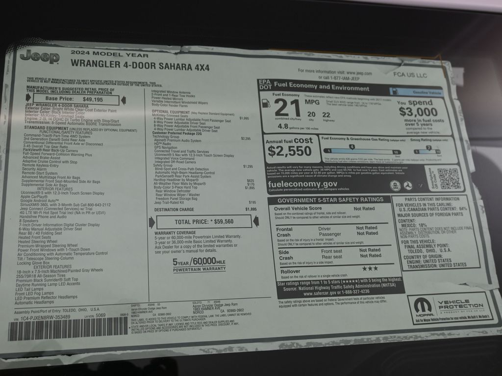 2024 Jeep Wrangler Sahara Bright White Clearcoat Dealer Discount of $9,530 off MSRPExplore the latest models from Chrysler, Dodge, Jeep, and Ram at Aaron CDJR of Norco. Whether you're looking for a rugged Jeep Wrangler, a powerful Ram truck, or a sleek Chrysler sedan, our vast inventory has something for everyone. Experience exceptional customer service and find the perfect vehicle to match your lifestyle.20/22 City/Highway MPG 4WD 8-Speed Automatic 2.0L I4 DOHC Price includes: $3000 - 2024 Bonus Cash . Exp. 03/03/2025 $500 - 2024 National Presidents Day Bonus Cash . Exp. 03/03/2025