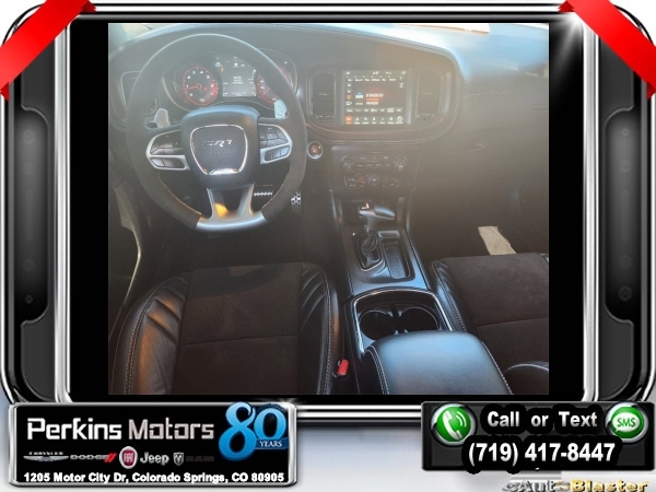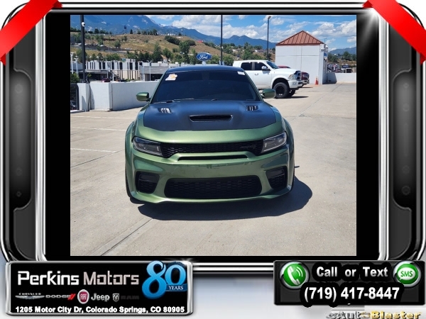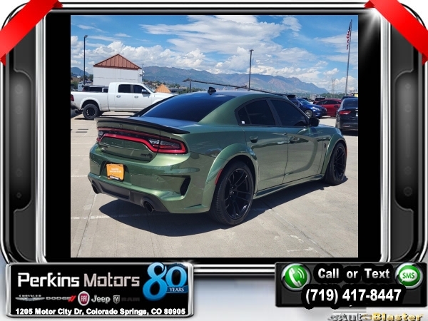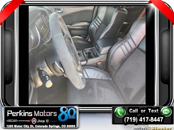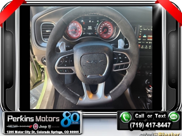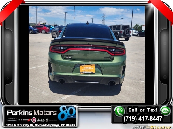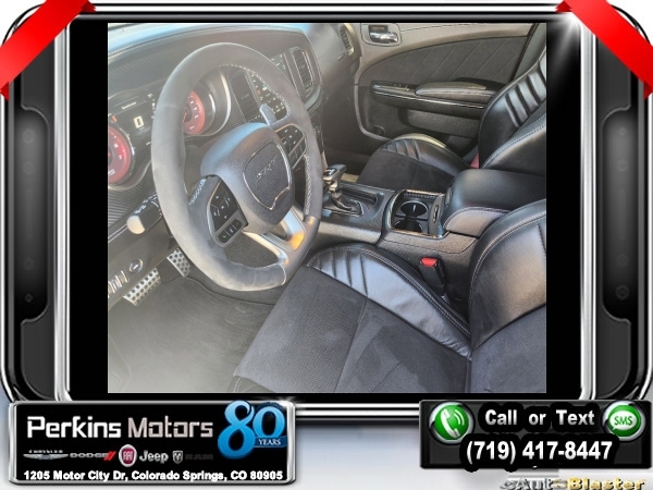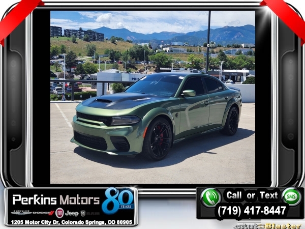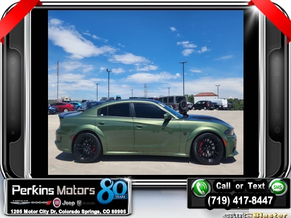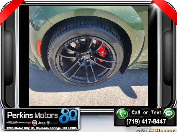F8 Green RWD V8 8-Speed Automatic<br><br>Black Artificial Leather.<br><br><br>CARFAX One-Owner. Clean CARFAX.<br><br>Check us out at www.perkinsmotors.com to see our specials! Since opening our doors in 1944, we’ve been proud to serve Colorado Springs, CO, and the surrounding areas of Pueblo, Castle Rock and Denver, CO. Throughout this time of being family owned for 80 years, we’ve maintained a firm commitment to our customers: to offer a wide selection of New Chrysler, Dodge, Fiat, Jeep, and Ram vehicles and quality pre-owned vehicles, and provide a quick, no-hassle car-buying process that ensures everyone drives off the lot satisfied with their purchase.<br><br><br>Alcantara Interior Package (Alcantara Steering Wheel - Red LED, Alcantara/Laguna Seats w/Logo, and Heated Front Seats), Carbon/Suede Interior Package (Real Carbon Fiber Interior Accents and Suede Headliner), harman/kardon Audio Group (harman/kardon GreenEdge Amp), Quick Order Package 23T SRT Hellcat, SRT Black Package (Black Charger Exhaust Tips and Satin Black Dodge Tail Lamp Badge), Black Artificial Leather, 4-Wheel Disc Brakes, 6 Speakers, ABS brakes, Air Conditioning, Alloy wheels, AM/FM radio: SiriusXM, Anti-whiplash front head restraints, Apple CarPlay, Apple CarPlay/Android Auto, Audio memory, Auto-dimming door mirrors, Auto-dimming Rear-View mirror, Automatic temperature control, Brake assist, Bumpers: body-color, Compass, Cruise Control, Delay-off headlights, Demonic Red Seat Belts, Driver door bin, Driver vanity mirror, Dual front impact airbags, Dual front side impact airbags, Electronic Stability Control, Emergency communication system: SiriusXM Guardian, Four wheel independent suspension, Front anti-roll bar, Front Bucket Seats, Front Center Armrest, Front dual zone A/C, Front reading lights, Fully automatic headlights, Garage door transmitter: HomeLink, Google Android Auto, GPS Antenna Input, Heated door mirrors, Heated front seats, Heated rear seats, Heated steering wheel, Hellcat Logo Laguna Leather Seat, High intensity discharge headlights: Bi-Xenon, Illuminated entry, Integrated Center Stack Radio, Integrated Voice Command w/Bluetooth, Knee airbag, Leather Shift Knob, Low tire pressure warning, Media Hub (2 USB, AUX), Memory seat, Occupant sensing airbag, Outside temperature display, Overhead airbag, Overhead console, Panic alarm, ParkView Rear Back-Up Camera, Passenger door bin, Passenger vanity mirror, Power door mirrors, Power driver seat, Power passenger seat, Power steering, Power windows, Radio: Uconnect 4C w/8.4 Display, Rear anti-roll bar, Rear reading lights, Rear window defroster, Remote keyless entry, Satin Black Hood/Roof/Trunk/Spoiler, Security system, SiriusXM Satellite Radio, Speed-Sensitive Wipers, Split folding rear seat, Spoiler, Sport steering wheel, Steering wheel mounted audio controls, Tachometer, Telescoping steering wheel, Tilt steering wheel, Traction control, Trip computer, USB Host Flip, Variably intermittent wipers, Ventilated front seats, Wheels: 20 x 11 Carbon Black Aluminum, and Wheels: 20 x 11 Carbon Black Aluminum w/27D.