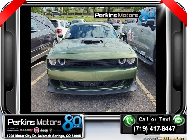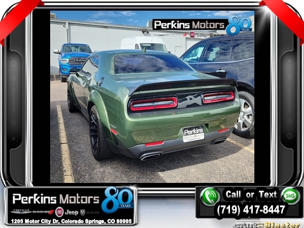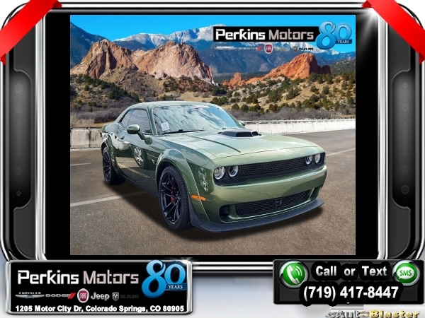 F8 Green RWD V8 8-Speed Automatic<br><br><br>CARFAX One-Owner.<br><br>Check us out at www.perkinsmotors.com to see our specials! Since opening our doors in 1944, we’ve been proud to serve Colorado Springs, CO, and the surrounding areas of Pueblo, Castle Rock and Denver, CO. Throughout this time of being family owned for 80 years, we’ve maintained a firm commitment to our customers: to offer a wide selection of New Chrysler, Dodge, Fiat, Jeep, and Ram vehicles and quality pre-owned vehicles, and provide a quick, no-hassle car-buying process that ensures everyone drives off the lot satisfied with their purchase.<br><br><br>Alpine Audio Group w/Subwoofer, Driver Convenience Group (Body Color Exterior Mirrors and Exterior Mirrors w/Heating Element), Plus Package, Quick Order Package 24N R/T Scat Pack Widebody (Rhombi 2-Pc Wheel Center Cap), Shaker Package (Dash Plaque and MOPAR Shaker Intake), Technology Group (Auto High Beam Headlamp Control), 1-Yr SiriusXM Guardian Trial, 4-Wheel Disc Brakes, 6 Speakers, 8.4 Touchscreen Display, ABS brakes, Air Conditioning, All Radio Equipped Vehicles, Alloy wheels, AM/FM radio: SiriusXM, Anti-whiplash front head restraints, Apple CarPlay, Apple CarPlay/Android Auto, Auto-dimming Rear-View mirror, Automatic temperature control, Brake assist, Bumpers: body-color, Compass, Compass Gauge, Cruise Control, Delay-off headlights, Driver door bin, Driver vanity mirror, Dual front impact airbags, Dual front side impact airbags, Electronic Stability Control, Emergency communication system: SiriusXM Guardian, For Details, Visit DriveUconnect.com, Four wheel independent suspension, Front anti-roll bar, Front Bucket Seats, Front Center Armrest, Front dual zone A/C, Front fog lights, Front reading lights, Fully automatic headlights, Garage door transmitter, Google Android Auto, GPS Antenna Input, GPS Navigation, Heated door mirrors, Heated front seats, Heated steering wheel, Illuminated entry, Integrated Center Stack Radio, Integrated Voice Command w/Bluetooth, Leather Shift Knob, Low tire pressure warning, Media Hub (2 USB, AUX), Outside temperature display, Overhead airbag, Overhead console, Panic alarm, ParkView Rear Back-Up Camera, Passenger door bin, Passenger vanity mirror, Power door mirrors, Power driver seat, Power steering, Power Sunroof, Power windows, Radio data system, Radio: Uconnect 4C Nav w/8.4 Display, Radio: Uconnect 4C w/8.4 Display, Rear anti-roll bar, Rear reading lights, Rear seat center armrest, Rear window defroster, Red Brake Calipers, Remote keyless entry, Scat Pack Logo Houndstooth Seat, Security system, SiriusXM Satellite Radio, Speed-sensing steering, Split folding rear seat, Spoiler, Sport steering wheel, SRT Performance Spoiler, Steering wheel mounted audio controls, Tachometer, Telescoping steering wheel, Tilt steering wheel, Traction control, Trip computer, USB Host Flip, Variably intermittent wipers, Wheels: 20 x 11.0 Carbon Black Aluminum, and Wheels: 20 x 9.0 Lo Gloss Granite CrystaL.