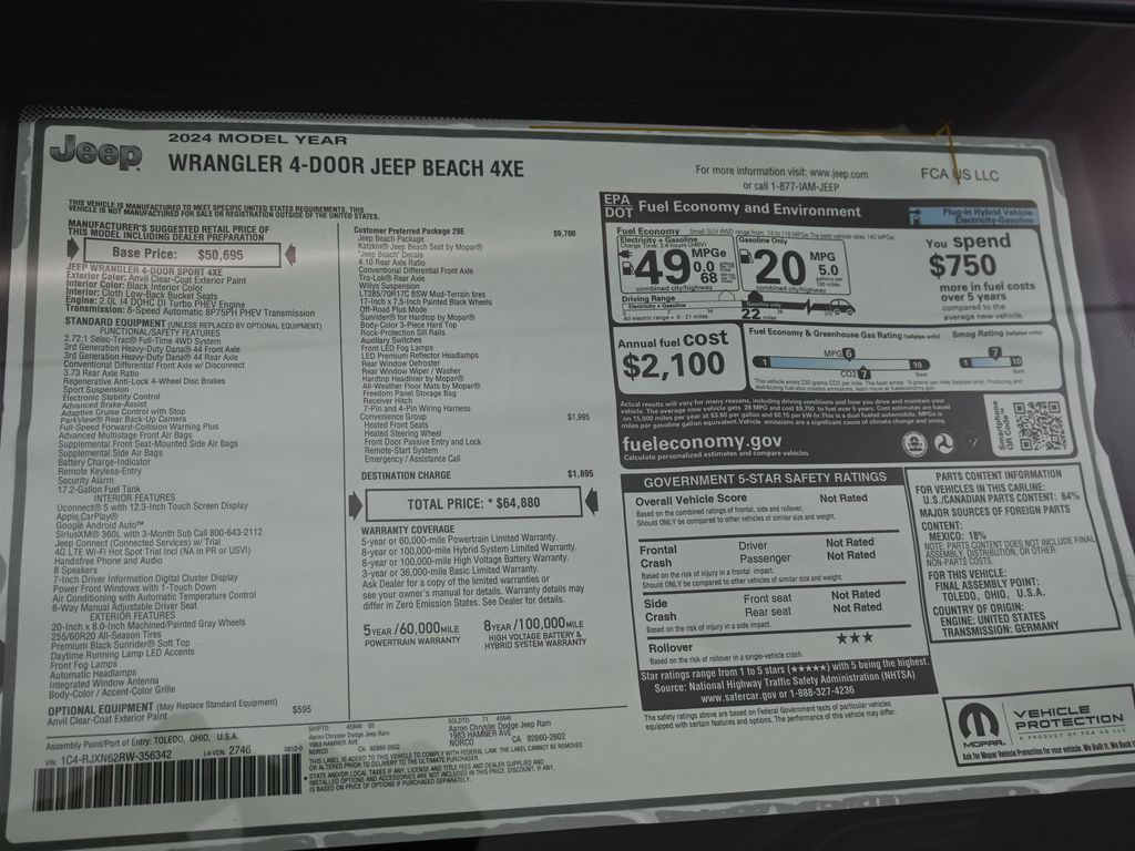 2024 Jeep Wrangler Jeep Beach Anvil Clear Coat Dealer Discount of $6,750 off MSRPExplore the latest models from Chrysler, Dodge, Jeep, and Ram at Aaron CDJR of Norco. Whether you're looking for a rugged Jeep Wrangler, a powerful Ram truck, or a sleek Chrysler sedan, our vast inventory has something for everyone. Experience exceptional customer service and find the perfect vehicle to match your lifestyle.2.0L I4 DOHC, ABS brakes, Alloy wheels, Compass, Electronic Stability Control, Front dual zone A/C, Heated door mirrors, Illuminated entry, Low tire pressure warning, ParkView Rear Back-Up Camera, Passenger door bin, Remote keyless entry, Traction control. 4WD 8-Speed Automatic 2.0L I4 DOHC Price includes: $500 - 2024 National Start Something New Bonus Cash . Exp. 02/03/2025 $7500 - 2024 National Retail Consumer Cash . Exp. 02/03/2025