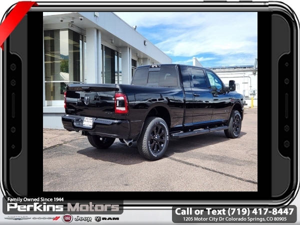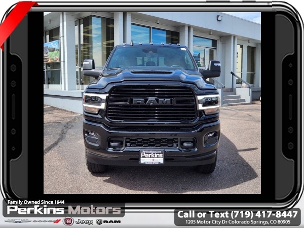 Factory MSRP: $94,770 $11,500 off MSRP! Diamond Black Crystal Pearlcoat 2024 Ram 3500 Laramie 4WD Aisin 6-Speed Automatic 6.7L I6<br><br>Check us out at www.perkinsmotors.com to see our specials! Since opening our doors in 1944, we’ve been proud to serve Colorado Springs, CO, and the surrounding areas of Pueblo, Castle Rock and Denver, CO. Throughout this time of being family owned for 80 years, we’ve maintained a firm commitment to our customers: to offer a wide selection of New Chrysler, Dodge, Fiat, Jeep, and Ram vehicles and quality pre-owned vehicles, and provide a quick, no-hassle car-buying process that ensures everyone drives off the lot satisfied with their purchase.<br><br>Bed Utility Group (LED Bed Lighting and MOPAR Spray In Bedliner), Laramie Level 1 Equipment Group (18 x 8 Polished Aluminum Wheels, 4G LTE Wi-Fi Hot Spot, Alexa Built-In, Apple CarPlay, Auto Power-Folding Mirrors, Blind Spot & Cross Path Detection, Center Hub, Connected Travel & Traffic Services, Connectivity - US/Canada, Disassociated Touchscreen Display, Exterior Mirrors Courtesy Lamps, Exterior Mirrors w/Heating Element, Exterior Mirrors w/Memory, Exterior Mirrors w/Supplemental Signals, Foam Bottle Insert (Door Trim Panel), For Details Visit DriveUconnect.com, For More Info, Call 800-643-2112, Global Telematics Box Module (TBM), Google Android Auto, GPS Antenna Input, GPS Navigation, HD Radio, Integrated Voice Command w/Bluetooth, Mirror Running Lights, Off-Road Information Pages, ParkSense Front/Rear Park Assist System, Power Adjust Mirrors, Power Adjustable Pedals w/Memory, Power Heated Folding Telescopic Mirrors w/Memory, Power-Adjustable Convex Aux Mirrors, Radio: Uconnect 5 Nav w/12.0 Display, Rear Power Sliding Window, Rear Window Defroster, Remote Tailgate Release, Selectable Tire Fill Alert, SiriusXM Radio Service, SiriusXM w/360L, and Trailer Tow Pages), Night Edition (Black Interior Accents, Black Tail Lamp Bezels, Black Wheel Center Hub, Gloss Black Grille Billets/Accents, and Sport Performance Hood), Protection Group, Quick Order Package 21H Laramie, Safety Group (Adaptive Steering System and Lane Keep Assist), Snow Chief Group (Auxiliary Switches Prep, Clearance Lamps, and I/P Mounted Auxiliary Switches), Towing Technology Group (Center Stop Lamp w/Cargo View Camera, Surround View Camera System, and Trailer Reverse Guidance), 10 Speakers, 115V Auxiliary Rear Power Outlet, 2 Way Rear Headrest Seat, 220 Amp Alternator, 3.73 Axle Ratio, 4 Way Front Headrests, 4-Wheel Disc Brakes, 5th Wheel/Gooseneck Towing Prep Group, ABS brakes, Active Noise Control System, Air Conditioning, Alloy wheels, AM/FM radio: SiriusXM with 360L, Apple CarPlay/Android Auto, Auto Level Rear Air Suspension, Auto-dimming Rear-View mirror, Automatic temperature control, Black Exterior Mirrors, Brake assist, Bumpers: body-color, Compass, Cruise Control, Delay-off headlights, Driver door bin, Driver vanity mirror, Dual Alternators Rated At 440 Amps, Dual front impact airbags, Dual front side impact airbags, Electronic Stability Control, Electronically Controlled Throttle, Front anti-roll bar, Front Center Armrest w/Storage, Front dual zone A/C, Front License Plate Bracket, Front reading lights, Front Seat Back Map Pockets, Fully automatic headlights, Garage door transmitter, Heated door mirrors, Heated Front Seats, Heated front seats, Heated Steering Wheel, Heated steering wheel, High Back Seats, Illuminated entry, Leather steering wheel, Leather Trim 40/20/40 Bench Seat, Low tire pressure warning, Manufacturer's Statement of Origin, MOPAR Front & Rear Rubber Floor Mats, Navigation System, Occupant sensing airbag, Outside temperature display, Overhead airbag, Overhead console, Painted Flat Wheel-to-Wheel Side Steps, Panic alarm, ParkView Rear Back-Up Camera, Passenger Sale price includes all manufacture's incentives and dealer discounts. Sale price not available on lease or compatible with special APR. $2500 - 2024 National Truck Month Bonus Cash. Exp. 0