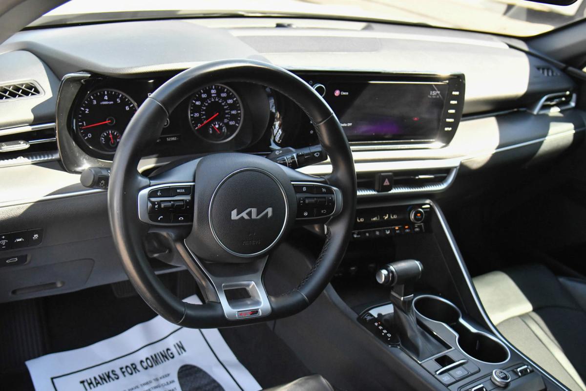 Scores 33 Highway MPG and 25 City MPG! This Kia K5 boasts a Intercooled Turbo Regular Unleaded I-4 1.6 L/98 engine powering this Automatic transmission. WOLF GRAY, REAR BUMPER APPLIQUE, CARPETED FLOOR MATS.*This Kia K5 Features the Following Options *BLACK, CLOTH/LEATHERETTE SEAT TRIM -inc: GT-Line logo, Window Grid Antenna, Wheels: 7.5J x 18 Gloss Black Machined Finish Alloy, Variable Intermittent Wipers, Urethane Gear Shifter Material, Turn-By-Turn Navigation Directions, Trunk Rear Cargo Access, Trip Computer, Transmission: 8-Speed Automatic -inc: drive mode select system, Transmission w/Sequential Shift Control.
