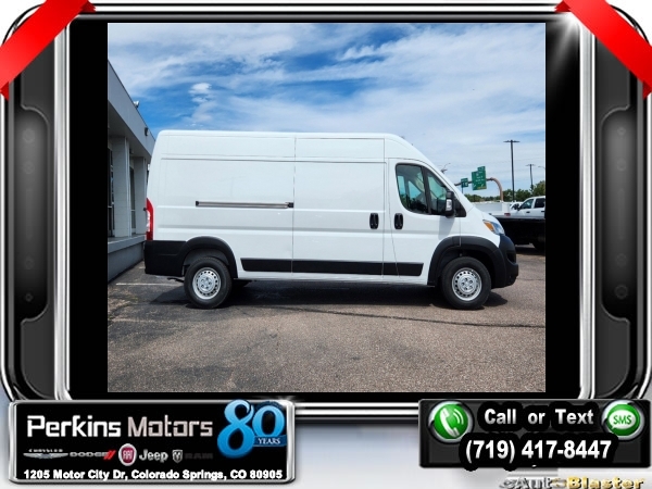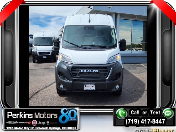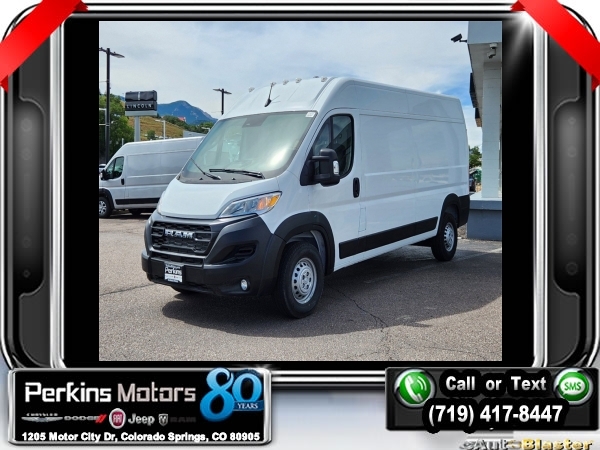 Factory MSRP: $54,870 $10,000 off MSRP! Priced below KBB Fair Purchase Price! Bright White Clearcoat 2024 Ram ProMaster 2500 High Roof FWD 9-Speed 948TE Automatic 3.6L V6 24V VVT<br><br>Check us out at www.perkinsmotors.com to see our specials! Since opening our doors in 1944, we’ve been proud to serve Colorado Springs, CO, and the surrounding areas of Pueblo, Castle Rock and Denver, CO. Throughout this time of being family owned for 80 years, we’ve maintained a firm commitment to our customers: to offer a wide selection of New Chrysler, Dodge, Fiat, Jeep, and Ram vehicles and quality pre-owned vehicles, and provide a quick, no-hassle car-buying process that ensures everyone drives off the lot satisfied with their purchase.<br><br>Convenience Group (Adaptive Cruise Control w/Stop & Go, Exterior Mirrors w/Heating Element, Exterior Mirrors w/Supplemental Signals, Front Fog Lamps, Power Adjust Mirrors, Power Folding/Heated Mirrors, Power-Adjustable Convex Aux Mirrors, Power-Folding Mirrors, and Rear Cargo LED Lamp), Quick Order Package 22B Tradesman w/Pass Seat (4-Way Manual Adjust Front Passenger Seat and Passenger Bucket Seat), 4 Speakers, 4-Wheel Disc Brakes, 4.08 Axle Ratio, ABS brakes, Air Conditioning, AM/FM radio: SiriusXM, Apple CarPlay/Android Auto, Black/Gray Seats, Bodyside moldings, Brake assist, Cargo Partition w/Sliding Window, Cloth Bucket Seats, Driver door bin, Driver Seat Armrest, Driver's Seat Mounted Armrest, Electronic Stability Control, Front anti-roll bar, Front Bucket Seats, Front License Plate Bracket, Front reading lights, Front wheel independent suspension, Heavy Duty Suspension, Illuminated entry, Low tire pressure warning, Manufacturer's Statement of Origin, MOPAR Cargo Compartment Floor Mat, Outside temperature display, Overhead airbag, Overhead console, ParkView Rear Back-Up Camera, Passenger door bin, Power steering, Power windows, Radio: Uconnect 5 w/7 Display, Remote keyless entry, Steering wheel mounted audio controls, Tachometer, Telescoping steering wheel, Traction control, Trip computer, Turn signal indicator mirrors, Variably intermittent wipers, Wheel Center Cap, and Wheels: 16 x 6.0 Steel. Sale price includes all manufacture's incentives and dealer discounts. Sale price not available on lease or compatible with special APR. $2000 - 2024 Bonus Cash . Exp. 09/30/2024 $5,000 - Exp. 09/30/2024 $1,000 - Exp. 01/02/2025