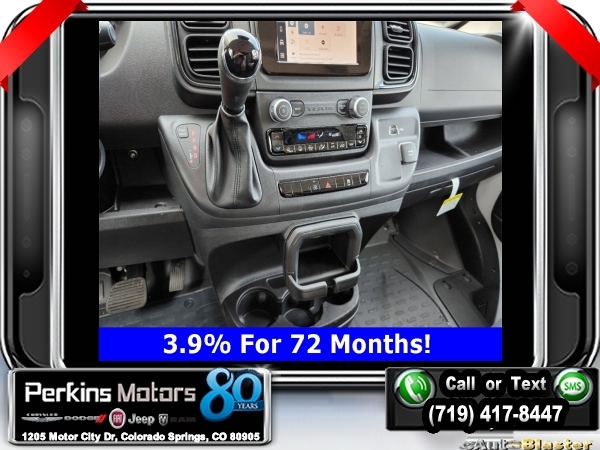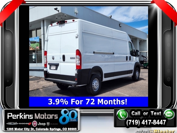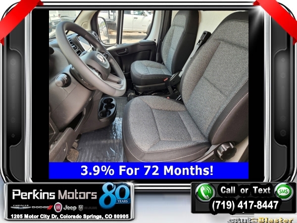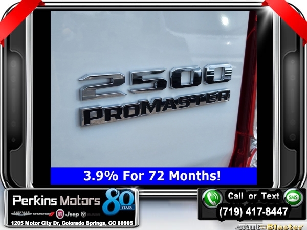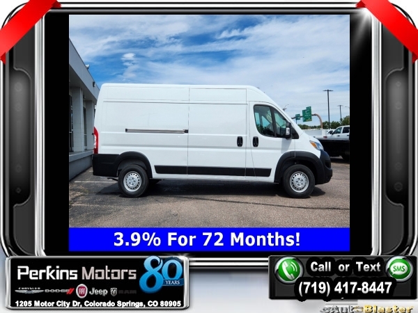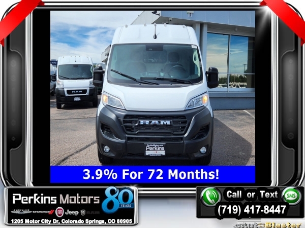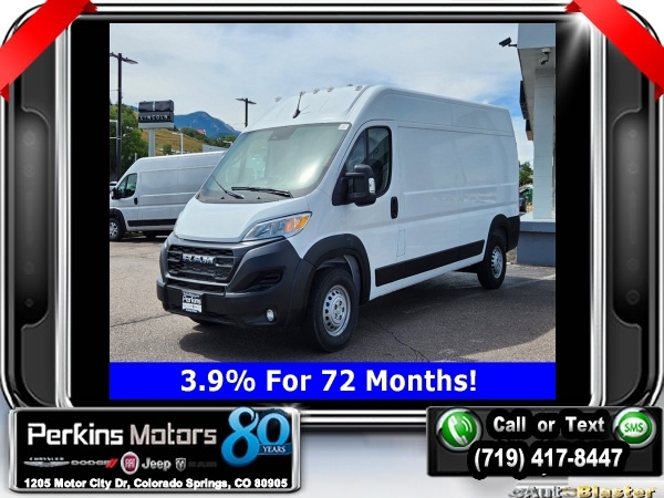 Factory MSRP: $54,870 $11,000 off MSRP! Priced below KBB Fair Purchase Price! Bright White Clearcoat 2024 Ram ProMaster 2500 High Roof FWD 9-Speed 948TE Automatic 3.6L V6 24V VVT<br><br>Check us out at www.perkinsmotors.com to see our specials! Since opening our doors in 1944, we’ve been proud to serve Colorado Springs, CO, and the surrounding areas of Pueblo, Castle Rock and Denver, CO. Throughout this time of being family owned for 80 years, we’ve maintained a firm commitment to our customers: to offer a wide selection of New Chrysler, Dodge, Fiat, Jeep, and Ram vehicles and quality pre-owned vehicles, and provide a quick, no-hassle car-buying process that ensures everyone drives off the lot satisfied with their purchase.<br><br>Convenience Group (Adaptive Cruise Control w/Stop & Go, Exterior Mirrors w/Heating Element, Exterior Mirrors w/Supplemental Signals, Front Fog Lamps, Power Adjust Mirrors, Power Folding/Heated Mirrors, Power-Adjustable Convex Aux Mirrors, Power-Folding Mirrors, and Rear Cargo LED Lamp), Quick Order Package 22B Tradesman w/Pass Seat (4-Way Manual Adjust Front Passenger Seat and Passenger Bucket Seat), 4 Speakers, 4-Wheel Disc Brakes, 4.08 Axle Ratio, ABS brakes, Air Conditioning, AM/FM radio: SiriusXM, Apple CarPlay/Android Auto, Black/Gray Seats, Bodyside moldings, Brake assist, Cargo Partition w/Sliding Window, Cloth Bucket Seats, Driver door bin, Driver Seat Armrest, Driver's Seat Mounted Armrest, Electronic Stability Control, Front anti-roll bar, Front Bucket Seats, Front License Plate Bracket, Front reading lights, Front wheel independent suspension, Heavy Duty Suspension, Illuminated entry, Low tire pressure warning, Manufacturer's Statement of Origin, MOPAR Cargo Compartment Floor Mat, Outside temperature display, Overhead airbag, Overhead console, ParkView Rear Back-Up Camera, Passenger door bin, Power steering, Power windows, Radio: Uconnect 5 w/7 Display, Remote keyless entry, Steering wheel mounted audio controls, Tachometer, Telescoping steering wheel, Traction control, Trip computer, Turn signal indicator mirrors, Variably intermittent wipers, Wheel Center Cap, and Wheels: 16 x 6.0 Steel. Sale price includes all manufacture's incentives and dealer discounts. Sale price not available on lease or compatible with special APR. $5000 - 2024 Bonus Cash . Exp. 10/31/2024 $1,000 - Exp. 01/02/2025