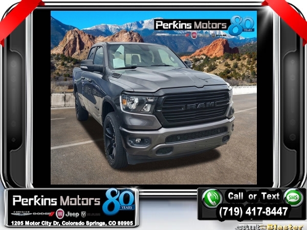 Granite Crystal Metallic Clearcoat 4WD HEMI 5.7L V8 Multi Displacement VVT 8-Speed Automatic<br><br>115V Auxiliary Power Outlet, 115V Auxiliary Rear Power Outlet, 3.92 Rear Axle Ratio, Air Conditioning ATC w/Dual Zone Control, Anti-Spin Differential Rear Axle, Auto-Dimming Exterior Driver Mirror, Auto-Dimming Rear-View Mirror, Big Horn Badge, Big Horn Level 2 Equipment Group, Black Exterior Truck Badging, Black Headlamp Bezels, Black Interior Accents, Black Premium Power Mirrors, Body Color Front Bumper, Body Color Rear Bumper w/Step Pads, Class IV Receiver Hitch, Cluster 7.0 TFT Color Display, Deluxe Cloth Bucket Seats, Dual Exhaust w/Black Tips, Exterior Mirrors Courtesy Lamps, Exterior Mirrors w/Memory, Exterior Mirrors w/Supplemental Signals, Foam Bottle Insert (Door Trim Panel), For More Info, Call 800-643-2112, Glove Box Lamp, Heated Front Seats, Heated Steering Wheel, Media Hub w/2 Charge Only USBs, Night Edition, ParkSense Front/Rear Park Assist w/Stop, ParkView Rear Back-Up Camera, Power 4-Way Driver Lumbar Adjust, Power 8-Way Driver Seat, Power Adjustable Pedals, Power-Folding Mirrors, Quick Order Package 25Z Big Horn, Radio: Uconnect 4 w/8.4 Display, Rear Dome w/On/Off Switch Lamp, Rear Power Sliding Window, Rear Window Defroster, Security Alarm, SiriusXM Radio Service, Sun Visors w/Illuminated Vanity Mirrors, Universal Garage Door Opener, Wheels: 20 x 9.0 Premium Paint/Polished.<br><br><br>CARFAX One-Owner. Clean CARFAX.<br><br>Check us out at www.perkinsmotors.com to see our specials! Since opening our doors in 1944, we’ve been proud to serve Colorado Springs, CO, and the surrounding areas of Pueblo, Castle Rock and Denver, CO. Throughout this time of being family owned for 80 years, we’ve maintained a firm commitment to our customers: to offer a wide selection of New Chrysler, Dodge, Fiat, Jeep, and Ram vehicles and quality pre-owned vehicles, and provide a quick, no-hassle car-buying process that ensures everyone drives off the lot satisfied with their purchase.<br><br><br>Big Horn Level 2 Equipment Group (115V Auxiliary Power Outlet, 115V Auxiliary Rear Power Outlet, Air Conditioning ATC w/Dual Zone Control, Auto-Dimming Exterior Driver Mirror, Auto-Dimming Rear-View Mirror, Black Premium Power Mirrors, Class IV Receiver Hitch, Cluster 7.0 TFT Color Display, Exterior Mirrors Courtesy Lamps, Exterior Mirrors w/Supplemental Signals, Foam Bottle Insert (Door Trim Panel), For More Info, Call 800-643-2112, Glove Box Lamp, Heated Front Seats, Heated Steering Wheel, Media Hub w/2 Charge Only USBs, ParkSense Front/Rear Park Assist w/Stop, Power 4-Way Driver Lumbar Adjust, Power 8-Way Driver Seat, Power Adjustable Pedals, Power-Folding Mirrors, Rear Dome w/On/Off Switch Lamp, Rear Power Sliding Window, Rear Window Defroster, Security Alarm, SiriusXM Radio Service, Sun Visors w/Illuminated Vanity Mirrors, Universal Garage Door Opener, and 400W Inverter), Night Edition (Anti-Spin Differential Rear Axle, Black Exterior Truck Badging, Black Headlamp Bezels, Black Interior Accents, Body Color Front Bumper, Body Color Rear Bumper w/Step Pads, Deluxe Cloth Bucket Seats, Dual Exhaust w/Black Tips, Exterior Mirrors w/Memory, Wheels: 20 x 9.0 Premium Paint/Polished, 3 Rear Seat Head Restraints, 4 Way Front Headrests, Center Console Parts Module, Front Seat Back Map Pockets, Manual Adjust 4-Way Front Passenger Seat, and Rear 60/40 Folding Seat), Quick Order Package 25Z Big Horn (Big Horn Badge), 3.92 Rear Axle Ratio, ParkView Rear Back-Up Camera, Radio: Uconnect 4 w/8.4 Display, 4-Wheel Disc Brakes, 40/20/40 Split Bench Seat, 48V Belt Starter Generator, 6 Speakers, ABS brakes, Air Conditioning, Alloy wheels, AM/FM radio, Black Exterior Mirrors, Brake assist, Bumpers: chrome, Cloth Bench Seat, Compass, Cruise Control, Delay-off headlights, Driver door bin, Dual front impact airbags, Dual front side impact airbags, Electronic Stability Control, Front anti-roll bar, Front Center Armrest w/Storage, Front fog lights, Front