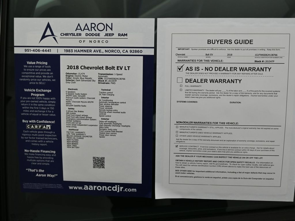Priced below KBB Fair Purchase Price!NEW FILTERS, Bolt EV LT, 4D Wagon, Electric Motor, 1-Speed Automatic, FWD, 6-Speaker Audio System, Alloy wheels, Apple CarPlay/Android Auto, Compass, Exterior Parking Camera Rear, Knee airbag, Low tire pressure warning, Overhead airbag, Preferred Equipment Group 2LT, Premium audio system: Chevrolet MyLink, Radio: Chevrolet MyLink AM/FM Stereo, SiriusXM Satellite Radio.For help with any Vehicle needs please call us directly at 951-621-1288.Clean CARFAX.CARFAX One-Owner.Awards: * Ward's 10 Best Engines * 2018 KBB.com 10 Most Awarded Brands