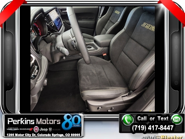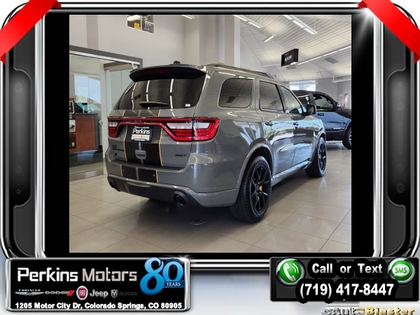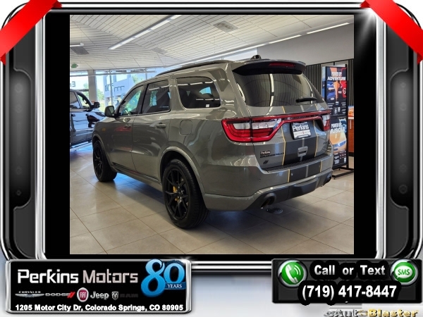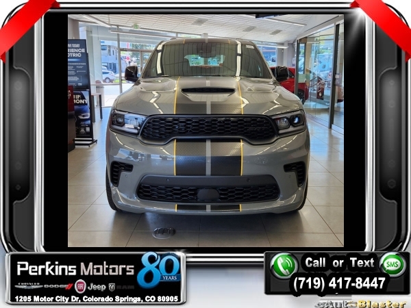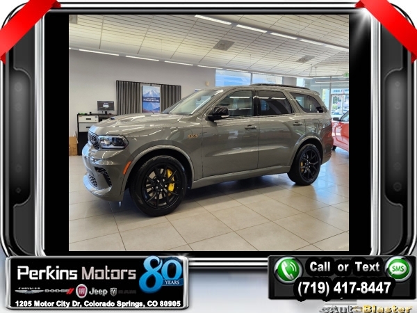 Factory MSRP: $91,785 $9,250 off MSRP! Destroyer Gray Clearcoat 2024 Dodge Durango SRT 392 AWD 8-Speed Automatic SRT HEMI 6.4L V8 MDS<br>AWD.<br>Check us out at www.perkinsmotors.com to see our specials! Since opening our doors in 1944, we’ve been proud to serve Colorado Springs, CO, and the surrounding areas of Pueblo, Castle Rock and Denver, CO. Throughout this time of being family owned for 80 years, we’ve maintained a firm commitment to our customers: to offer a wide selection of New Chrysler, Dodge, Fiat, Jeep, and Ram vehicles and quality pre-owned vehicles, and provide a quick, no-hassle car-buying process that ensures everyone drives off the lot satisfied with their purchase.<br><br>AWD, 3.70 Rear Axle Ratio, 3rd row seats: split-bench, 4-Wheel Disc Brakes, 9 Speakers, ABS brakes, Adaptive suspension, Air Conditioning, Alloy wheels, AM/FM radio: SiriusXM w/360L, Anti-whiplash front head restraints, Apple CarPlay/Android Auto, Audio memory, Auto High-beam Headlights, Auto-dimming door mirrors, Auto-dimming Rear-View mirror, Automatic temperature control, Brake assist, Bumpers: body-color, Compass, Cruise Control, Delay-off headlights, Driver door bin, Driver vanity mirror, Dual front impact airbags, Dual front side impact airbags, Electronic Stability Control, Emergency communication system, Four wheel independent suspension, Front anti-roll bar, Front Bucket Seats, Front Center Armrest w/Storage, Front dual zone A/C, Front reading lights, Fully automatic headlights, Garage door transmitter, Gloss Black Exterior Mirrors, Heated door mirrors, Heated front seats, Heated rear seats, Heated steering wheel, Illuminated entry, Knee airbag, Leather Shift Knob, Leather steering wheel, Leather Trimmed Bucket Seats, Low tire pressure warning, Memory seat, Navigation system: TomTom, Occupant sensing airbag, Outside temperature display, Overhead airbag, Overhead console, Panic alarm, ParkView Rear Back-Up Camera, Passenger door bin, Passenger vanity mirror, Power door mirrors, Power driver seat, Power Liftgate, Power passenger seat, Power steering, Power windows, Radio data system, Radio: Uconnect 5 Nav w/10.1 Display, Rain sensing wipers, Rear air conditioning, Rear anti-roll bar, Rear reading lights, Rear window defroster, Rear window wiper, Remote keyless entry, Security system, Speed-sensing steering, Speed-Sensitive Wipers, Split folding rear seat, Spoiler, Sport steering wheel, Steering wheel mounted audio controls, Tachometer, Telescoping steering wheel, Tilt steering wheel, Traction control, Trip computer, Turn signal indicator mirrors, Variably intermittent wipers, Ventilated front seats, Voltmeter, and Wheels: 20 x 10 Hyper Black Aluminum. Sale price includes all manufacture's incentives and dealer discounts. Sale price not available on lease or compatible with special APR. $4000 - 2024 National Engine Bonus Cash. Exp. 12/02/2024 $4750 - 2024 National Power Dollars Retail Bonus Cash . Exp. 12/02/2024 $500 - 2024 National Black Friday Bonus Cash . Exp. 12/02/2024