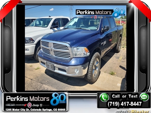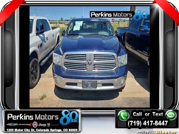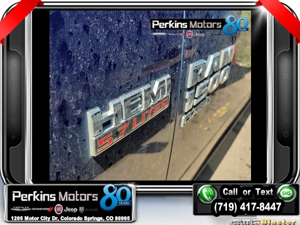 True Blue Pearlcoat 4WD HEMI 5.7L V8 Multi Displacement VVT 8-Speed Automatic<br><br><br>Clean CARFAX.<br><br>Check us out at www.perkinsmotors.com to see our specials! Since opening our doors in 1944, we’ve been proud to serve Colorado Springs, CO, and the surrounding areas of Pueblo, Castle Rock and Denver, CO. Throughout this time of being family owned for 80 years, we’ve maintained a firm commitment to our customers: to offer a wide selection of New Chrysler, Dodge, Fiat, Jeep, and Ram vehicles and quality pre-owned vehicles, and provide a quick, no-hassle car-buying process that ensures everyone drives off the lot satisfied with their purchase.<br><br><br>Big Horn Regional Package, Heated Seats & Wheel Group (Heated Front Seats), Quick Order Package 26S Big Horn (40/20/40 Split Bench Seat, Auto-Dimming Exterior Mirrors, Auto-Dimming Rear-View Mirror, Electric Shift-On-Demand Transfer Case, Front Armrest w/3 Cupholders, GPS Antenna Input, Integrated Voice Command w/Bluetooth, LED Bed Lighting, Remote USB Port - Charge Only, Storage Tray, and Wheels: 20 x 8 Aluminum Chrome Clad), 3.21 Rear Axle Ratio, 4-Wheel Disc Brakes, 6 Speakers, ABS brakes, Active Grille Shutters, Air Conditioning, Alloy wheels, AM/FM radio: SiriusXM, Anti-Spin Differential Rear Axle, Black Exterior Mirrors, Brake assist, Bumpers: chrome, Center Hub, Compass, Cruise Control, Delay-off headlights, Driver door bin, Dual front impact airbags, Dual front side impact airbags, Electronic Shift, Electronic Stability Control, Exterior Mirrors w/Heating Element, Front anti-roll bar, Front Center Armrest w/Storage, Front reading lights, Front wheel independent suspension, Fully automatic headlights, Heated door mirrors, Illuminated entry, Low tire pressure warning, Manufacturer's Statement of Origin, Occupant sensing airbag, Outside temperature display, Overhead airbag, Overhead console, Panic alarm, ParkView Rear Back-Up Camera, Passenger door bin, Passenger vanity mirror, Power door mirrors, Power steering, Power windows, Radio data system, Rear anti-roll bar, Rear seat center armrest, Rear step bumper, Remote keyless entry, Tachometer, Tilt steering wheel, Tip Start, Traction control, Trip computer, Variably intermittent wipers, and Voltmeter.