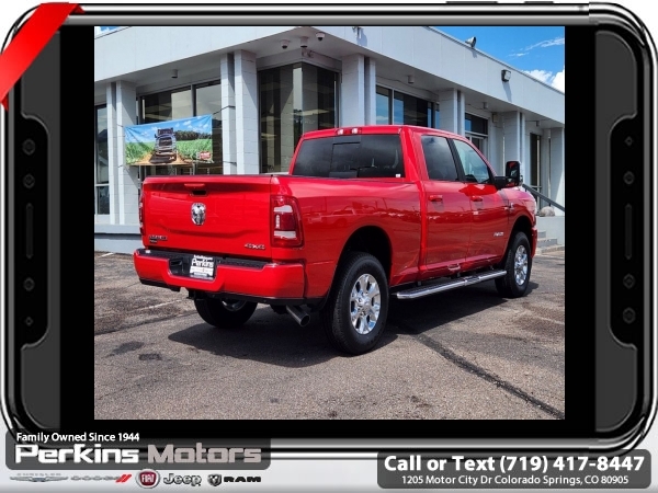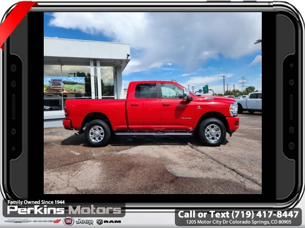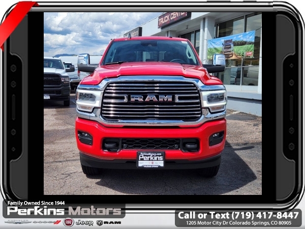 Factory MSRP: $83,430 $14,578 off MSRP! Priced below KBB Fair Purchase Price! Flame Red Clearcoat 2024 Ram 2500 Laramie 4WD 6-Speed Automatic Cummins 6.7L I6 Turbodiesel<br><br>Check us out at www.perkinsmotors.com to see our specials! Since opening our doors in 1944, we’ve been proud to serve Colorado Springs, CO, and the surrounding areas of Pueblo, Castle Rock and Denver, CO. Throughout this time of being family owned for 80 years, we’ve maintained a firm commitment to our customers: to offer a wide selection of New Chrysler, Dodge, Fiat, Jeep, and Ram vehicles and quality pre-owned vehicles, and provide a quick, no-hassle car-buying process that ensures everyone drives off the lot satisfied with their purchase.<br><br>Cold Weather Group (Engine Block Heater and MOPAR Winter Front Grille Cover), Heavy Duty Snow Plow Prep Group (220 Amp Alternator), Laramie Level B Equipment Group (12 Touchscreen Display, 17 Speaker harman/kardon Premium Sound, 2nd Row In Floor Storage Bins, 4G LTE Wi-Fi Hot Spot, Alexa Built-In, Apple CarPlay, Auto Adjust In Reverse Exterior Mirrors, Auto Dim Exterior Mirror, Auto High Beam Headlamp Control, Auto Power-Folding Mirrors, Auto-Dimming Exterior Passenger Mirror, Blind Spot & Cross Path Detection, Center Hub, Chrome Exterior Mirrors, Connected Travel & Traffic Services, Connectivity - US/Canada, Disassociated Touchscreen Display, Exterior Mirrors Courtesy Lamps, Exterior Mirrors w/Heating Element, Exterior Mirrors w/Memory, Exterior Mirrors w/Supplemental Signals, Foam Bottle Insert (Door Trim Panel), For Details, Visit DriveUconnect.com, For More Info, Call 800-643-2112, Forward & Reverse Utility Lights, Front LED Fog Lamps, Global Telematics Box Module (TBM), Google Android Auto, GPS Antenna Input, GPS Navigation, HD Radio, Heated Second Row Seats, Integrated Voice Command w/Bluetooth, LED Reflector Headlamps, LED Tail Lamps, Mirror Running Lights, Off-Road Information Pages, ParkSense Front/Rear Park Assist System, Power Adjust Mirrors, Power Adjustable Convex Aux Mirrors, Power Adjustable Pedals w/Memory, Power Heated Fold Telescopic Mirrors w/Memory, Power Telescoping Mirrors, Radio: Uconnect 5 Nav w/12.0 Display, Rain Sensitive Windshield Wipers, Rear Power Sliding Window, Rear Window Defroster, Remote Tailgate Release, Selectable Tire Fill Alert, SiriusXM Radio Service, SiriusXM w/360L, Trailer Tow Pages, and Wheels: 18 x 8.0 Polished Aluminum), Protection Group (Tow Hooks), Quick Order Package 2HH Laramie, Safety Group (Adaptive Cruise Control w/Stop, Adaptive Steering System, Full Speed Forward Collision Warning Plus, and Lane Keep Assist), 10 Speakers, 115V Auxiliary Rear Power Outlet, 2 Way Rear Headrest Seat, 3.73 Axle Ratio, 4 Way Front Headrests, 4-Wheel Disc Brakes, 5th Wheel/Gooseneck Towing Prep Group, ABS brakes, Active Noise Control System, Air Conditioning, Alloy wheels, AM/FM radio: SiriusXM with 360L, Apple CarPlay/Android Auto, Auto Level Rear Air Suspension, Automatic temperature control, Brake assist, Bumpers: body-color, Chrome Flat Wheel-to-Wheel Side Steps, Compass, Cruise Control, Delay-off headlights, Driver door bin, Driver vanity mirror, Dual front impact airbags, Dual front side impact airbags, Electronic Stability Control, Electronically Controlled Throttle, Front anti-roll bar, Front Center Armrest w/Storage, Front dual zone A/C, Front License Plate Bracket, Front reading lights, Front Seat Back Map Pockets, Fully automatic headlights, Garage door transmitter, Heated door mirrors, Heated Front Seats, Heated front seats, Heated Steering Wheel, Heated steering wheel, Illuminated entry, Leather steering wheel, Leather Trim 40/20/40 Bench Seat, Low tire pressure warning, Manufacturer's Statement of Origin, MOPAR Spray In Bedliner, Navigation System, Occup Sale price includes all manufacture's incentives and dealer discounts. Sale price not available on lease or compatible with special APR. $8126 - 2024 National Minimum Employee Pricing Discount . Exp. 0