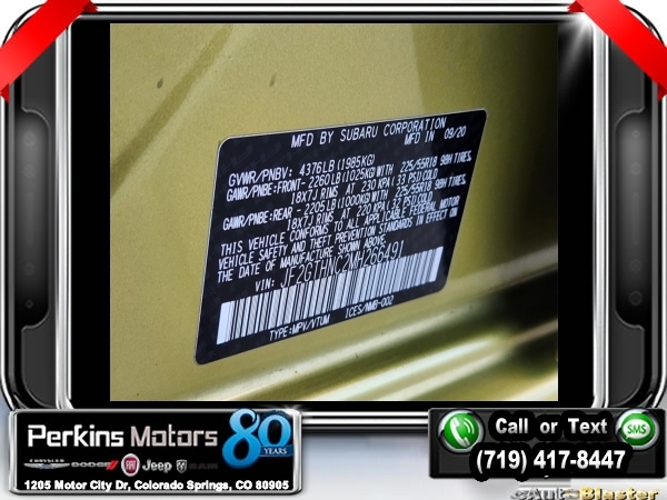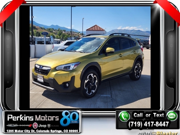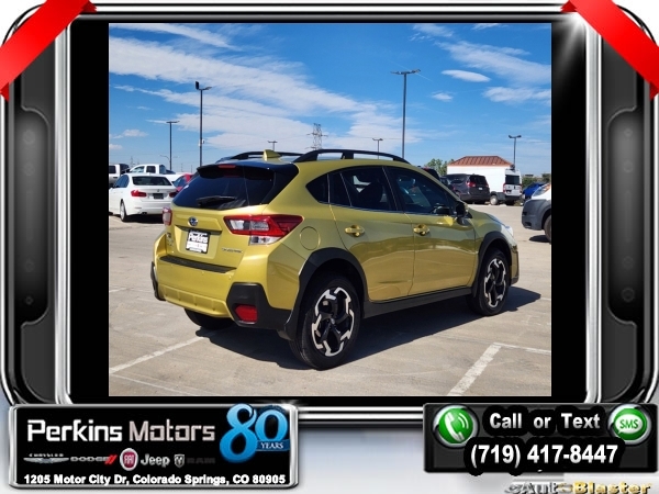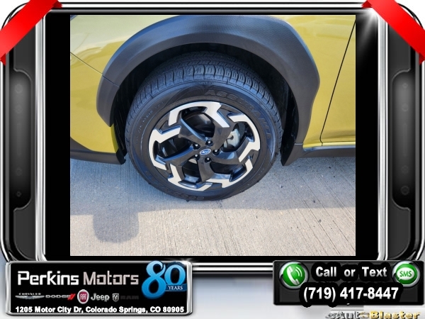 Plasma Yellow Pearl AWD 2.5L DOHC Lineartronic CVT<br><br>harman/kardon Speaker System, Moonroof Package 2, Power Moonroof, Radio: Subaru STARLINK 8.0 Multimedia Nav System, Subaru STARLINK Smartphone Integration.<br><br><br>Check us out at www.perkinsmotors.com to see our specials! Since opening our doors in 1944, we’ve been proud to serve Colorado Springs, CO, and the surrounding areas of Pueblo, Castle Rock and Denver, CO. Throughout this time of being family owned for 80 years, we’ve maintained a firm commitment to our customers: to offer a wide selection of New Chrysler, Dodge, Fiat, Jeep, and Ram vehicles and quality pre-owned vehicles, and provide a quick, no-hassle car-buying process that ensures everyone drives off the lot satisfied with their purchase.<br><br><br>Awards:<br> * ALG Residual Value Awards, Residual Value Awards<br><br>Moonroof Package 2 (harman/kardon Speaker System, Power Moonroof, Radio: Subaru STARLINK 8.0 Multimedia Nav System, and Subaru STARLINK Smartphone Integration), 3.70 Axle Ratio, 4-Wheel Disc Brakes, 6 Speakers, ABS brakes, Air Conditioning, Alloy wheels, AM/FM radio: SiriusXM, Anti-whiplash front head restraints, Auto High-beam Headlights, Auto-Dimming Exterior Mirror w/Approach Light, Auto-Dimming Mirror w/Compass & HomeLink, Automatic temperature control, Brake assist, Bumpers: body-color, CD player, Cruise Control, Driver door bin, Driver vanity mirror, Dual front impact airbags, Dual front side impact airbags, Electronic Stability Control, Emergency communication system: STARLINK Safety and Security (Subscription Required), Exterior Parking Camera Rear, Four wheel independent suspension, Front anti-roll bar, Front Bucket Seats, Front Center Armrest, Front fog lights, Front reading lights, Fully automatic headlights, Heated door mirrors, Heated Front Bucket Seats, Heated front seats, Illuminated entry, Knee airbag, Leather-Trimmed Upholstery, Low tire pressure warning, Occupant sensing airbag, Outside temperature display, Overhead airbag, Overhead console, Panic alarm, Passenger door bin, Passenger vanity mirror, Power door mirrors, Power driver seat, Power steering, Power windows, Radio data system, Radio: Subaru STARLINK 8.0 Multimedia Plus System, Rear anti-roll bar, Rear Bumper Cover, Rear seat center armrest, Rear Seatback Protector, Rear window defroster, Rear window wiper, Remote keyless entry, Roof rack: rails only, Security system, Speed-sensing steering, Splash Guards, Split folding rear seat, Spoiler, STARLINK/Apple CarPlay/Android Auto, Steering wheel mounted audio controls, Tachometer, Telescoping steering wheel, Tilt steering wheel, Traction control, Trip computer, Turn signal indicator mirrors, Variably intermittent wipers, and Wheels: 18 Alloy Machine Finish.