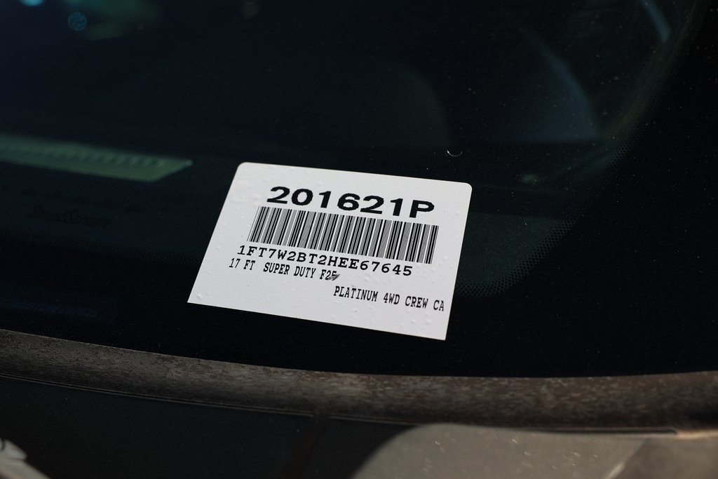 Priced below KBB Fair Purchase Price!BELOW AVERAGE ODOMETER, FRESH OIL CHANGE, NEW FILTERS, NEW WIPERS, F-250SD Platinum, 4D Crew Cab, Power Stroke 6.7L V8 DI 32V OHV Turbodiesel, 4WD, 10 Speakers, 110V/400W Outlet, 20" Polished Aluminum Wheels, Adaptive Cruise Control & Collision Warning, Alloy wheels, CD player, Compass, Exterior Parking Camera Rear, Front dual zone A/C, Front fog lights, GVWR: 10,000 lb Payload Package, Heated front seats, Heated rear seats, Lane-Keeping Alert, Low tire pressure warning, Memory seat, Navigation System, Overhead airbag, Platinum Ultimate Package, Radio: Premium Sony Audio w/Single-CD/MP3 Player, Rear CHMSL Camera, SiriusXM Radio, SYNC 3 Communications & Entertainment System, Twin Panel Power Moonroof, Ultimate Trailer Tow Camera System, Ventilated front seats.For help with any Vehicle needs please call us directly at 951-621-1288.Clean CARFAX.CARFAX One-Owner.Awards: * 2017 KBB.com Brand Image Awards * 2017 KBB.com 10 Most Awarded Brands