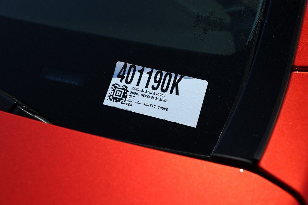 designo Cardinal Red Metallic 2020 Mercedes-Benz GLC GLC 300 Coupe 4MATIC® 4MATIC® 9-Speed Automatic I4 4-Way Lumbar Support, 6 Speakers, Active Blind Spot Assist, Active Lane Keeping Assist, Active Parking Assist, Active Speed Limit Assist, Air Conditioning, Apple CarPlay®/Android Auto®, Augmented Video for Navigation, BAS PLUS w/Cross-Traffic Assist, DISTRONIC PLUS® w/Steering Assist & Stop & Go Pilot, Driver Assistance Package, Driver Assistance Package (23P), Exterior Parking Camera Rear, Fully automatic headlights, HANDS-FREE ACCESS, Heated Front Bucket Seats, Leather Upholstery, Live Traffic, Memory seat, Mercedes-Benz Navigation, Multimedia Package, Navigation Services, Parking Assistance Package, Parking Package, Power Driver Seat & Steering Column w/Memory, Power Liftgate, Power moonroof: Panorama, Power Passenger Seat, PRE-SAFE® PLUS, PRESAFE® Brake w/Pedestrian Recognition, Rear fog lights, Speed Limit Assist, Surround View Camera System, Wheels: 19" 5-Spoke w/Grey Accents.Odometer is 22574 miles below market average! 21/28 City/Highway MPG