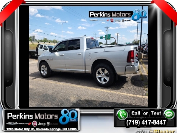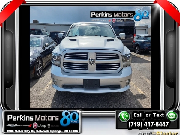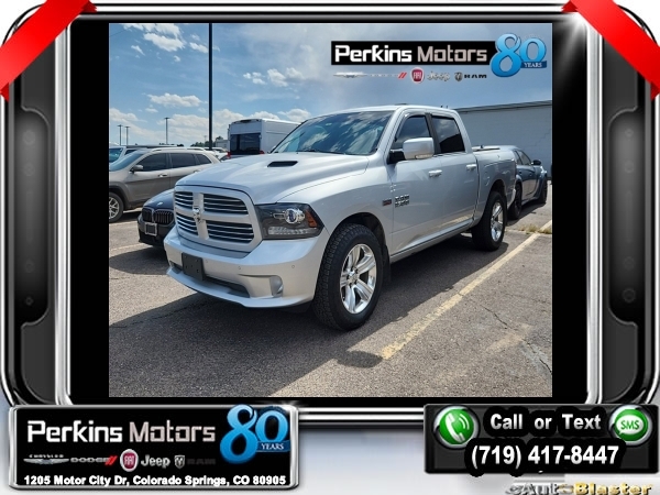 Bright Silver Metallic Clearcoat 4WD HEMI 5.7L V8 Multi Displacement VVT 8-Speed Automatic<br><br>9 Amplified Speakers w/Subwoofer, Auto High Beam Headlamp Control, Convenience Group, GPS Navigation, Keyless Enter-N-Go, Rain Sensitive Windshield Wipers, Remote Proximity Keyless Entry, Remote Start & Security Group, Remote Start System, Security Alarm, Sport Premium Group.<br><br><br>Clean CARFAX.<br><br>Check us out at www.perkinsmotors.com to see our specials! Since opening our doors in 1944, we’ve been proud to serve Colorado Springs, CO, and the surrounding areas of Pueblo, Castle Rock and Denver, CO. Throughout this time of being family owned for 80 years, we’ve maintained a firm commitment to our customers: to offer a wide selection of New Chrysler, Dodge, Fiat, Jeep, and Ram vehicles and quality pre-owned vehicles, and provide a quick, no-hassle car-buying process that ensures everyone drives off the lot satisfied with their purchase.<br><br>Reviews:<br> * If you want the only full-size pickup (so far) with the fuel economy of a smaller-displacement diesel engine yet all the pulling and working power you’d expect, the 2014 Ram 1500 is for you. Source: KBB.com<br> * Supple ride and composed handling; strong gas V6 or fuel-efficient diesel V6 available; available eight-speed automatic transmission improves fuel economy and towing abilities; refined and quiet cabin; useful tech features. Source: Edmunds<br> * Function has never had a more impressive form. The exterior of the 2014 Ram 1500 is re-engineered to look and perform better. With active aerodynamics and an upgraded front fascia, it's both beautiful and powerful. Available RamBox Cargo Management System offers lockable, lighted, drainable storage - perfect for storing tools, gear, and beverages. With new fabrics and leather trim choices for seats the interior of the Ram 1500 feels as good as it looks. From the displays to the stitching, it's the most sophisticated Ram Truck experience yet. The 7-inch premium customizable screen lets you know what's going on inside, outside, and under the hood. With the Uconnect Access System, your truck can do double duty as a mobile office or entertainment center. The available 8.4-inch touchscreen offers available features like interior climate control and 3-D terrain maps. Bluetooth wireless connectivity, voice command, and steering wheel-mounted buttons mean you're always in complete control. Whether it's the legendary power of a 5.7L HEMI V8 or the potent and efficient 3.6L Pentastar V6 with Best-in-Class fuel economy, you'll get the power you need with the fuel efficiency you want. Because Ram Truck is the only pickup manufacturer to achieve 20 HWY MPG across its entire light-duty engine lineup. The Ram 1500 is the only light-duty truck in the U.S. with an available eight-speed transmission offering superior acceleration in low gears. Pair that with a 4-corner air suspension that keeps heavy loads level and you'll keep your payload on the right road. Ram 1500 is equipped with Safety & Security technology. Dynamic front crumple zones and side-impact door beams help absorb impact forces from every angle. The Ram 1500 side occupant protection system includes side-curtain airbags and side-impact door beams. Source: The Manufacturer Summary<br><br><br>Awards:<br> * Motor Trend Automobiles of the year<br><br>Convenience Group (Auto High Beam Headlamp Control, Keyless Enter-N-Go, Rain Sensitive Windshield Wipers, and Remote Proximity Keyless Entry), Remote Start & Security Group (Remote Start System and Security Alarm), Sport Premium Group (9 Amplified Speakers w/Subwoofer), Quick Order Package 26L Sport, GPS Navigation, 1 Yr. Trial (Registration Required), 115V Auxiliary Power Outlet, 1-Yr SIRIUSXM Traffic Service, 1-Yr SIRIUSXM Travel Link Service, 20 x 9 Polished/Painted Aluminum Wheels, 3.21 Rear Axle Ratio, 32 Gallon Fuel Tank, 4-Wheel Disc Brakes, 6 Speakers, ABS brakes, Adjustable pedals, Air Conditioning, Allo