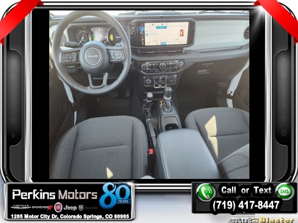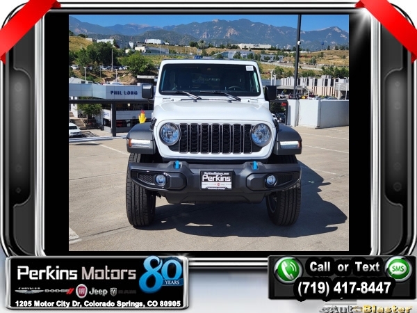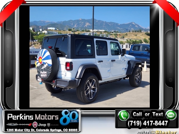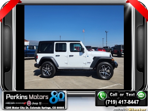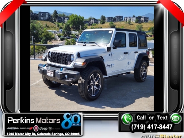 Factory MSRP: $56,450 $14,750 off MSRP! Priced below KBB Fair Purchase Price! Bright White Clearcoat 2024 Jeep Wrangler Sport S 4xe 4WD 8-Speed Automatic 2.0L I4 DOHC<br>2.0L I4 DOHC.<br>Check us out at www.perkinsmotors.com to see our specials! Since opening our doors in 1944, we’ve been proud to serve Colorado Springs, CO, and the surrounding areas of Pueblo, Castle Rock and Denver, CO. Throughout this time of being family owned for 80 years, we’ve maintained a firm commitment to our customers: to offer a wide selection of New Chrysler, Dodge, Fiat, Jeep, and Ram vehicles and quality pre-owned vehicles, and provide a quick, no-hassle car-buying process that ensures everyone drives off the lot satisfied with their purchase.<br><br>Convenience Group (2-Door Passive Entry, Front Door Locks, Heated Steering Wheel, and Universal Garage Door Opener), Quick Order Package 29U Sport S, 2.0L I4 DOHC, 3.73 Rear Axle Ratio, 4-Wheel Disc Brakes, 8 Speakers, ABS brakes, Air Conditioning, Alloy wheels, Apple CarPlay/Android Auto, Automatic temperature control, Black 3-Piece Hard Top, Brake assist, Cloth Low-Back Bucket Seats, Compass, Cruise Control, Delay-off headlights, Driver door bin, Driver vanity mirror, Dual front impact airbags, Dual front side impact airbags, Electronic Stability Control, Front anti-roll bar, Front Bucket Seats, Front Center Armrest w/Storage, Front dual zone A/C, Front fog lights, Front License Plate Bracket, Front reading lights, Fully automatic headlights, Heated door mirrors, Illuminated entry, Integrated roll-over protection, Low tire pressure warning, MOPAR All-Weather Floor Mats, Occupant sensing airbag, Outside temperature display, Overhead airbag, Panic alarm, ParkView Rear Back-Up Camera, Passenger door bin, Passenger vanity mirror, Power door mirrors, Power steering, Power windows, Radio data system, Radio: Uconnect 5 w/12.3 Display, Rear anti-roll bar, Rear reading lights, Remote keyless entry, Security system, Split folding rear seat, Sport Suspension, Steering wheel mounted audio controls, Tachometer, Telescoping steering wheel, Tilt steering wheel, Traction control, Trip computer, Variably intermittent wipers, Voltmeter, and Wheels: 20 x 8 Machined/Painted Gray. Sale price includes all manufacture's incentives and dealer discounts. Sale price not available on lease or compatible with special APR. $3750 - Federal EV Tax Credit. Exp. 12/31/2024 $7500 - 2024 National Retail Consumer Cash . Exp. 10/31/2024