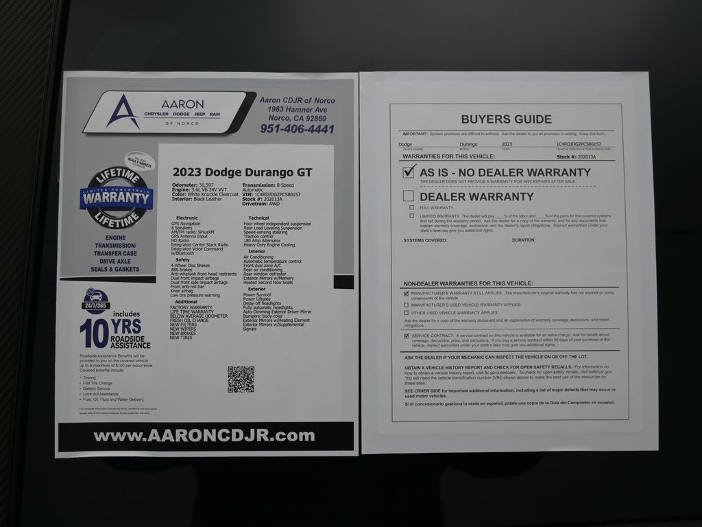 Priced below KBB Fair Purchase Price!FACTORY WARRANTY, LIFE TIME WARRANTY, FRESH OIL CHANGE, NEW FILTERS, NEW WIPERS, Durango GT, 4D Sport Utility, 3.6L V6 24V VVT, 8-Speed Automatic, AWD, 1-Year Trial (Registration Required), 10.1" Touchscreen Display, 115V Auxiliary Power Outlet, 180 Amp Alternator, 3rd row seats: split-bench, 4G LTE Wi-Fi Hot Spot, 7 & 4 Pin Wiring Harness, Adaptive Cruise Control w/Stop, Alloy wheels, Apple CarPlay, Auto-Dimming Exterior Driver Mirror, Black Roof Rails, Class IV Receiver Hitch, Connected Travel & Traffic Services, Disassociated Touchscreen Display, Dual Remote USB Port - Charge Only, Exterior Mirrors w/Heating Element, Exterior Mirrors w/Memory, Exterior Mirrors w/Supplemental Signals, Floor Console w/Leather Armrest, Front dual zone A/C, Full Speed Forward Collision Warning Plus, Gloss Black Exterior Mirrors, Google Android Auto, GPS Antenna Input, GPS Navigation, HD Radio, Heated Second Row Seats, Heavy-Duty Engine Cooling, Integrated Center Stack Radio, Integrated Roof Rail Crossbars, Integrated Voice Command w/Bluetooth, Knee airbag, Leather Trimmed Bucket Seats, Leather Wrapped Door Panels, LED Auxiliary Low Beam & Turn Signal, Low tire pressure warning, ParkView Rear Back-Up Camera, Power 6x9 Multi-Function Foldaway Mirrors, Power 8-Way Driver Memory 8-Way Passenger Seats, Power Driver/Passenger 4-Way Lumbar Adjust, Power Liftgate, Power Sunroof, Power Tilt & Telescopic Steering Column, Premium LED Fog Lamps, Quick Order Package 2BG GT Plus, Radio: Uconnect 5 Nav w/10.1" Display, Radio/Driver Seat/Mirrors Memory, Rear Load Leveling Suspension, Red Accent Stitching, SiriusXM Guardian - Included Trial (B), SiriusXM w/360L, Trailer Brake Control, USB Host Flip, Ventilated Front Seats, Wheels: 20" x 8.0" Fine Silver.For help with any Vehicle needs please call us directly at 951-621-1288.Clean CARFAX.CARFAX One-Owner.