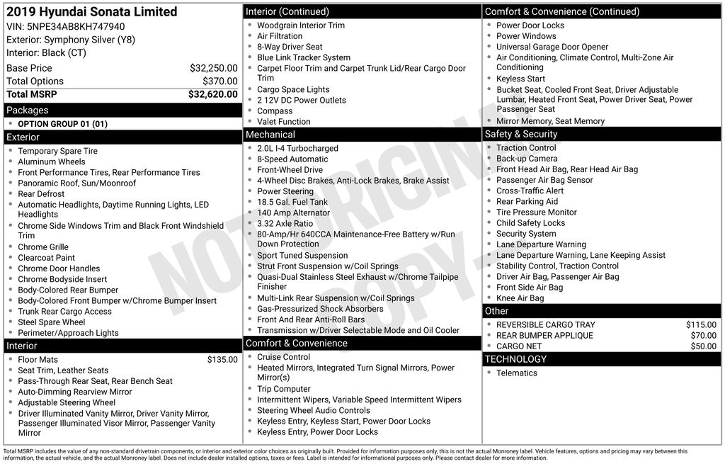 Symphony Silver 2019 Hyundai Sonata Limited FWD 8-Speed Automatic with SHIFTRONIC 2.0L I4 DGI DOHC 16V Turbocharged Black Leather, Exterior Parking Camera Rear, Heated front seats, Navigation System, Option Group 01, Power moonroof, Rear Parking Sensors, Wheels: 18 x 7.5J Dark Aluminum Alloy.Odometer is 27981 miles below market average! 23/32 City/Highway MPGAwards: * JD Power Vehicle Dependability Study (VDS) * 2019 KBB.com 10 Best Sedans Under $30,000 * 2019 KBB.com 10 Most Comfortable Cars Under $30,000