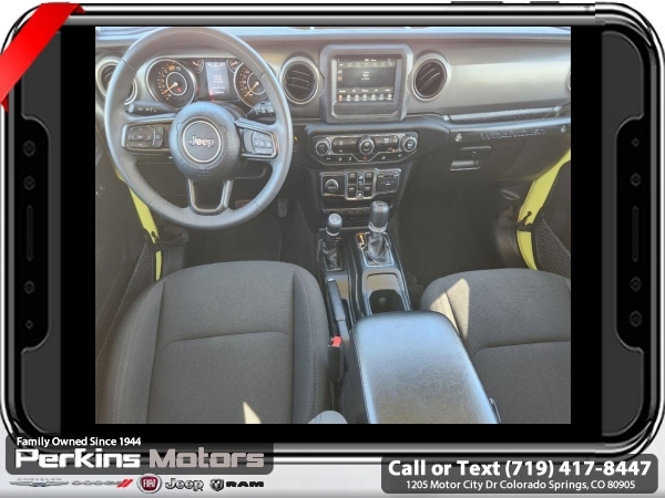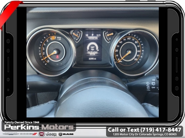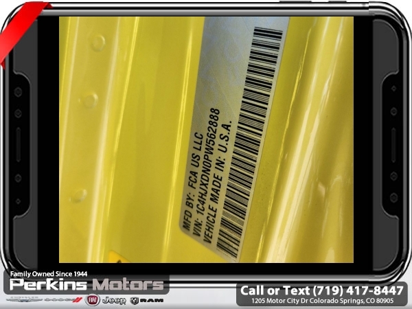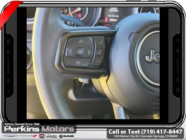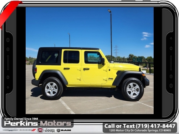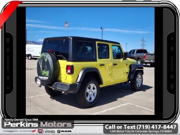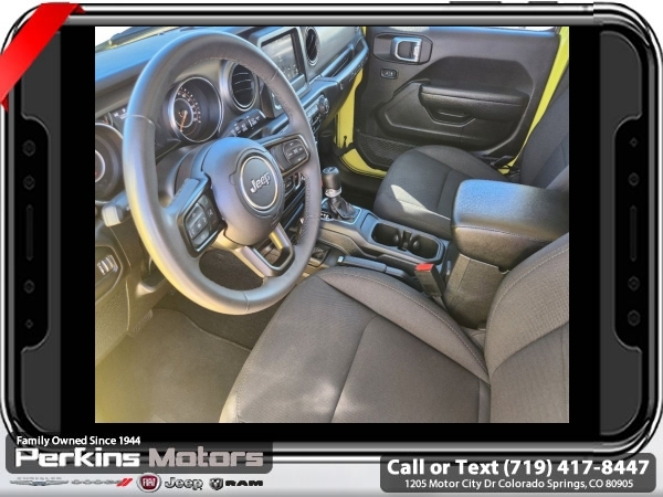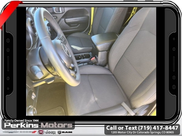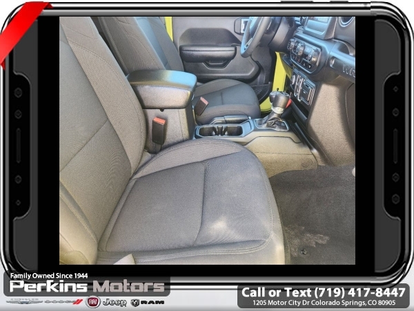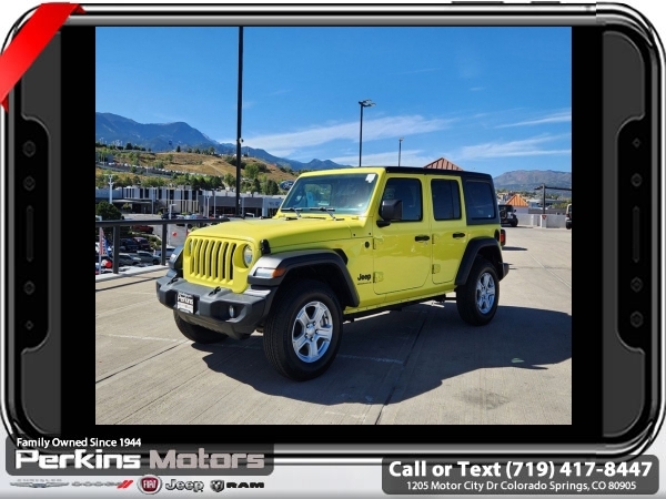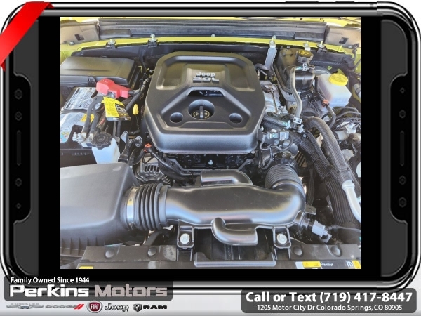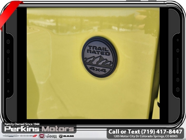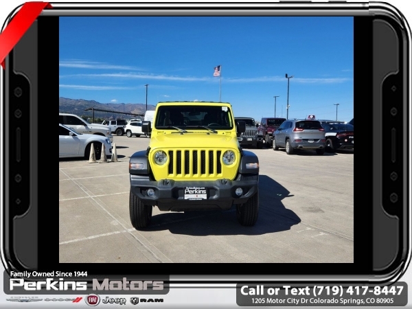 High Velocity Clearcoat 4WD 2.0L I4 DOHC 8-Speed Automatic<br><br><br>CARFAX One-Owner. Clean CARFAX.<br><br>Check us out at www.perkinsmotors.com to see our specials! Since opening our doors in 1944, we’ve been proud to serve Colorado Springs, CO, and the surrounding areas of Pueblo, Castle Rock and Denver, CO. Throughout this time of being family owned for 80 years, we’ve maintained a firm commitment to our customers: to offer a wide selection of New Chrysler, Dodge, Fiat, Jeep, and Ram vehicles and quality pre-owned vehicles, and provide a quick, no-hassle car-buying process that ensures everyone drives off the lot satisfied with their purchase.<br><br><br>Quick Order Package 22S Sport S (Automatic Headlamps, Power Heated Mirrors, Remote Keyless Entry, and Sun Visors w/Illuminated Vanity Mirrors), 3.45 Overall Top Gear Ratio, 4-Wheel Disc Brakes, 8 Speakers, ABS brakes, Air Conditioning, AM/FM radio, Apple CarPlay, Apple CarPlay/Android Auto, Aux Battery, Black 3-Piece Hard Top, Brake assist, Cloth Low-Back Bucket Seats, Compass, Cruise Control, Delay-off headlights, Driver door bin, Driver vanity mirror, Dual front impact airbags, Dual front side impact airbags, Electronic Stability Control, Emergency communication system: SiriusXM Guardian, Engine Oil Cooler, Front anti-roll bar, Front Bucket Seats, Front Center Armrest w/Storage, Front fog lights, Front reading lights, Google Android Auto, GPS Antenna Input, Integrated Center Stack Radio, Integrated roll-over protection, Integrated Voice Command w/Bluetooth, Low tire pressure warning, Non-Lock Fuel Cap w/o Discriminator, Normal Duty Suspension, Occupant sensing airbag, Outside temperature display, ParkView Rear Back-Up Camera, Passenger door bin, Passenger vanity mirror, Power steering, Radio data system, Radio: Uconnect 4 w/7 Display, Rear anti-roll bar, Rear reading lights, Split folding rear seat, Steering wheel mounted audio controls, Stop-Start Dual Battery System, Tachometer, Telescoping steering wheel, Tilt steering wheel, Traction control, Trip computer, USB Host Flip, Variably intermittent wipers, Wheels: 17 x 7.5 Black Steel Styled, and Wheels: 17 x 7.5 Tech Silver Aluminum (DISC)