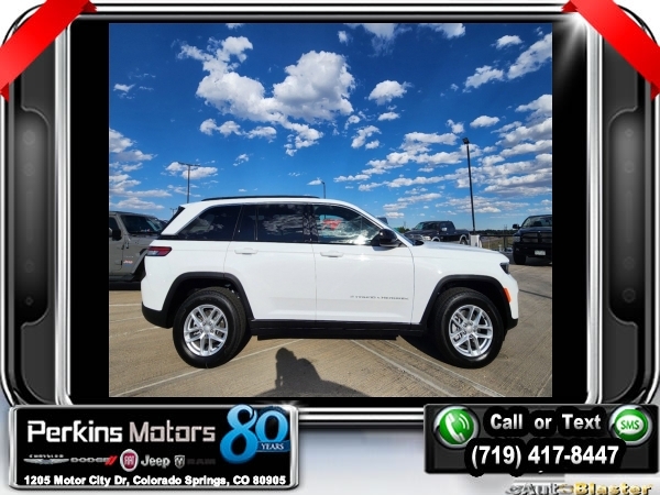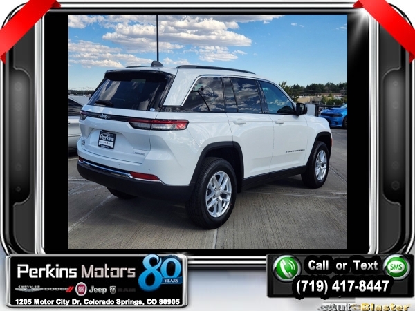 Factory MSRP: $45,370 $7,500 off MSRP! Priced below KBB Fair Purchase Price! Bright White Clearcoat 2024 Jeep Grand Cherokee Laredo 4WD 8-Speed Automatic 3.6L V6 24V VVT<br>4WD.<br>Check us out at www.perkinsmotors.com to see our specials! Since opening our doors in 1944, we’ve been proud to serve Colorado Springs, CO, and the surrounding areas of Pueblo, Castle Rock and Denver, CO. Throughout this time of being family owned for 80 years, we’ve maintained a firm commitment to our customers: to offer a wide selection of New Chrysler, Dodge, Fiat, Jeep, and Ram vehicles and quality pre-owned vehicles, and provide a quick, no-hassle car-buying process that ensures everyone drives off the lot satisfied with their purchase.<br><br>Luxury Tech Group I (Secondary Active Grille Shutters), Quick Order Package 23D Laredo X, Trailer Tow Package (180 Amp Alternator and Heavy-Duty Engine Cooling), 4WD, 3.45 Rear Axle Ratio, 4-Wheel Disc Brakes, 6 Speakers, ABS brakes, Air Conditioning, Alloy wheels, Anti-whiplash front head restraints, Automatic temperature control, Brake assist, Bumpers: body-color, Cloth Seats, Compass, Cruise Control, Delay-off headlights, Driver door bin, Driver vanity mirror, Dual front impact airbags, Dual front side impact airbags, Electronic Stability Control, Emergency communication system, Four wheel independent suspension, Front anti-roll bar, Front Bucket Seats, Front Center Armrest w/Storage, Front dual zone A/C, Front License Plate Bracket, Front reading lights, Fully automatic headlights, Heated door mirrors, Illuminated entry, Knee airbag, Low tire pressure warning, Normal Duty Suspension, Occupant sensing airbag, Outside temperature display, Overhead airbag, Overhead console, Panic alarm, ParkView Rear Back-Up Camera, Passenger door bin, Passenger vanity mirror, Power door mirrors, Power driver seat, Power steering, Power windows, Radio data system, Radio: Uconnect 5 w/8.4 Display, Rear anti-roll bar, Rear reading lights, Rear window defroster, Rear window wiper, Remote keyless entry, Roof rack: rails only, Security system, Speed-Sensitive Wipers, Split folding rear seat, Spoiler, Steering wheel mounted audio controls, Tachometer, Telescoping steering wheel, Tilt steering wheel, Traction control, Trip computer, Variably intermittent wipers, Voltmeter, and Wheels: 17 x 6.5 Fully Painted Aluminum.<br><br>19/26 City/Highway MPG Sale price includes all manufacture's incentives and dealer discounts. Sale price not available on lease or compatible with special APR. $1000 - 2024 Denver BC Retail Consumer Cash. Exp. 10/31/2024 $2500 - 2024 Retail Bonus Cash. Exp. 10/31/2024