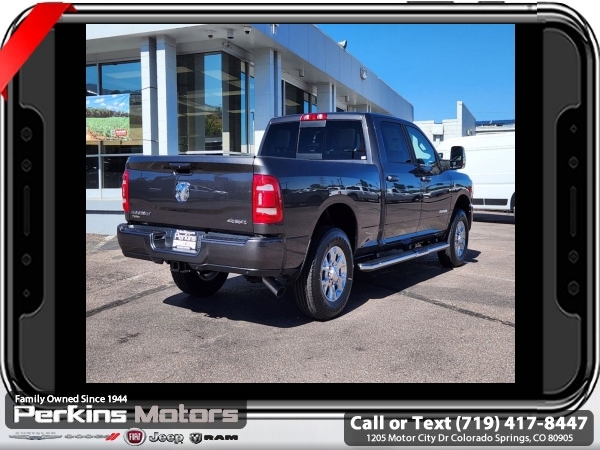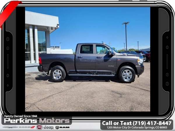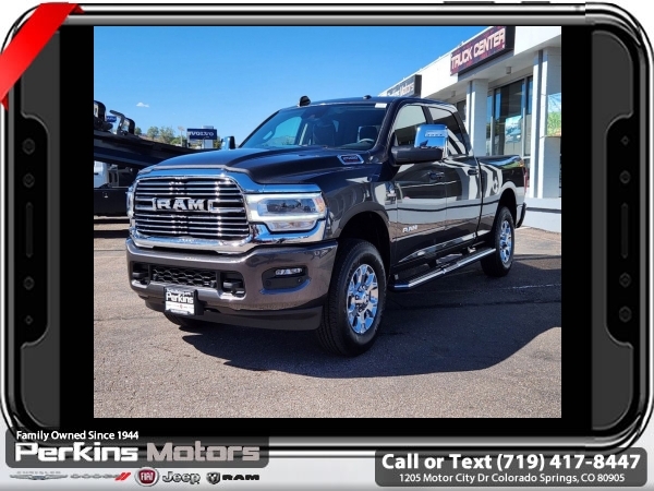 Factory MSRP: $83,725 $14,851 off MSRP! Priced below KBB Fair Purchase Price! Granite Crystal Metallic Clearcoat 2024 Ram 2500 Laramie 4WD 6-Speed Automatic Cummins 6.7L I6 Turbodiesel<br><br>Check us out at www.perkinsmotors.com to see our specials! Since opening our doors in 1944, we’ve been proud to serve Colorado Springs, CO, and the surrounding areas of Pueblo, Castle Rock and Denver, CO. Throughout this time of being family owned for 80 years, we’ve maintained a firm commitment to our customers: to offer a wide selection of New Chrysler, Dodge, Fiat, Jeep, and Ram vehicles and quality pre-owned vehicles, and provide a quick, no-hassle car-buying process that ensures everyone drives off the lot satisfied with their purchase.<br><br>Cold Weather Group (Engine Block Heater and MOPAR Winter Front Grille Cover), Heavy Duty Snow Plow Prep Group (220 Amp Alternator), Laramie Level B Equipment Group (12 Touchscreen Display, 17 Speaker harman/kardon Premium Sound, 2nd Row In Floor Storage Bins, 4G LTE Wi-Fi Hot Spot, Alexa Built-In, Apple CarPlay, Auto Adjust In Reverse Exterior Mirrors, Auto Dim Exterior Mirror, Auto High Beam Headlamp Control, Auto Power-Folding Mirrors, Auto-Dimming Exterior Passenger Mirror, Blind Spot & Cross Path Detection, Center Hub, Chrome Exterior Mirrors, Connected Travel & Traffic Services, Connectivity - US/Canada, Disassociated Touchscreen Display, Exterior Mirrors Courtesy Lamps, Exterior Mirrors w/Heating Element, Exterior Mirrors w/Memory, Exterior Mirrors w/Supplemental Signals, Foam Bottle Insert (Door Trim Panel), For Details, Visit DriveUconnect.com, For More Info, Call 800-643-2112, Forward & Reverse Utility Lights, Front LED Fog Lamps, Global Telematics Box Module (TBM), Google Android Auto, GPS Antenna Input, GPS Navigation, HD Radio, Heated Second Row Seats, Integrated Voice Command w/Bluetooth, LED Reflector Headlamps, LED Tail Lamps, Mirror Running Lights, Off-Road Information Pages, ParkSense Front/Rear Park Assist System, Power Adjust Mirrors, Power Adjustable Convex Aux Mirrors, Power Adjustable Pedals w/Memory, Power Heated Fold Telescopic Mirrors w/Memory, Power Telescoping Mirrors, Radio: Uconnect 5 Nav w/12.0 Display, Rain Sensitive Windshield Wipers, Rear Power Sliding Window, Rear Window Defroster, Remote Tailgate Release, Selectable Tire Fill Alert, SiriusXM Radio Service, SiriusXM w/360L, Trailer Tow Pages, and Wheels: 18 x 8.0 Polished Aluminum), Protection Group (Tow Hooks), Quick Order Package 2HH Laramie, Safety Group (Adaptive Cruise Control w/Stop, Adaptive Steering System, Full Speed Forward Collision Warning Plus, and Lane Keep Assist), 10 Speakers, 115V Auxiliary Rear Power Outlet, 2 Way Rear Headrest Seat, 3.73 Axle Ratio, 4 Way Front Headrests, 4-Wheel Disc Brakes, 5th Wheel/Gooseneck Towing Prep Group, ABS brakes, Active Noise Control System, Air Conditioning, Alloy wheels, AM/FM radio: SiriusXM with 360L, Apple CarPlay/Android Auto, Auto Level Rear Air Suspension, Automatic temperature control, Brake assist, Bumpers: body-color, Chrome Flat Wheel-to-Wheel Side Steps, Compass, Cruise Control, Delay-off headlights, Driver door bin, Driver vanity mirror, Dual front impact airbags, Dual front side impact airbags, Electronic Stability Control, Electronically Controlled Throttle, Front anti-roll bar, Front Center Armrest w/Storage, Front dual zone A/C, Front License Plate Bracket, Front reading lights, Front Seat Back Map Pockets, Fully automatic headlights, Garage door transmitter, Heated door mirrors, Heated Front Seats, Heated front seats, Heated Steering Wheel, Heated steering wheel, Illuminated entry, Leather steering wheel, Leather Trim 40/20/40 Bench Seat, Low tire pressure warning, Manufacturer's Statement of Origin, MOPAR Spray In Bedliner, Navigatio Sale price includes all manufacture's incentives and dealer discounts. Sale price not available on lease or compatible with special APR. $8126 - 2024 National Minimum Employee Pricing Discount . Exp. 0