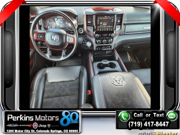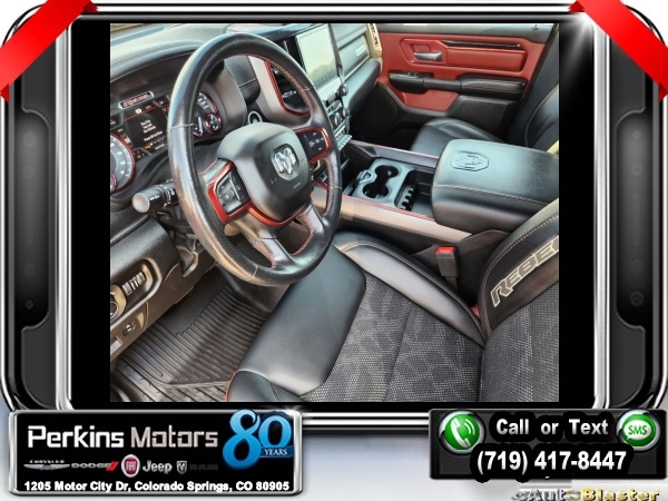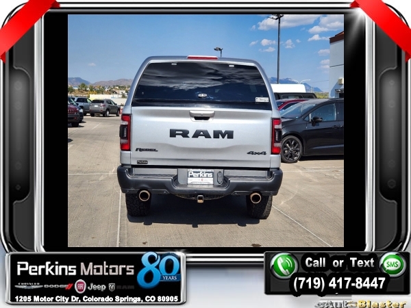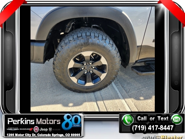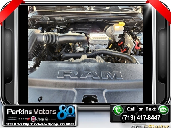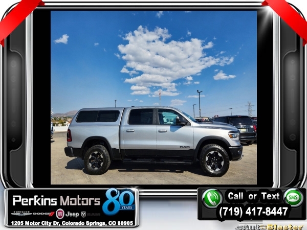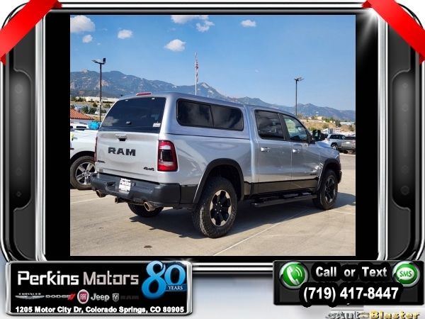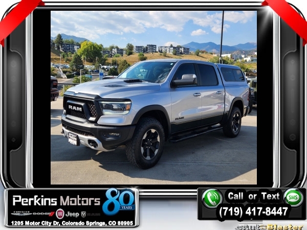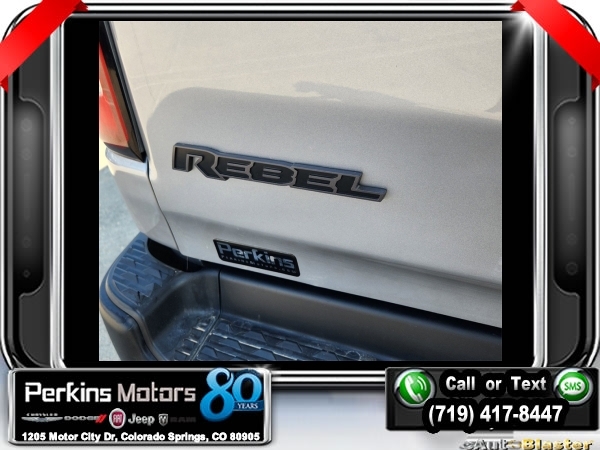 Billet Silver Metallic Clearcoat 4WD HEMI 5.7L V8 Multi Displacement VVT 8-Speed Automatic<br><br>115V Auxiliary Rear Power Outlet, 2 USB Full Function/Charge Only Media Hub, 3.92 Rear Axle Ratio, 4 Adjustable Cargo Tie-Down Hooks, 8.4 Touchscreen Display, Air Conditioning ATC w/Dual Zone Control, Apple CarPlay, Auto-Dimming Exterior Driver Mirror, Auto-Dimming Rear-View Mirror, Bed Utility Group, Body Color Door Handles, Dome Dual LED Reading Lamp, Dual-Pane Panoramic Sunroof, Exterior Mirrors Courtesy Lamps, Exterior Mirrors w/Supplemental Signals, Foam Bottle Insert (Door Trim Panel), Google Android Auto, Heated Front Seats, Heated Steering Wheel, Integrated Center Stack Radio, Overhead LED Lamps, ParkSense Front/Rear Park Assist w/Stop, Pick-Up Box Lighting, Power Adjustable Pedals, Power Black Trailer Tow Mirrors, Power Heated Fold Away Mirrors, Power-Folding Mirrors, Premium Overhead Console, Quick Order Package 27W Rebel, Radio: Uconnect 4 w/8.4 Display, Rain Sensitive Windshield Wipers, Rear Dome w/On/Off Switch Lamp, Rear Underseat Compartment Storage, Rear Window Defroster, Rebel Level 2 Equipment Group, Remote Proximity Keyless Entry, Remote Start System, Security Alarm, Single Disc Remote CD Player, Sun Visors w/Illuminated Vanity Mirrors, Trailer Brake Control, Trailer Tow Group, Trailer Tow Mirrors, Universal Garage Door Opener.<br><br><br>Check us out at www.perkinsmotors.com to see our specials! Since opening our doors in 1944, we’ve been proud to serve Colorado Springs, CO, and the surrounding areas of Pueblo, Castle Rock and Denver, CO. Throughout this time of being family owned for 80 years, we’ve maintained a firm commitment to our customers: to offer a wide selection of New Chrysler, Dodge, Fiat, Jeep, and Ram vehicles and quality pre-owned vehicles, and provide a quick, no-hassle car-buying process that ensures everyone drives off the lot satisfied with their purchase.<br><br><br>Awards:<br> * Motor Trend Automobiles of the year * NACTOY 2019 North American Truck of the Year * 2019 KBB.com 10 Favorite New-for-2019 Cars * 2019 KBB.com 10 Best Road Trip Cars * 2019 KBB.com Best Auto Tech Awards<br><br>Bed Utility Group (4 Adjustable Cargo Tie-Down Hooks and Pick-Up Box Lighting), Quick Order Package 27W Rebel (Body Color Door Handles), Rebel Level 2 Equipment Group (115V Auxiliary Rear Power Outlet, 2 USB Full Function/Charge Only Media Hub, 8.4 Touchscreen Display, Air Conditioning ATC w/Dual Zone Control, Apple CarPlay, Auto-Dimming Exterior Driver Mirror, Auto-Dimming Rear-View Mirror, Exterior Mirrors Courtesy Lamps, Exterior Mirrors w/Supplemental Signals, Foam Bottle Insert (Door Trim Panel), Google Android Auto, Heated Front Seats, Heated Steering Wheel, Integrated Center Stack Radio, ParkSense Front/Rear Park Assist w/Stop, Power Adjustable Pedals, Power Heated Fold Away Mirrors, Power-Folding Mirrors, Radio: Uconnect 4 w/8.4 Display, Rain Sensitive Windshield Wipers, Rear Dome w/On/Off Switch Lamp, Rear Underseat Compartment Storage, Rear Window Defroster, Remote Proximity Keyless Entry, Remote Start System, Security Alarm, Single Disc Remote CD Player, Sun Visors w/Illuminated Vanity Mirrors, and Universal Garage Door Opener), Trailer Tow Group (Power Black Trailer Tow Mirrors, Trailer Brake Control, and Trailer Tow Mirrors), 3.92 Rear Axle Ratio, Dome Dual LED Reading Lamp, Dual-Pane Panoramic Sunroof, Overhead LED Lamps, Premium Overhead Console, 1-Year SiriusXM Radio Service, 33 Gallon Fuel Tank, 4-Corner Air Suspension, 4-Wheel Disc Brakes, 48V Belt Starter Generator, 5-Year SiriusXM Travel Link Service, 6 Speakers, 9 Amplified Speakers w/Subwoofer, ABS brakes, Air Conditioning, Alloy wheels, AM/FM radio: SiriusXM, Black Tubular Side Steps, Blind Spot & Cross Path Detection, Brake assist, Cloth/Vinyl Low Back Bucket Seats, Compass, Cruise Control, Delay-off headlights, Driver door bin, Dual front impact airbags, Dual front side impact airbags, Electronic Stability Control, For