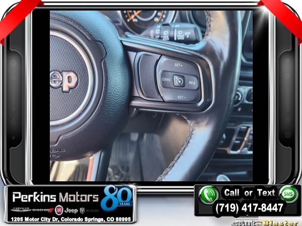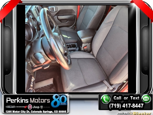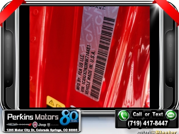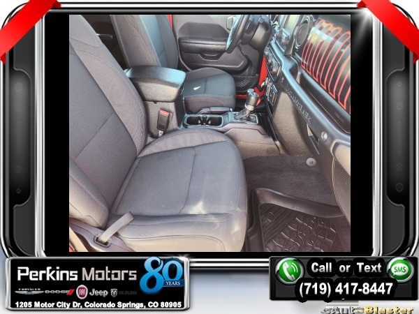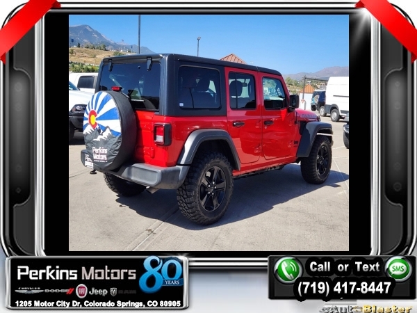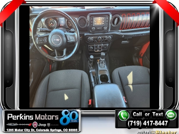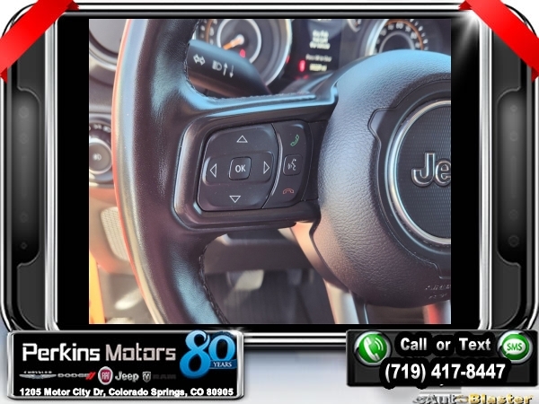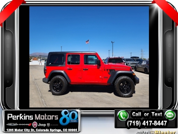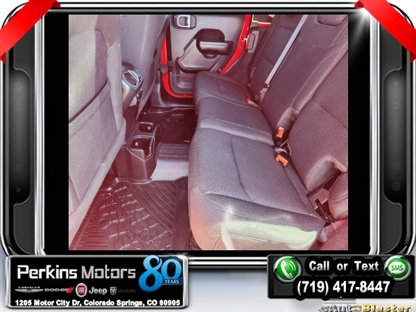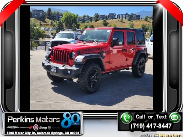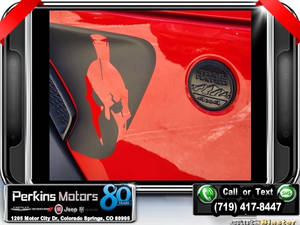 Firecracker Red Clearcoat 4WD 2.0L I4 DOHC 8-Speed Automatic<br><br>Automatic Headlamps, Black 3-Piece Hard Top, Black Interior Accents, Black Trail Rated Badge, Body Color Grille w/Gloss Black Rings, Cold Weather Group, Deep Tint Sunscreen Windows, Freedom Panel Storage Bag, Front 1-Touch Down Power Windows, Heated Front Seats, Heated Steering Wheel, Heavy Duty Suspension w/Gas Shocks, Leather Wrapped Steering Wheel, Matte Black Jeep Badge, MOPAR Hardtop Headliner, No Soft Top, Power Heated Mirrors, Quick Order Package 22L Altitude, Rear Window Defroster, Rear Window Wiper/Washer, Remote Keyless Entry, Security Alarm, Speed Sensitive Power Locks, Sun Visors w/Illuminated Vanity Mirrors, Wheels: 18 x 7.5 Gloss Black Aluminum, Wizard Black Instrument Panel Bezels, Wrangler Decal.<br><br><br>CARFAX One-Owner. Clean CARFAX.<br><br>Check us out at www.perkinsmotors.com to see our specials! Since opening our doors in 1944, we’ve been proud to serve Colorado Springs, CO, and the surrounding areas of Pueblo, Castle Rock and Denver, CO. Throughout this time of being family owned for 80 years, we’ve maintained a firm commitment to our customers: to offer a wide selection of New Chrysler, Dodge, Fiat, Jeep, and Ram vehicles and quality pre-owned vehicles, and provide a quick, no-hassle car-buying process that ensures everyone drives off the lot satisfied with their purchase.<br><br><br>Cold Weather Group (Heated Front Seats and Heated Steering Wheel), Quick Order Package 22L Altitude (Automatic Headlamps, Black 3-Piece Hard Top, Black Interior Accents, Black Trail Rated Badge, Body Color Grille w/Gloss Black Rings, Deep Tint Sunscreen Windows, Freedom Panel Storage Bag, Front 1-Touch Down Power Windows, Heavy Duty Suspension w/Gas Shocks, Leather Wrapped Steering Wheel, Matte Black Jeep Badge, MOPAR Hardtop Headliner, No Soft Top, Power Heated Mirrors, Rear Window Defroster, Rear Window Wiper/Washer, Remote Keyless Entry, Security Alarm, Speed Sensitive Power Locks, Sun Visors w/Illuminated Vanity Mirrors, Wheels: 18 x 7.5 Gloss Black Aluminum, Wizard Black Instrument Panel Bezels, and Wrangler Decal), 3.45 Rear Axle Ratio, 4-Wheel Disc Brakes, 8 Speakers, ABS brakes, Air Conditioning, AM/FM radio, Aux Battery, Brake assist, Cloth Low-Back Bucket Seats, Compass, Continental TPM Sensor (DISC), Cruise Control, Delay-off headlights, Driver door bin, Driver vanity mirror, Dual front impact airbags, Dual front side impact airbags, Electronic Stability Control, Front anti-roll bar, Front Bucket Seats, Front Center Armrest w/Storage, Front fog lights, Front reading lights, Integrated roll-over protection, Low tire pressure warning, Non-Lock Fuel Cap w/o Discriminator, Normal Duty Suspension, Occupant sensing airbag, Outside temperature display, ParkView Rear Back-Up Camera, Passenger door bin, Passenger vanity mirror, Power steering, Radio data system, Radio: Uconnect 3 w/5 Display, Rear anti-roll bar, Rear reading lights, Selec-Speed Control, Selec-Speed Control (DISC), Split folding rear seat, Steering wheel mounted audio controls, Stop-Start Dual Battery System, Tachometer, Telescoping steering wheel, Tilt steering wheel, Traction control, Trip computer, Variably intermittent wipers, and Wheels: 17 x 7.5 Black Steel Styled.