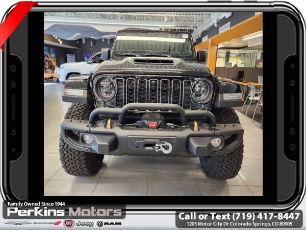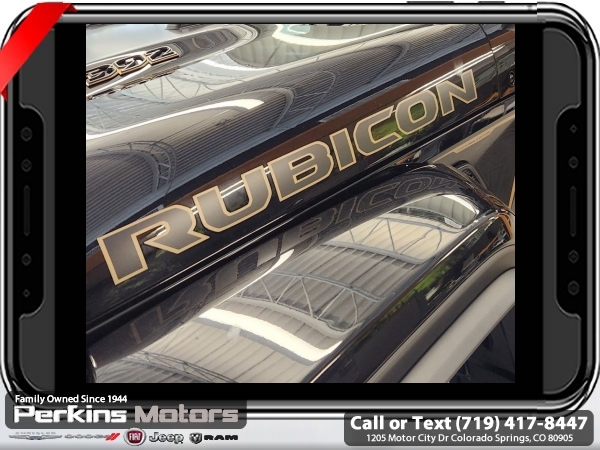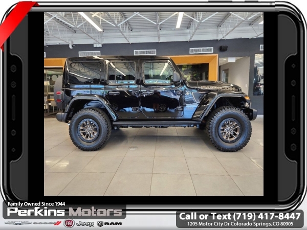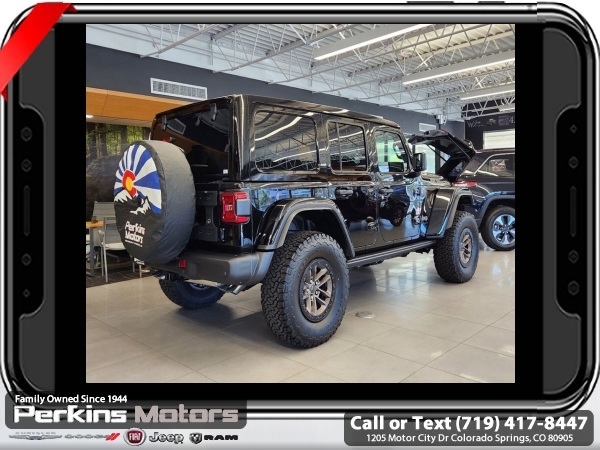 Factory MSRP: $106,480 $8,500 off MSRP! Black Clearcoat 2024 Jeep Wrangler Rubicon 392 4WD 8-Speed Automatic SRT HEMI 6.4L V8 MDS<br><br>Check us out at www.perkinsmotors.com to see our specials! Since opening our doors in 1944, we’ve been proud to serve Colorado Springs, CO, and the surrounding areas of Pueblo, Castle Rock and Denver, CO. Throughout this time of being family owned for 80 years, we’ve maintained a firm commitment to our customers: to offer a wide selection of New Chrysler, Dodge, Fiat, Jeep, and Ram vehicles and quality pre-owned vehicles, and provide a quick, no-hassle car-buying process that ensures everyone drives off the lot satisfied with their purchase.<br><br>Quick Order Package 27J Rubicon 392 Final Edition (392 Final Edition Center Hood Decal, 392 Final Edition Fender Vent Decal, 392 Final Edition Nappa Leather Seat, 392 Final Edition Shifter Medallion, 392 Final Edition Swing Gate Plaque, 392 Suspension, Matte Reverse Net Interior Accents, MOPAR Fold-Out Table, MOPAR Grille Guard Triple Loop, MOPAR Tool Kit JPP/Jeep, Rubicon 392 Final Edition, and Wheels: 17 x 8.0 Bronze Beadlock Capable), 35 Tire Rubicon 392 Suspension (DISC), 4-Wheel Disc Brakes, 4.56 Rear Axle Ratio, 9 Speakers, ABS brakes, Air Conditioning, Alloy wheels, AM/FM radio: SiriusXM with 360L, Apple CarPlay/Android Auto, Auto High-beam Headlights, Auto-dimming Rear-View mirror, Automatic temperature control, Brake assist, Compass, Convertible HardTop, Cruise Control, Delay-off headlights, Driver door bin, Driver vanity mirror, Dual front impact airbags, Dual front side impact airbags, Electronic Stability Control, Emergency communication system: Jeep Connect, Freedom Panel Storage Bag, Front anti-roll bar, Front Bucket Seats, Front Center Armrest w/Storage, Front dual zone A/C, Front fog lights, Front License Plate Bracket, Front reading lights, Fully automatic headlights, Garage door transmitter, Glass rear window, Heated door mirrors, Heated front seats, Heated steering wheel, Illuminated entry, Integrated roll-over protection, Leather Shift Knob, Leather steering wheel, Low tire pressure warning, MOPAR All-Weather Floor Mats (DISC), Nappa Leather Seats (DISC), Navigation System, Occupant sensing airbag, Outside temperature display, Overhead airbag, Panic alarm, ParkView Rear Back-Up Camera, Passenger door bin, Passenger vanity mirror, Power door mirrors, Power driver seat, Power passenger seat, Power steering, Power Top Quarter Window Storage Bag, Power windows, Radio data system, Radio: Uconnect 5 Nav w/12.3 Display, Rear anti-roll bar, Rear reading lights, Rear seat center armrest, Rear Window Defroster, Rear window defroster, Rear window wiper, Rear Window Wiper/Washer, Remote keyless entry, Removable Rear Quarter Windows, Security system, Sky 1-Touch Power Top, Split folding rear seat, Steering wheel mounted audio controls, Tachometer, Telescoping steering wheel, Tilt steering wheel, Traction control, Trip computer, Variably intermittent wipers, Voltmeter, Warn Winch (DISC), and Wheels: 17 x 8 Mach/Bronze Beadlock Cap (DISC) Sale price includes all manufacture's incentives and dealer discounts. Sale price not available on lease or compatible with special APR. $1000 - 2024 Bonus Cash . Exp. 03/03/2025 $500 - 2024 National Presidents Day Bonus Cash . Exp. 03/03/2025