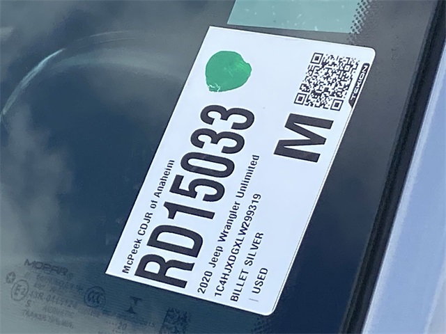 Certified. Clean CARFAX. CARFAX One-Owner. INTERIOR & EXTERIOR PROFESSIONALLY DETAILED FOR DELIVERY, MCPEEK CHRYSLER DODGE JEEP RAM FAMILY OWNED AND OPERATED SINCE 1961 !!!!!.Billet Silver Metallic Clearcoat 2020 Jeep Wrangler Unlimited Sport S 4WD 8-Speed AutomaticFCA US LLC Certified Pre-Owned Details: * Powertrain Limited Warranty: 84 Month/100,000 Mile (whichever comes first) from original in-service date * Roadside Assistance * Warranty Deductible: $100 * Limited Warranty: 3 Month/3,000 Mile (whichever comes first) after new car warranty expires or from certified purchase date * Vehicle History * Includes First Day Rental, Car Rental Allowance, and Trip Interruption Benefits. SiriusXM 3 month trial subscription * 125 Point Inspection * Transferable WarrantyReceive Free lube and oil filter changes for up to 45,000 miles for 3 years!!! McPeek's Dodge of Anahiem 1221 S. Auto Center Drive Anahiem, CA 92806 714-262-4902.