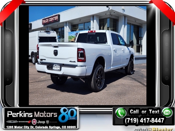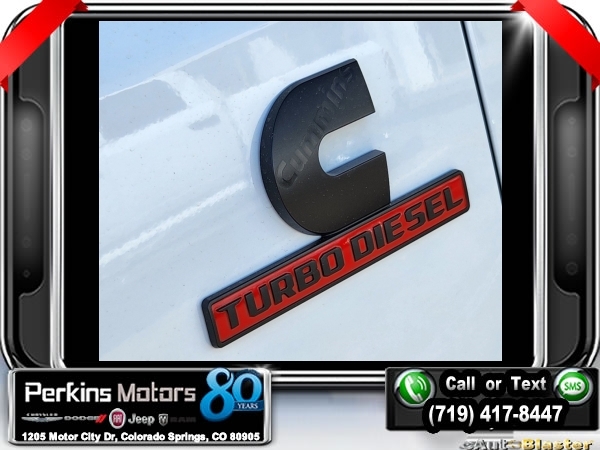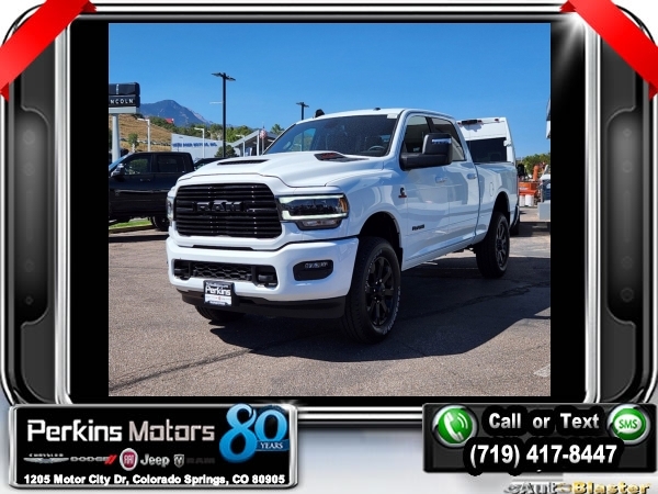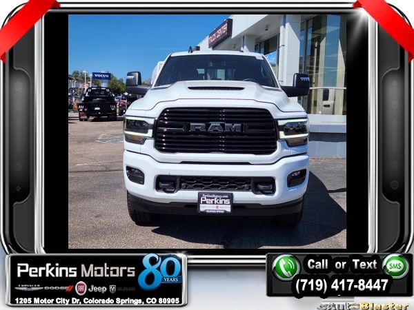 Factory MSRP: $84,030 $12,500 off MSRP! Bright White Clearcoat 2024 Ram 2500 Laramie 4WD 6-Speed Automatic Cummins 6.7L I6 Turbodiesel<br><br>Check us out at www.perkinsmotors.com to see our specials! Since opening our doors in 1944, we’ve been proud to serve Colorado Springs, CO, and the surrounding areas of Pueblo, Castle Rock and Denver, CO. Throughout this time of being family owned for 80 years, we’ve maintained a firm commitment to our customers: to offer a wide selection of New Chrysler, Dodge, Fiat, Jeep, and Ram vehicles and quality pre-owned vehicles, and provide a quick, no-hassle car-buying process that ensures everyone drives off the lot satisfied with their purchase.<br><br>Laramie Level B Equipment Group (12 Touchscreen Display, 17 Speaker harman/kardon Premium Sound, 2nd Row In Floor Storage Bins, 4G LTE Wi-Fi Hot Spot, Alexa Built-In, Apple CarPlay, Auto Adjust In Reverse Exterior Mirrors, Auto Dim Exterior Mirror, Auto High Beam Headlamp Control, Auto Power-Folding Mirrors, Auto-Dimming Exterior Passenger Mirror, Blind Spot & Cross Path Detection, Center Hub, Chrome Exterior Mirrors, Connected Travel & Traffic Services, Connectivity - US/Canada, Disassociated Touchscreen Display, Exterior Mirrors Courtesy Lamps, Exterior Mirrors w/Heating Element, Exterior Mirrors w/Memory, Exterior Mirrors w/Supplemental Signals, Foam Bottle Insert (Door Trim Panel), For Details, Visit DriveUconnect.com, For More Info, Call 800-643-2112, Forward & Reverse Utility Lights, Front LED Fog Lamps, Global Telematics Box Module (TBM), Google Android Auto, GPS Antenna Input, GPS Navigation, HD Radio, Heated Second Row Seats, Integrated Voice Command w/Bluetooth, LED Reflector Headlamps, LED Tail Lamps, Mirror Running Lights, Off-Road Information Pages, ParkSense Front/Rear Park Assist System, Power Adjust Mirrors, Power Adjustable Convex Aux Mirrors, Power Adjustable Pedals w/Memory, Power Heated Fold Telescopic Mirrors w/Memory, Power Telescoping Mirrors, Radio: Uconnect 5 Nav w/12.0 Display, Rain Sensitive Windshield Wipers, Rear Power Sliding Window, Rear Window Defroster, Remote Tailgate Release, Selectable Tire Fill Alert, SiriusXM Radio Service, SiriusXM w/360L, Trailer Tow Pages, and Wheels: 18 x 8.0 Polished Aluminum), Night Edition (Black Exterior Truck Badging, Black Headlamp Bezels, Black Interior Accents, Black Ram Head Tailgate Badge, Black Tail Lamp Bezels, Black Wheel Center Hub, Body Color Grille Surround, Gloss Black Grille Billets/Accents, Sport Performance Hood, and Wheels: 20 x 8.0 Black Painted Aluminum), Quick Order Package 2HH Laramie, 10 Speakers, 115V Auxiliary Rear Power Outlet, 2 Way Rear Headrest Seat, 220 Amp Alternator, 3.73 Axle Ratio, 4 Way Front Headrests, 4-Wheel Disc Brakes, ABS brakes, Active Noise Control System, Air Conditioning, Alloy wheels, AM/FM radio: SiriusXM with 360L, Anti-Spin Differential Rear Axle, Apple CarPlay/Android Auto, Automatic temperature control, Brake assist, Bumpers: body-color, Compass, Cruise Control, Delay-off headlights, Driver door bin, Driver vanity mirror, Dual front impact airbags, Dual front side impact airbags, Electronic Stability Control, Electronically Controlled Throttle, Front anti-roll bar, Front Center Armrest w/Storage, Front dual zone A/C, Front License Plate Bracket, Front reading lights, Front Seat Back Map Pockets, Fully automatic headlights, Garage door transmitter, Heated door mirrors, Heated Front Seats, Heated front seats, Heated Steering Wheel, Heated steering wheel, Illuminated entry, Leather steering wheel, Leather Trim 40/20/40 Bench Seat, Low tire pressure warning, Manufacturer's Statement of Origin, Navigation System, Occupant sensing airbag, Outside temperature display, Overhead airbag, Overhead console, Panic alarm, ParkView Rear Back-Up Camera, Passenger door Sale price includes all manufacture's incentives and dealer discounts. Sale price not available on lease or compatible with special APR. $1000 - 2024 Bonus Cash . Exp. 0