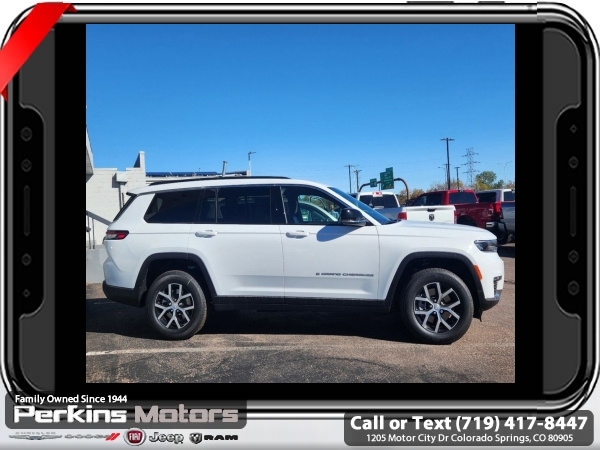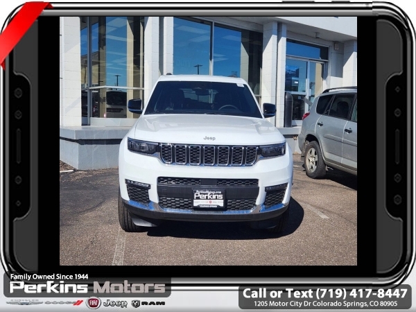 Factory MSRP: $48,700 $7,000 off MSRP! Priced below KBB Fair Purchase Price! Bright White Clearcoat 2025 Jeep Grand Cherokee L Limited 4WD 8-Speed Automatic 3.6L V6 24V VVT<br><br>Check us out at www.perkinsmotors.com to see our specials! Since opening our doors in 1944, we’ve been proud to serve Colorado Springs, CO, and the surrounding areas of Pueblo, Castle Rock and Denver, CO. Throughout this time of being family owned for 80 years, we’ve maintained a firm commitment to our customers: to offer a wide selection of New Chrysler, Dodge, Fiat, Jeep, and Ram vehicles and quality pre-owned vehicles, and provide a quick, no-hassle car-buying process that ensures everyone drives off the lot satisfied with their purchase.<br><br>Quick Order Package 23E (DISC), 3.45 Rear Axle Ratio, 3rd row seats: split-bench, 4-Wheel Disc Brakes, 6 Speakers, ABS brakes, Active Noise Control System, Air Conditioning, Alloy wheels, AM/FM radio: SiriusXM with 360L, Anti-whiplash front head restraints, Audio memory, Auto High-beam Headlights, Automatic temperature control, Brake assist, Bumpers: body-color, Capri Leatherette Seats, Compass, Cruise Control, Delay-off headlights, Driver door bin, Driver vanity mirror, Dual front impact airbags, Dual front side impact airbags, Electronic Stability Control, Emergency communication system, Four wheel independent suspension, Front anti-roll bar, Front Bucket Seats, Front Center Armrest w/Storage, Front dual zone A/C, Front fog lights, Front License Plate Bracket, Front reading lights, Fully automatic headlights, Garage door transmitter, Heated door mirrors, Heated front seats, Heated rear seats, Heated steering wheel, Illuminated entry, Knee airbag, Low tire pressure warning, Manual Fold Seatbacks, Memory seat, Model Year Tracking, Navigation System, Normal Duty Suspension, Occupant sensing airbag, Outside temperature display, Overhead airbag, Overhead console, Panic alarm, ParkView Rear Back-Up Camera, Passenger door bin, Passenger vanity mirror, Power door mirrors, Power driver seat, Power Liftgate, Power passenger seat, Power steering, Power windows, Radio data system, Radio: Uconnect 5 Nav w/10.1 Display, Rear air conditioning, Rear anti-roll bar, Rear reading lights, Rear window defroster, Rear window wiper, Reclining 3rd row seat, Remote keyless entry, Security system, Speed-Sensitive Wipers, Split folding rear seat, Spoiler, Steering wheel mounted audio controls, Tachometer, Telescoping steering wheel, Tilt steering wheel, Traction control, Trip computer, Turn signal indicator mirrors, Variably intermittent wipers, Voltmeter, and Wheels: 18 x 8.0 Polished/Painted Aluminum. Sale price includes all manufacture's incentives and dealer discounts. Sale price not available on lease or compatible with special APR. $1000 - 2025 National Retail Consumer Cash. Exp. 04/30/2025 $1000 - 2025 West BC SFS Bonus Cash . Exp. 04/30/2025 $1500 - 2025 National Jeep Celebration Event Retail Bonus Cash . Exp. 04/30/2025