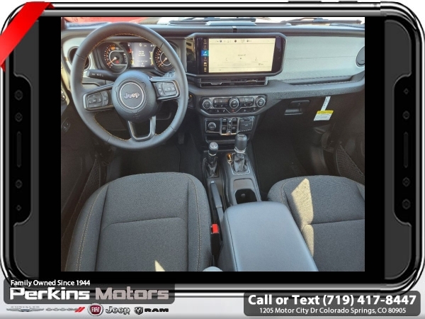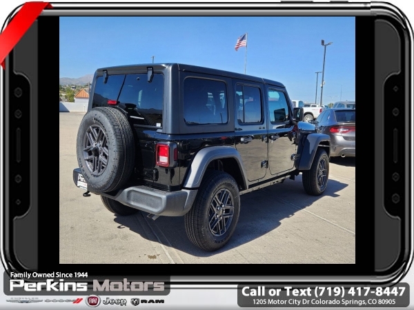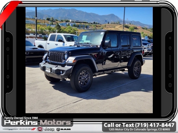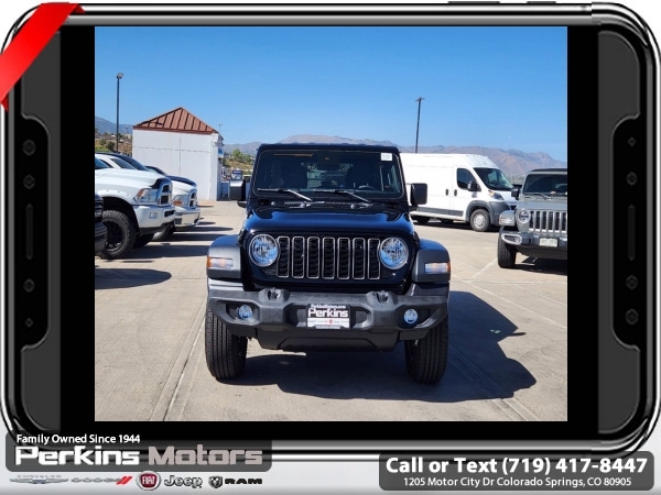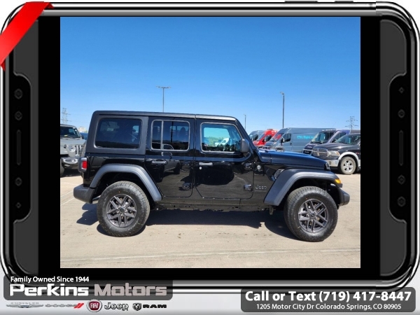 Factory MSRP: $50,775 $10,154 off MSRP! Black Clearcoat 2024 Jeep Wrangler Sport S 4WD 8-Speed Automatic 3.6L V6 24V VVT<br><br>Check us out at www.perkinsmotors.com to see our specials! Since opening our doors in 1944, we’ve been proud to serve Colorado Springs, CO, and the surrounding areas of Pueblo, Castle Rock and Denver, CO. Throughout this time of being family owned for 80 years, we’ve maintained a firm commitment to our customers: to offer a wide selection of New Chrysler, Dodge, Fiat, Jeep, and Ram vehicles and quality pre-owned vehicles, and provide a quick, no-hassle car-buying process that ensures everyone drives off the lot satisfied with their purchase.<br><br>Convenience Group (2-Door Passive Entry, Front Door Locks, Air Conditioning w/Auto Temperature Control, Air Filtering, Cluster 7.0 TFT Color Display, Emergency/Assistance Call, Heated Front Seats, Heated Steering Wheel, Remote Start System, and Universal Garage Door Opener), Quick Order Package 24S Sport S (Advanced Brake Assist, Automatic Headlamps, Corning Gorilla Glass, Deep Tint Sunscreen Windows, Enhanced Adaptive Cruise Control, Front 1-Touch Down Power Windows, Full Speed Forward Collision Warning Plus, Power Heated Mirrors, Premium Wrapped Steering Wheel, Remote Keyless Entry, Security Alarm, Speed Sensitive Power Locks, Sport S, Sun Visors w/Illuminated Vanity Mirrors, and Wheels: 17 x 7.5 Gray), 110 MPH Vehicle Max Speed Calibration, 3.45 Overall Top Gear Ratio, 4-Wheel Disc Brakes, 8 Speakers, ABS brakes, Air Conditioning, AM/FM radio, Apple CarPlay/Android Auto, Aux Battery, Black 3-Piece Hard Top, Brake assist, Cloth Low-Back Bucket Seats, Compass, Cruise Control, Delay-off headlights, Driver door bin, Driver vanity mirror, Dual front impact airbags, Dual front side impact airbags, Electronic Stability Control, Freedom Panel Storage Bag, Front anti-roll bar, Front Bucket Seats, Front Center Armrest w/Storage, Front fog lights, Front reading lights, Integrated roll-over protection, Low tire pressure warning, No Soft Top, Non-Lock Fuel Cap w/o Discriminator, Normal Duty Suspension, Occupant sensing airbag, Outside temperature display, Overhead airbag, ParkView Rear Back-Up Camera, Passenger door bin, Passenger vanity mirror, Power steering, Radio data system, Radio: Uconnect 5 w/12.3 Display, Rear anti-roll bar, Rear reading lights, Rear Window Defroster, Rear Window Wiper/Washer, Split folding rear seat, Steering wheel mounted audio controls, Stop-Start Dual Battery System, Tachometer, Telescoping steering wheel, Tilt steering wheel, Traction control, Trip computer, Variably intermittent wipers, and Wheels: 17 x 7.5 Black Steel Styled. Sale price includes all manufacture's incentives and dealer discounts. Sale price not available on lease or compatible with special APR. 10% Msrp - 2024 National Standalone 10% Below MSRP (1/B/L/E). Exp. 04/30/2025