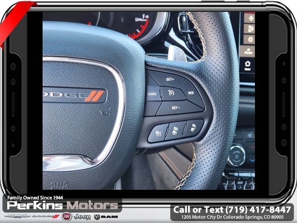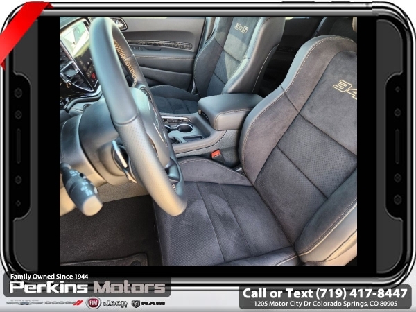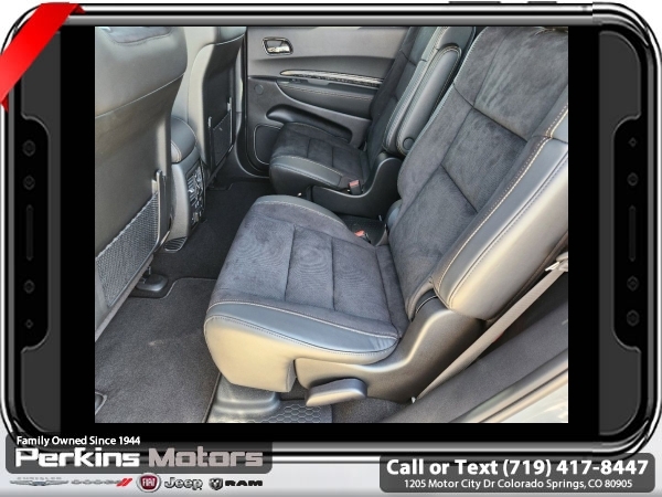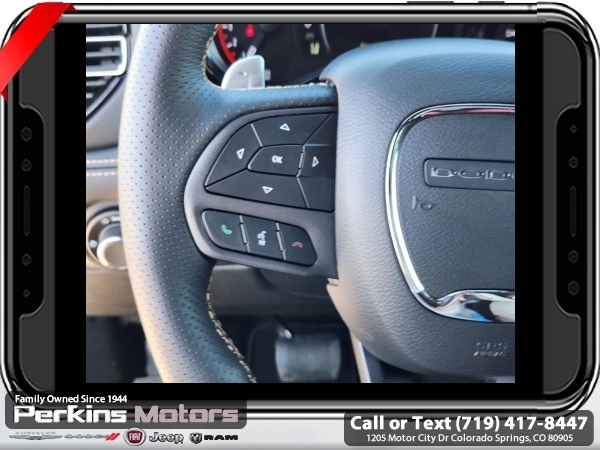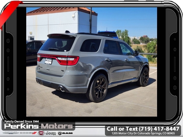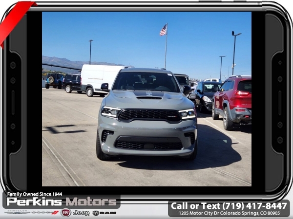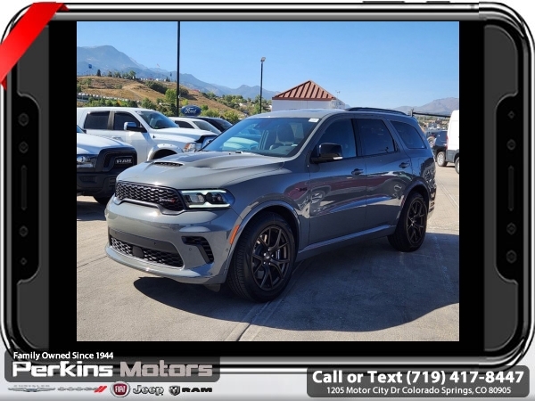 Factory MSRP: $67,960 $4,500 off MSRP! Priced below KBB Fair Purchase Price! Destroyer Gray Clearcoat 2025 Dodge Durango R/T AWD 8-Speed Automatic HEMI 5.7L V8 Multi Displacement VVT<br>AWD.<br>Check us out at www.perkinsmotors.com to see our specials! Since opening our doors in 1944, we’ve been proud to serve Colorado Springs, CO, and the surrounding areas of Pueblo, Castle Rock and Denver, CO. Throughout this time of being family owned for 80 years, we’ve maintained a firm commitment to our customers: to offer a wide selection of New Chrysler, Dodge, Fiat, Jeep, and Ram vehicles and quality pre-owned vehicles, and provide a quick, no-hassle car-buying process that ensures everyone drives off the lot satisfied with their purchase.<br><br>Quick Order Package 22R R/T 20th Anniversary Premium (#6 Seat Foam Cushion, 115V Auxiliary Power Outlet, 19 harman/kardon Amplified Speakers w/Subwoofer, 7 & 4 Pin Wiring Harness, Adaptive Cruise Control w/Stop, Advanced Brake Assist, Auto-Dimming Exterior Driver Mirror, Black Brake Calipers, Black Roof Rails, Blind Spot w/Trailer Detection, Brembo Brakes, Bright Cargo Area Scuff Pads, Class IV Receiver Hitch, Exterior Mirrors w/Heating Element, Exterior Mirrors w/Memory, Exterior Mirrors w/Supplemental Signals, Gloss Black Exterior Mirrors, Heated Second Row Seats, HEMI Hood Graphic, LED Auxiliary Low Beam & Turn Signal, Power 8-Way Driver Memory 8-Way Passenger Seats, Power Driver/Passenger 4-Way Lumbar Adjust, Power Tilt & Telescopic Steering Column, Radford Track Experience, and Trailer Brake Control), Tow 'N Go Package (145 mph Maximum Speed Calibration, Active Noise Control System, Body Color Upper & Lower Rear Fascia, Drive Modes - Sport/Track/Tow/Snow, Electronic Limited Slip Differential Rear Axle, High Performance Exhaust, and Quadra-Trac Active on Demand 4WD), AWD, 3.09 Rear Axle Ratio, 3rd row seats: split-bench, 4-Wheel Disc Brakes, 9 Speakers, ABS brakes, Air Conditioning, Alloy wheels, AM/FM radio: SiriusXM w/360L, Anti-whiplash front head restraints, Apple CarPlay/Android Auto, Auto-dimming Rear-View mirror, Auto-leveling suspension, Automatic temperature control, Brake assist, Bumpers: body-color, Cloth Bucket Seats w/Shift Insert, Compass, Cruise Control, Delay-off headlights, Driver door bin, Driver vanity mirror, Dual front impact airbags, Dual front side impact airbags, Electronic Stability Control, Emergency communication system: Dodge Connect, Four wheel independent suspension, Front anti-roll bar, Front Bucket Seats, Front Center Armrest w/Storage, Front dual zone A/C, Front License Plate Bracket, Front reading lights, Fully automatic headlights, Garage door transmitter, Heated door mirrors, Heated front seats, Heated steering wheel, Illuminated entry, Knee airbag, Leather steering wheel, Low tire pressure warning, Navigation System, Occupant sensing airbag, Outside temperature display, Overhead airbag, Overhead console, Panic alarm, ParkView Rear Back-Up Camera, Passenger door bin, Passenger vanity mirror, Power door mirrors, Power driver seat, Power Liftgate, Power steering, Power windows, Radio data system, Radio: Uconnect 5 Nav w/10.1 Display, Rain sensing wipers, Rear air conditioning, Rear anti-roll bar, Rear Load Leveling Suspension, Rear reading lights, Rear seat center armrest, Rear window defroster, Rear window wiper, Red Accent Stitching, Remote keyless entry, Security system, Speed-sensing steering, Speed-Sensitive Wipers, Split folding rear seat, Spoiler, Sport steering wheel, Steering wheel mounted audio controls, Tachometer, Telescoping steering wheel, Tilt steering wheel, Traction control, Trip computer, Variably intermittent wipers, Voltmeter, and Wheels: 20 x 8.0 Fine Silver. Sale price includes all manufacture's incentives and dealer discounts. Sale price not available on lease or compatible with special APR. $1000 - 2025 National Retail Consumer Cash. Exp. 03/31/2025